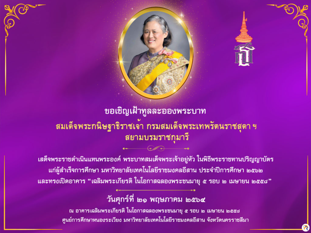 ข่าวประชาสัมพันธ์ขอเชิญทุกท่านเฝ้าทูลละอองพระบาท สมเด็จพระกนิษฐาธิราชเจ้า กรมสมเด็จพระเทพรัตนราชสุดาฯ สยามบรมราชกุมารี ในพิธีพระราชทานปริญญาบัตร ประจำปีการศึกษา 2562 วันที่ 21พฤษภาคม 2564 / กรกฎาคม 6, 2021 คณะอุตสาหกรรมและเทคโ