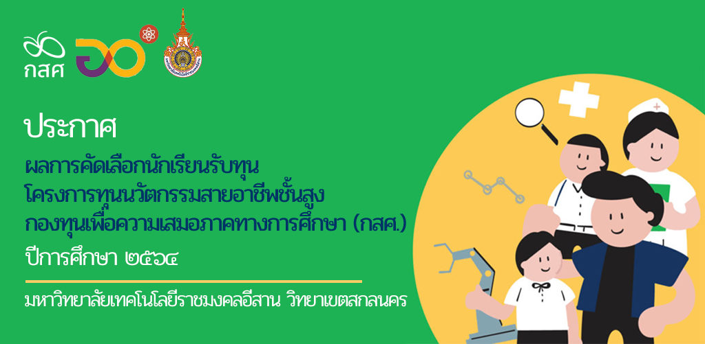 ข่าวประชาสัมพันธ์ประกาศ มหาวิทยาลัยเทคโนโลยีราชมงคลอีสาน วิทยาเขตสกลนคร เรื่อง ผลการคัดเลือกนักเรียนนักศึกษารับทุน โครงการทุนนวัตกรรมสายอาชีพชั้นสูง ปีการศึกษา 2564 / เมษายน 30, 2021 ตามที่ มหาวิทยาลัยเท