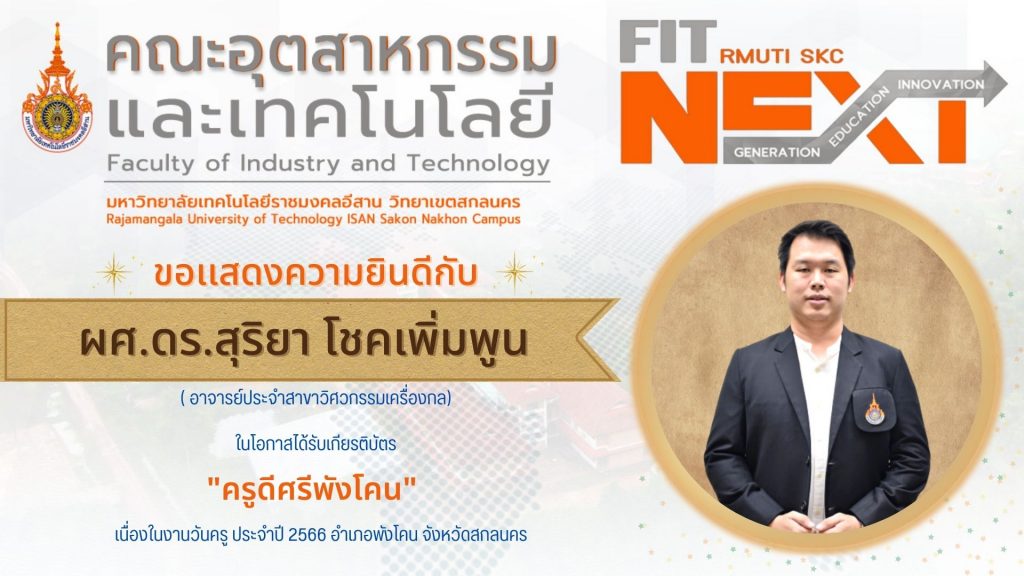 ผลงานอาจารย์ บุคลากรขอแสดงความยินดีกับ ผู้ช่วยศาสตราจารย์ ดร.สุริยา โชคเพิ่มพูล ในโอกาสเข้ารับเกียรติบัตร “ครูดีศรีพังโคน” วันครู ประจำปี 2566 / มกราคม 17, 2023 ขอแสดงความยินดี ผู้ช