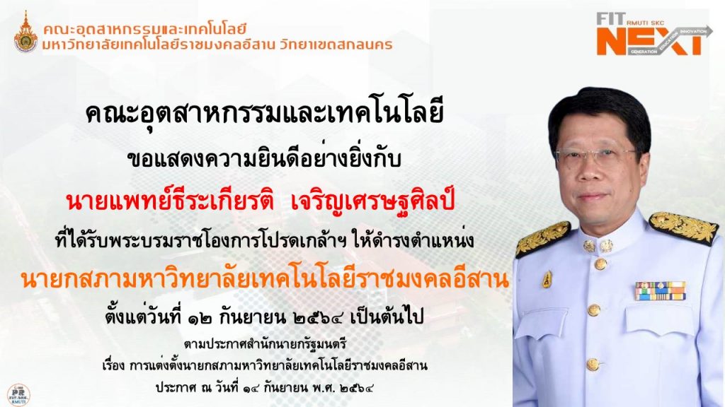 ข่าวประชาสัมพันธ์ขอแสดงความยินดีอย่างยิ่งกับ นพ.ธีระเกียรติ เจริญเศรษฐศิลป์ ที่ได้รับพระบรมราชโองการโปรดเกล้าโปรดกระหม่อมแต่งตั้งให้ดำรงตำแหน่ง “นายกสภามหาวิทยาลัยเทคโนโลยีราชมงคลอีสาน” / กันยายน 16, 2021 คณะอุตสาหกรรมและเทคโ