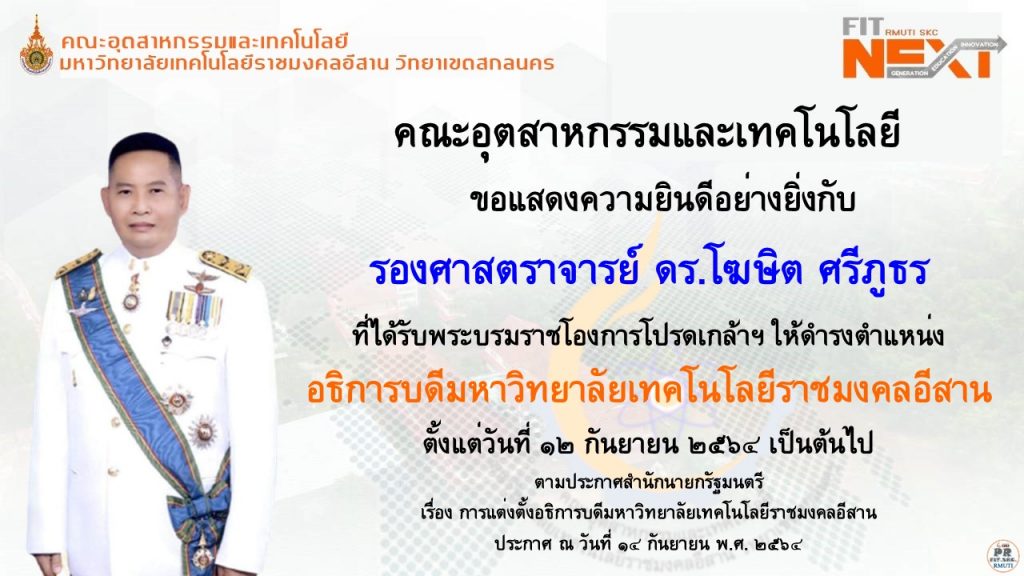 ข่าวประชาสัมพันธ์ขอแสดงความยินดีอย่างยิ่งกับท่าน รศ. ดร.โฆษิต ศรีภูธร ที่ได้รับพระบรมราชโองการโปรดเกล้าโปรดกระหม่อมแต่งตั้งให้ดำรงตำแหน่ง “อธิการบดีมหาวิทยาลัยเทคโนโลยีราชมงคลอีสาน” / กันยายน 16, 2021 คณะอุตสาหกรรมและเทคโ