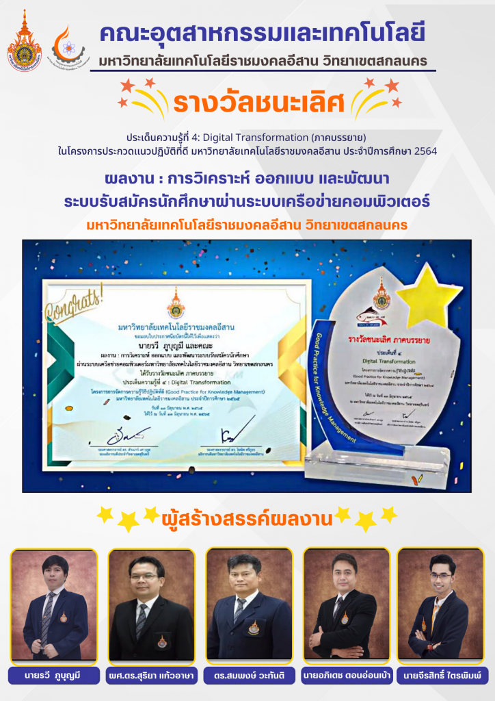 ขอแสดงความยินดีกับ นายรวี ภูบุญมี พร้อมคณะ คว้ารางวัลชนะเลิศ ประเด็นความรู้ที่ 4: Digital Transformation (ภาคบรรยาย) ชื่อผลงาน การวิเคราะห์ ออกแบบ และพัฒนาระบบรับสมัครนักศึกษาผ่านระบบเครือข่ายคอมพิวเตอร์