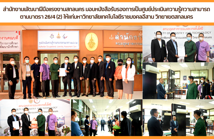 สำนักงานพัฒนาฝีมือเเรงงานสกลนคร มอบหนังสือรับรองการเป็นศูนย์ประเมินความรู้ความสามารถ ตามมาตรา 26/4 (2) ให้แก่มหาวิทยาลัยเทคโนโลยีราชมงคลอีสาน วิทยาเขตสกลนคร