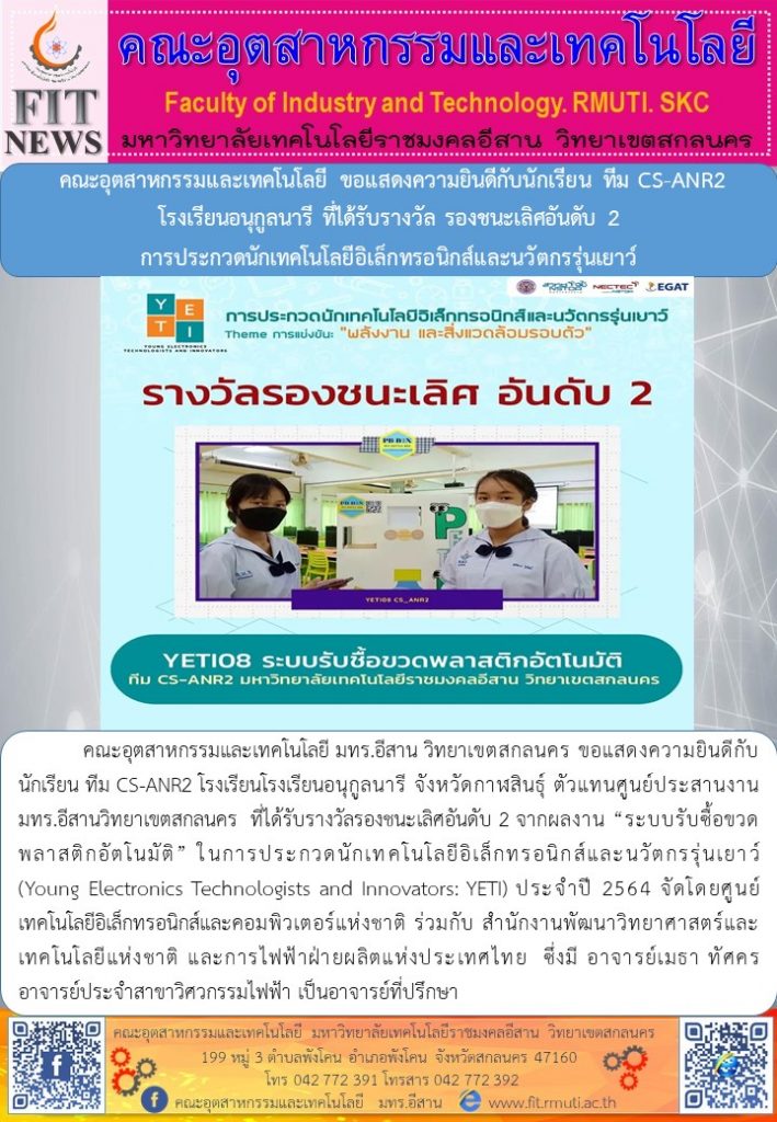 ทีม CS-ANR2 โรงเรียนโรงเรียนอนุกูลนารี จังหวัดกาฬสินธุ์ ตัวแทนศูนย์ประสานงาน  มทร.อีสานวิทยาเขตสกลนคร  ที่ได้รับรางวัลรองชนะเลิศอันดับ 2 จากผลงาน “ระบบรับซื้อขวดพลาสติกอัตโนมัติ” ในการประกวดนักเทคโนโลยีอิเล็กทรอนิกส์และนวัตกรรุ่นเยาว์