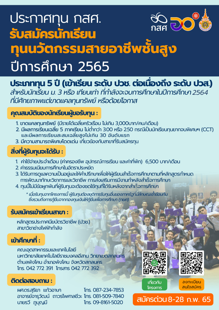 ข่าวประชาสัมพันธ์, ทุนการศึกษารับสมัครนักเรียน/นักศึกษา ที่ขาดแคนทุนทรัพย์หรือด้อยโอกาสแต่มีศักยภาพทางการศึกษา เพื่อคัดเลือกรับทุนการศึกษา “โครงการทุนนวัตกรรมสายอาชีพชั้นสูง ปีการศึกษา 2565” กองทุนเพื่อความเสมอภาคทางการศึกษา (กสศ.) / กุมภาพันธ์ 21, 2022 คณะอุตสาหกรรมและเทคโ