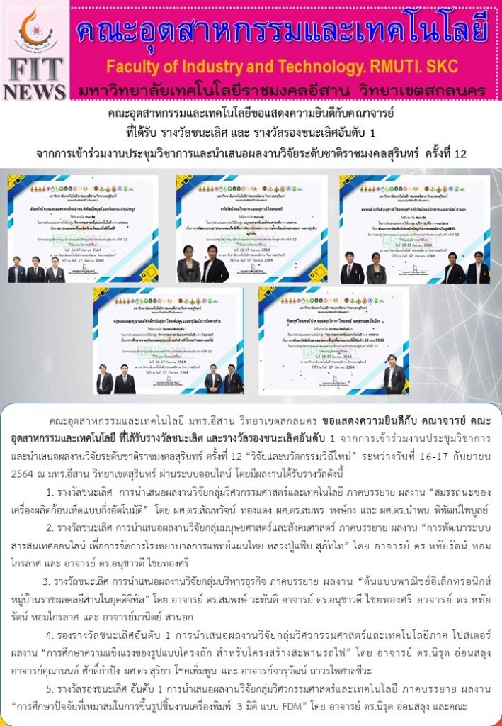 ข่าวประชาสัมพันธ์, ผลงานนักศึกษา, ผลงานอาจารย์ บุคลากรคณาจารย์ คณะอุตสาหกรรมและเทคโนโลยี รับรางวัลชนะเลิศ และรางวัลรองชนะเลิศอันดับ 1 จากการเข้าร่วมงานประชุมวิชาการและนำเสนอผลงานวิจัยระดับชาติราชมงคลสุรินทร์ ครั้งที่ 12 “วิจัยและนวัตกรรมวิถีใหม่” / กันยายน 18, 2021 &n