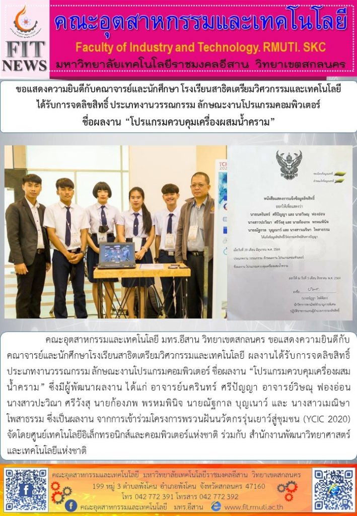 ข่าวประชาสัมพันธ์, ผลงานนักศึกษา, ผลงานอาจารย์ บุคลากรคณาจารย์และนักศึกษา โรงเรียนสาธิตเตรียมวิศวกรรมและเทคโนโลยี ได้รับการจดลิขสิทธิ์ ชื่อผลงาน “โปรแกรมควบคุมเครื่องผสมน้ำคราม” / กันยายน 19, 2021 คณะอุตส