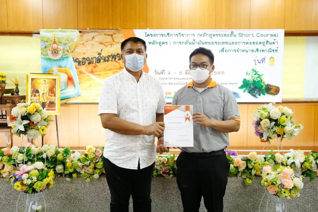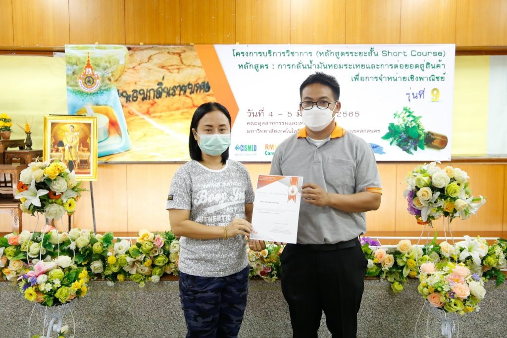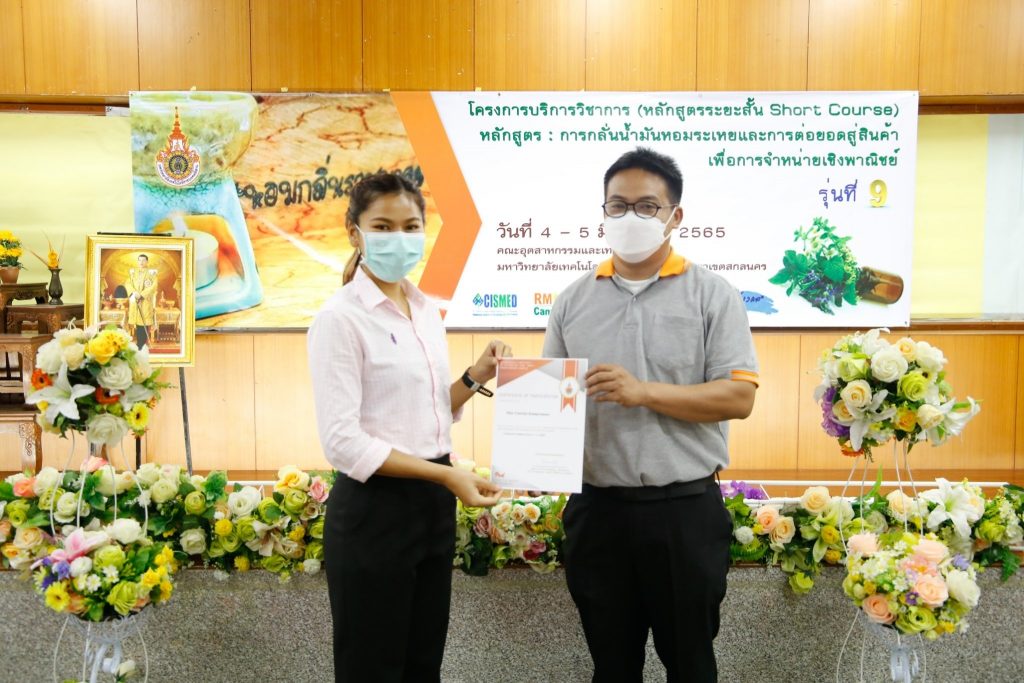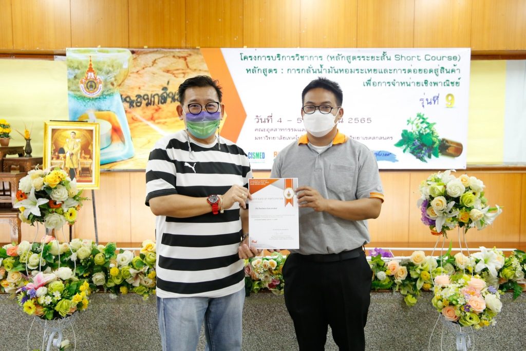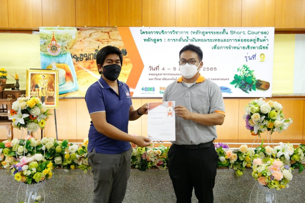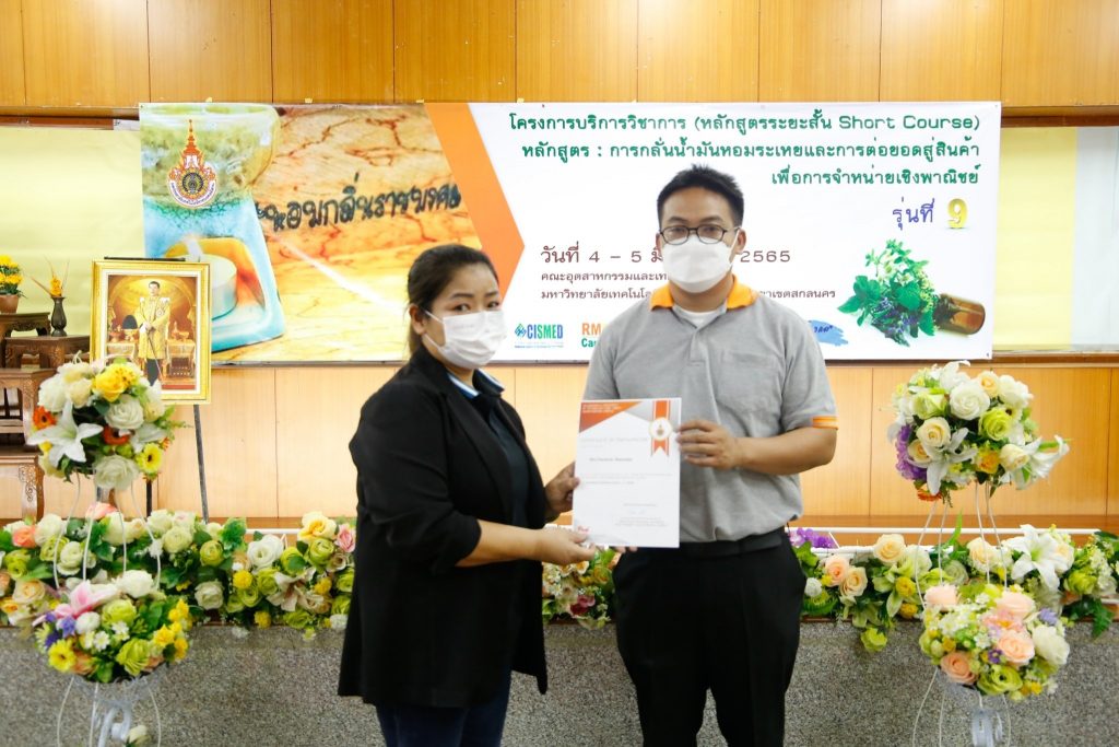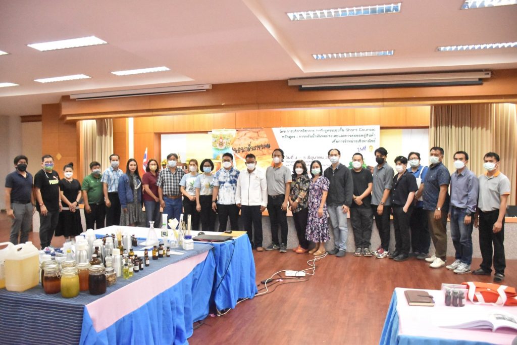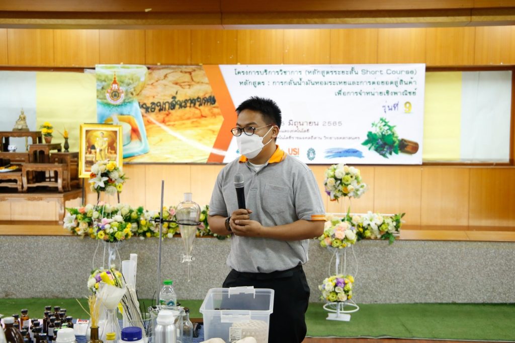 วันที่ 4 – 5 มิถุนายน 2565 คณะอุตสาหกรรมและเทคโนโลยี จัดโครงการบริการวิชาการ (หลักสูตรระยะสั้น Short Course) หลักสูตร : การกลั่นน้ำมันหอมระเหยและการต่อยอดสู่สินค้าเพื่อการจำหน่ายเชิงพาณิชย์ รุ่นที่ 9 สำหรับผู้ประกอบการ วิสาหกิจชุมชน กลุ่มเกษตรกรและบุคคลทั่วไป ณ ห้องประชุมค้ำคูณ 4 ชั้น 5 อาคารสำนักงานคณบดีคณะอุตสาหกรรมและเทคโนโลยี โดยมีวัตถุประสงค์เพื่อถ่ายทอดนวัตกรรมและเทคโนโลยีด้านการกลั่นน้ำมันหอมระเหยจากสมุนไพรอันเป็นการพัฒนาคุณภาพชีวิตของชุมชนให้เกิดความเข้มแข็งและยั่งยืน อีกทั้งเป็นการสร้างเครือข่ายผู้ประกอบการด้านสมุนไพรทั้งต้นน้ำ กลางน้ำ และปลายน้ำ ในการนี้ ผศ.น.สพ.ดร.ชเวง สารคล่อง รองอธิการบดีประจำวิทยาเขตสกลนคร ให้เกียรติเป็นประธานในพิธีเปิดโครงการในครั้งนี้