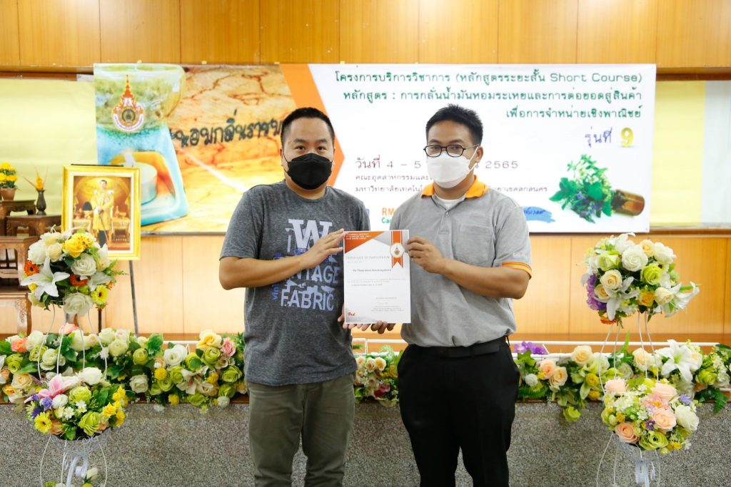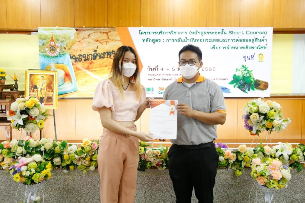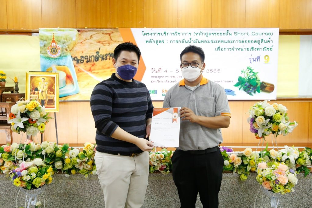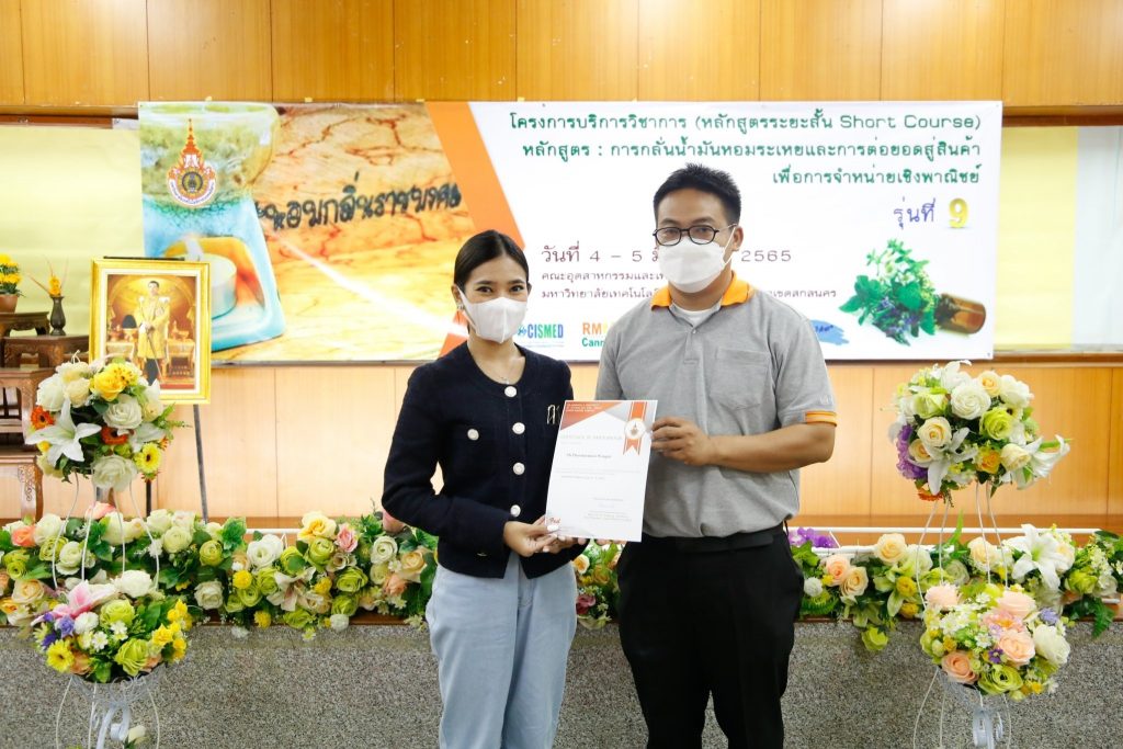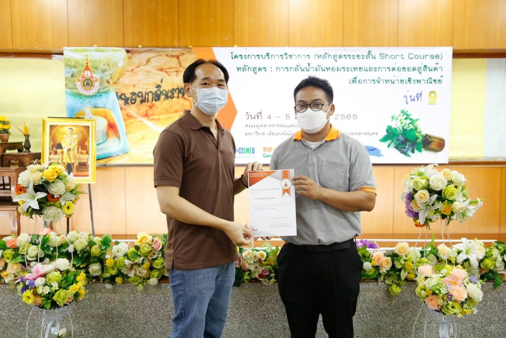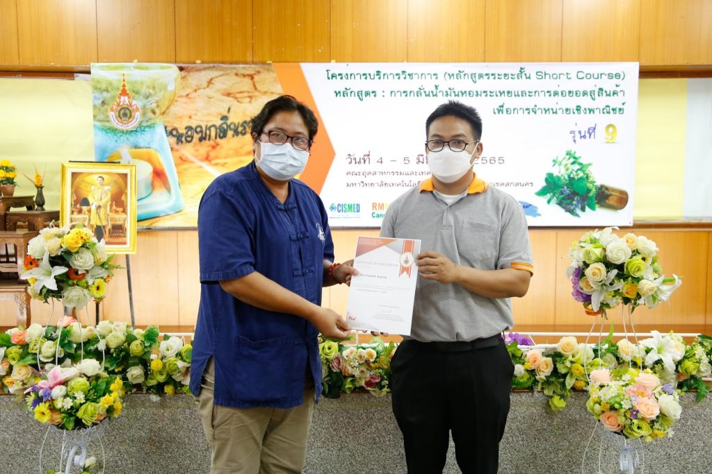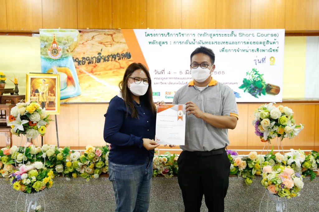 วันที่ 4 – 5 มิถุนายน 2565 คณะอุตสาหกรรมและเทคโนโลยี จัดโครงการบริการวิชาการ (หลักสูตรระยะสั้น Short Course) หลักสูตร : การกลั่นน้ำมันหอมระเหยและการต่อยอดสู่สินค้าเพื่อการจำหน่ายเชิงพาณิชย์ รุ่นที่ 9 สำหรับผู้ประกอบการ วิสาหกิจชุมชน กลุ่มเกษตรกรและบุคคลทั่วไป ณ ห้องประชุมค้ำคูณ 4 ชั้น 5 อาคารสำนักงานคณบดีคณะอุตสาหกรรมและเทคโนโลยี โดยมีวัตถุประสงค์เพื่อถ่ายทอดนวัตกรรมและเทคโนโลยีด้านการกลั่นน้ำมันหอมระเหยจากสมุนไพรอันเป็นการพัฒนาคุณภาพชีวิตของชุมชนให้เกิดความเข้มแข็งและยั่งยืน อีกทั้งเป็นการสร้างเครือข่ายผู้ประกอบการด้านสมุนไพรทั้งต้นน้ำ กลางน้ำ และปลายน้ำ ในการนี้ ผศ.น.สพ.ดร.ชเวง สารคล่อง รองอธิการบดีประจำวิทยาเขตสกลนคร ให้เกียรติเป็นประธานในพิธีเปิดโครงการในครั้งนี้
