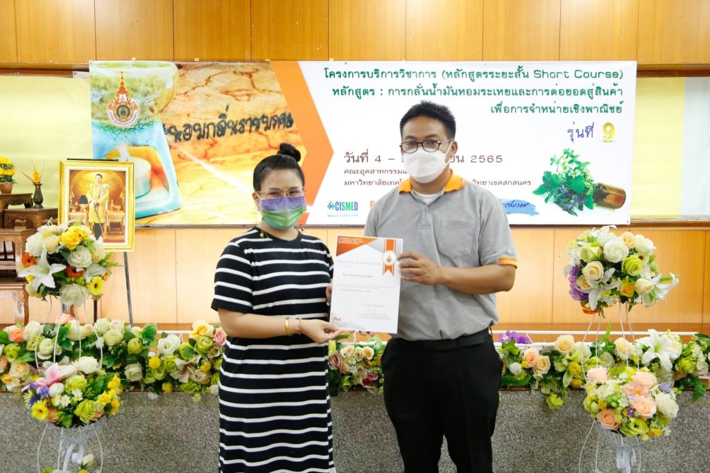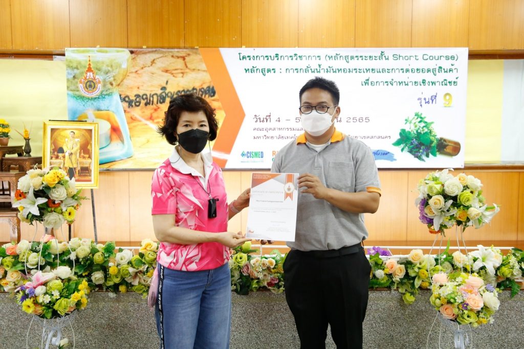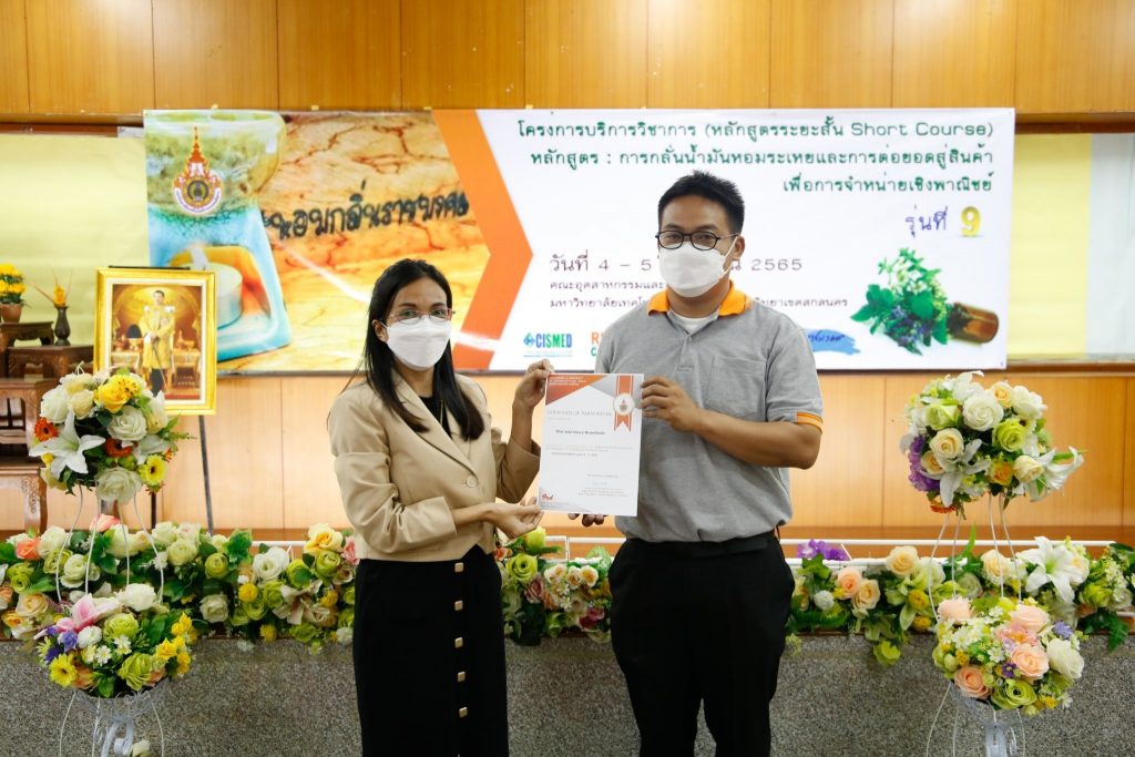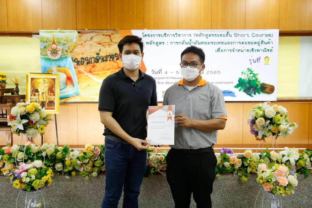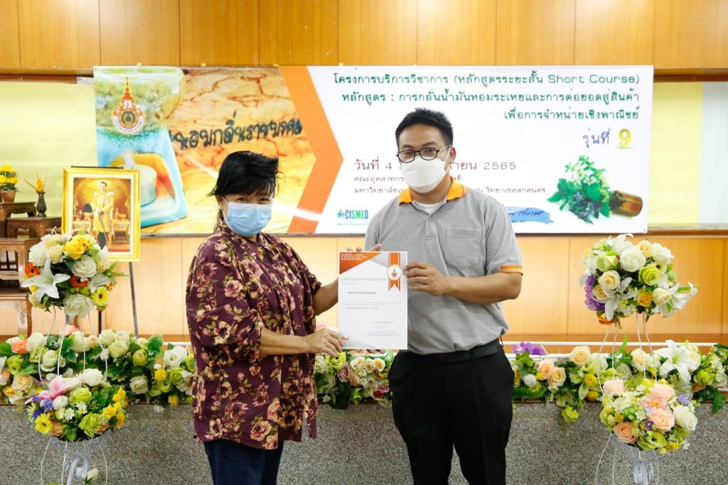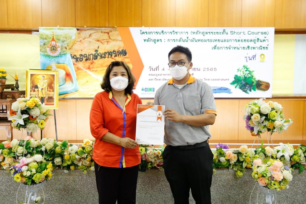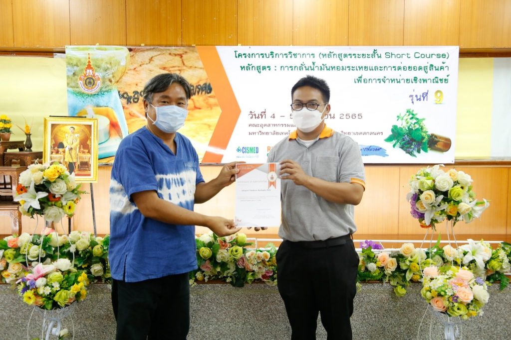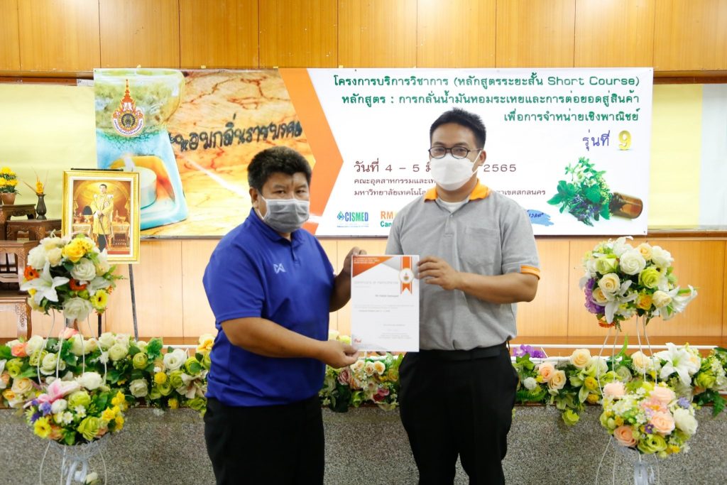 วันที่ 4 – 5 มิถุนายน 2565 คณะอุตสาหกรรมและเทคโนโลยี จัดโครงการบริการวิชาการ (หลักสูตรระยะสั้น Short Course) หลักสูตร : การกลั่นน้ำมันหอมระเหยและการต่อยอดสู่สินค้าเพื่อการจำหน่ายเชิงพาณิชย์ รุ่นที่ 9 สำหรับผู้ประกอบการ วิสาหกิจชุมชน กลุ่มเกษตรกรและบุคคลทั่วไป ณ ห้องประชุมค้ำคูณ 4 ชั้น 5 อาคารสำนักงานคณบดีคณะอุตสาหกรรมและเทคโนโลยี โดยมีวัตถุประสงค์เพื่อถ่ายทอดนวัตกรรมและเทคโนโลยีด้านการกลั่นน้ำมันหอมระเหยจากสมุนไพรอันเป็นการพัฒนาคุณภาพชีวิตของชุมชนให้เกิดความเข้มแข็งและยั่งยืน อีกทั้งเป็นการสร้างเครือข่ายผู้ประกอบการด้านสมุนไพรทั้งต้นน้ำ กลางน้ำ และปลายน้ำ ในการนี้ ผศ.น.สพ.ดร.ชเวง สารคล่อง รองอธิการบดีประจำวิทยาเขตสกลนคร ให้เกียรติเป็นประธานในพิธีเปิดโครงการในครั้งนี้
