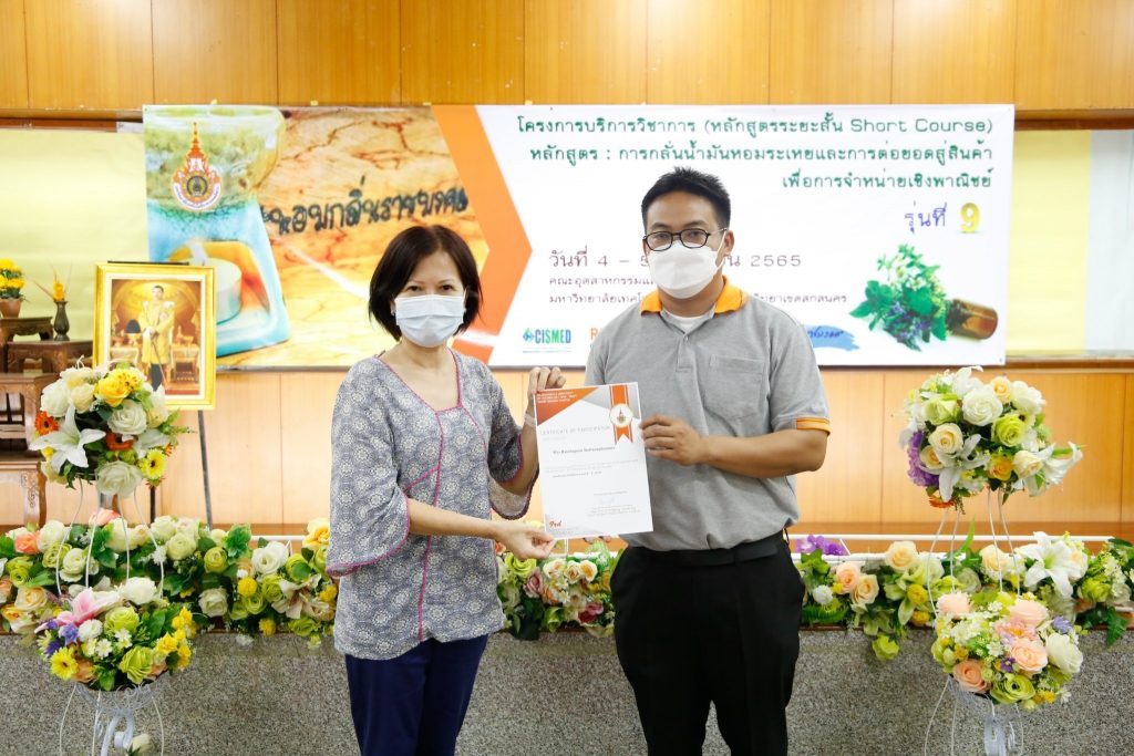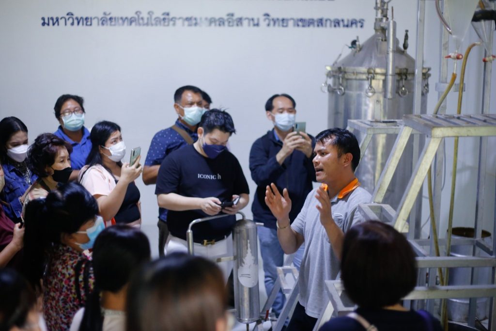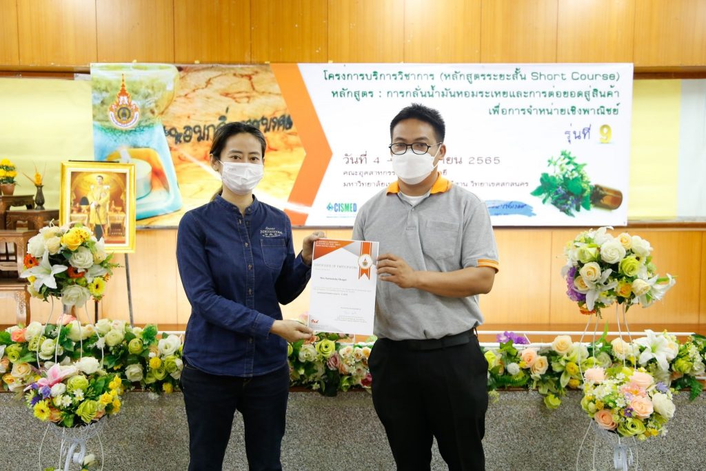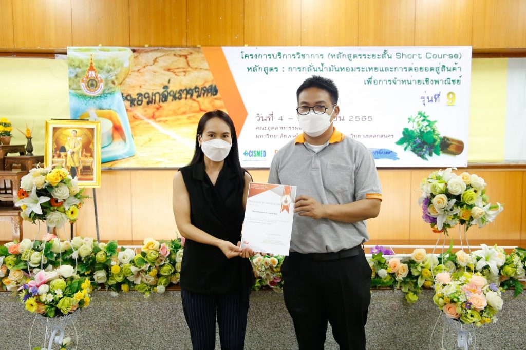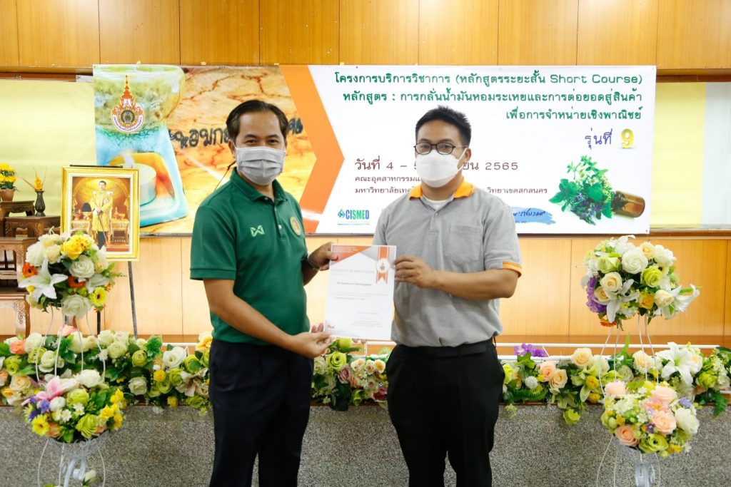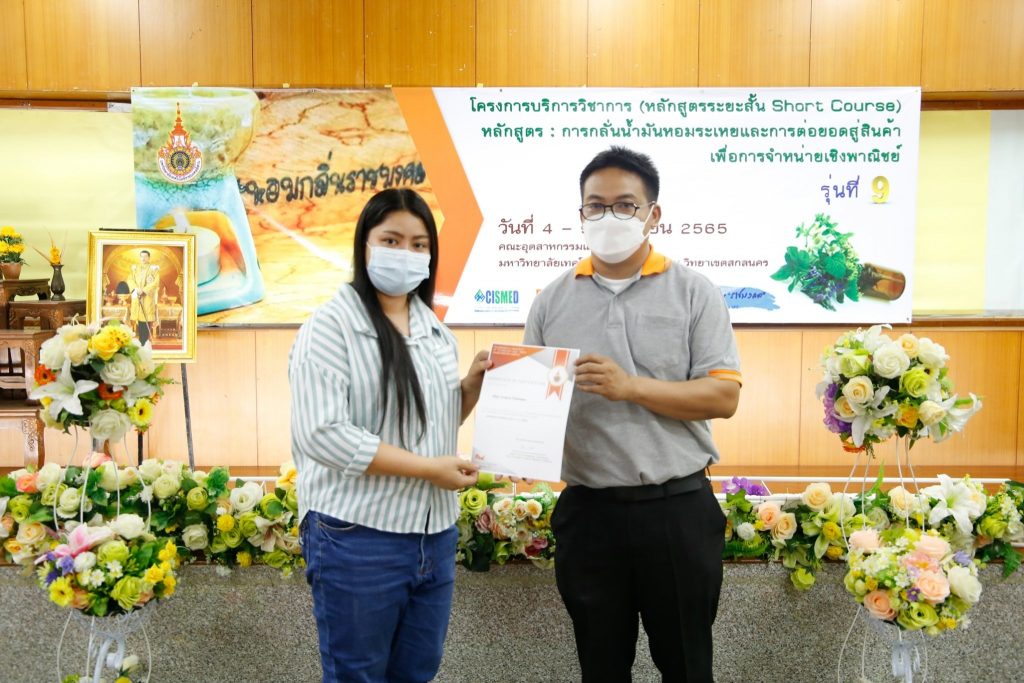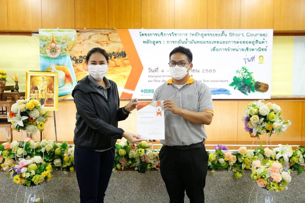 วันที่ 4 – 5 มิถุนายน 2565 คณะอุตสาหกรรมและเทคโนโลยี จัดโครงการบริการวิชาการ (หลักสูตรระยะสั้น Short Course) หลักสูตร : การกลั่นน้ำมันหอมระเหยและการต่อยอดสู่สินค้าเพื่อการจำหน่ายเชิงพาณิชย์ รุ่นที่ 9 สำหรับผู้ประกอบการ วิสาหกิจชุมชน กลุ่มเกษตรกรและบุคคลทั่วไป ณ ห้องประชุมค้ำคูณ 4 ชั้น 5 อาคารสำนักงานคณบดีคณะอุตสาหกรรมและเทคโนโลยี โดยมีวัตถุประสงค์เพื่อถ่ายทอดนวัตกรรมและเทคโนโลยีด้านการกลั่นน้ำมันหอมระเหยจากสมุนไพรอันเป็นการพัฒนาคุณภาพชีวิตของชุมชนให้เกิดความเข้มแข็งและยั่งยืน อีกทั้งเป็นการสร้างเครือข่ายผู้ประกอบการด้านสมุนไพรทั้งต้นน้ำ กลางน้ำ และปลายน้ำ ในการนี้ ผศ.น.สพ.ดร.ชเวง สารคล่อง รองอธิการบดีประจำวิทยาเขตสกลนคร ให้เกียรติเป็นประธานในพิธีเปิดโครงการในครั้งนี้