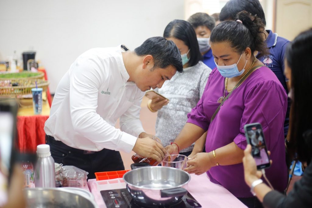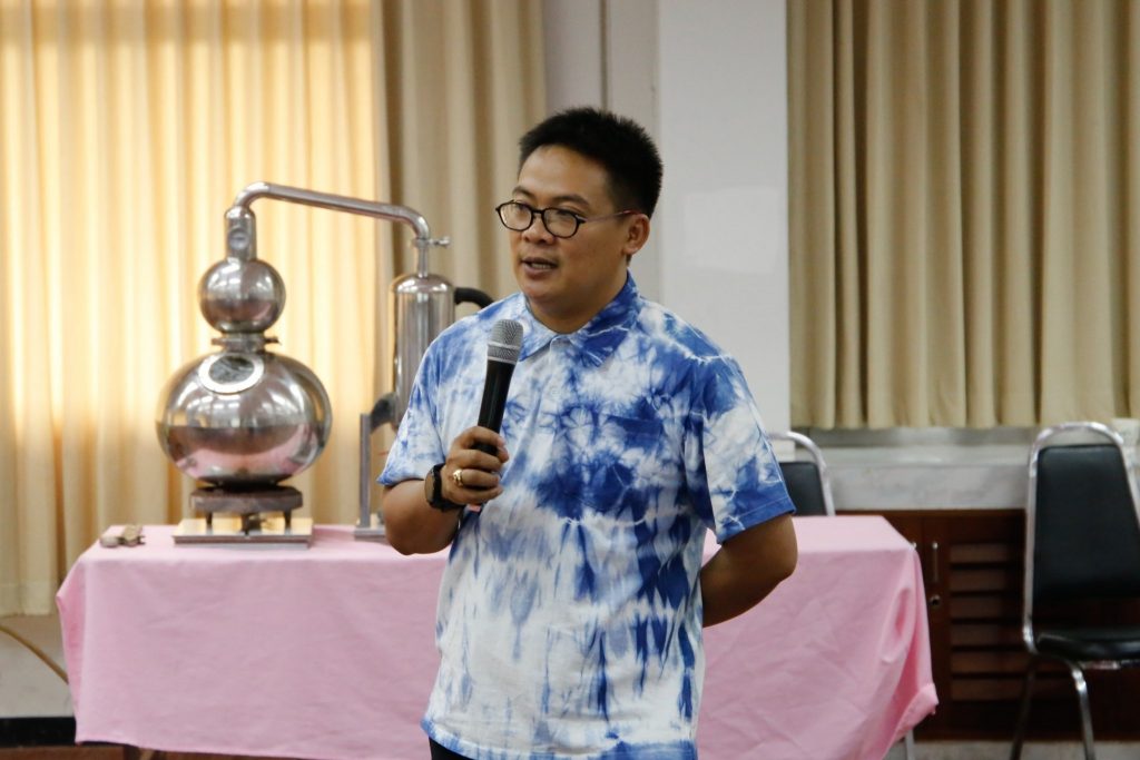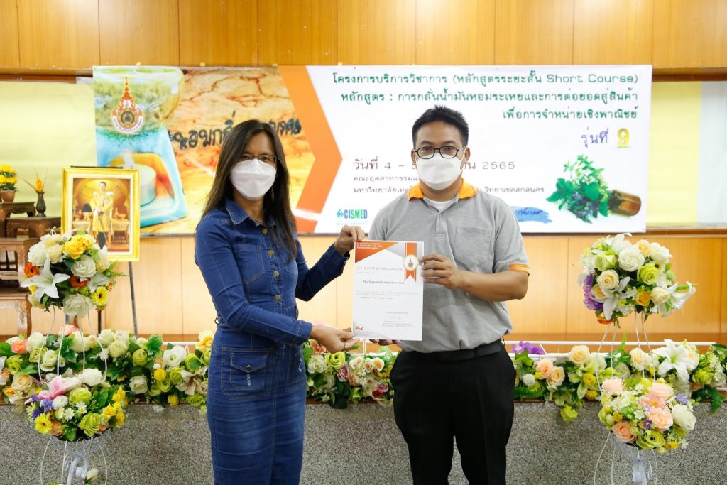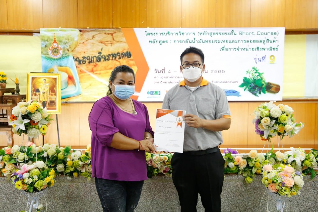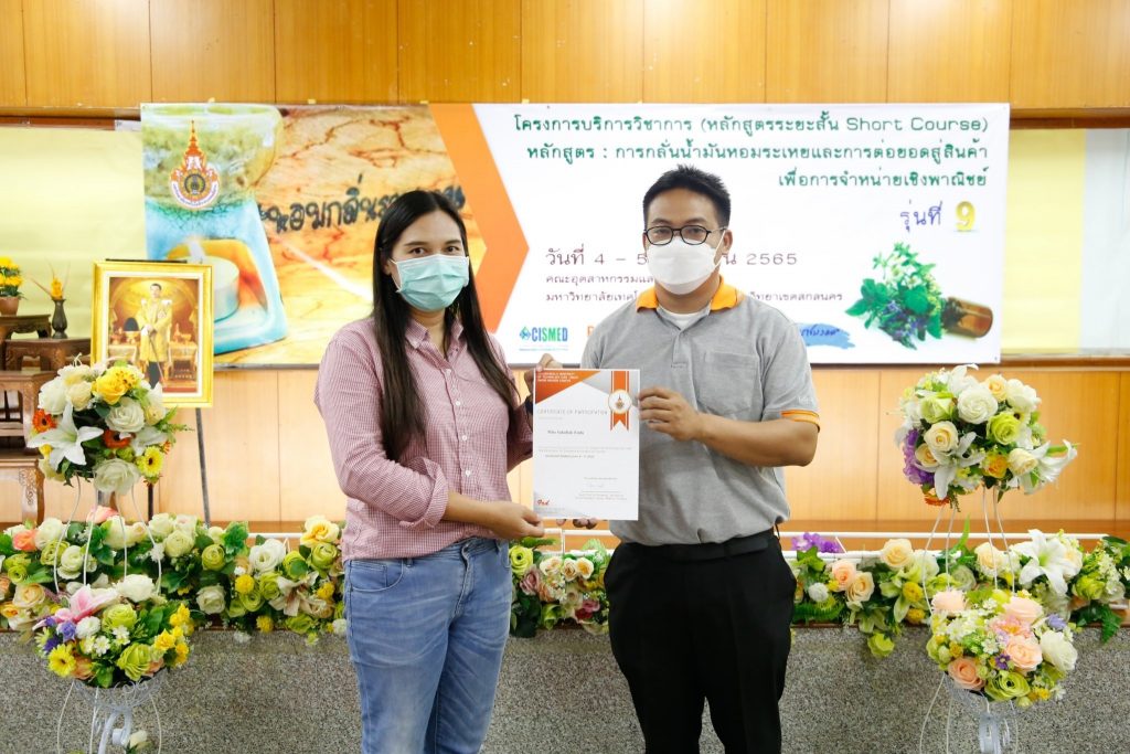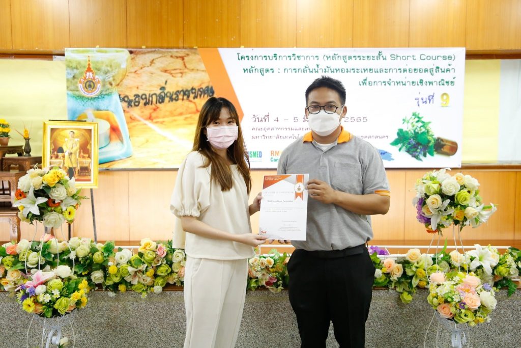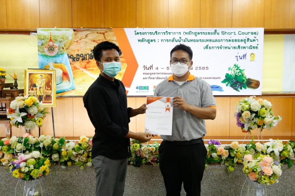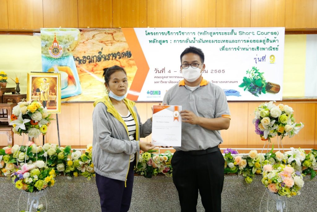 วันที่ 4 – 5 มิถุนายน 2565 คณะอุตสาหกรรมและเทคโนโลยี จัดโครงการบริการวิชาการ (หลักสูตรระยะสั้น Short Course) หลักสูตร : การกลั่นน้ำมันหอมระเหยและการต่อยอดสู่สินค้าเพื่อการจำหน่ายเชิงพาณิชย์ รุ่นที่ 9 สำหรับผู้ประกอบการ วิสาหกิจชุมชน กลุ่มเกษตรกรและบุคคลทั่วไป ณ ห้องประชุมค้ำคูณ 4 ชั้น 5 อาคารสำนักงานคณบดีคณะอุตสาหกรรมและเทคโนโลยี โดยมีวัตถุประสงค์เพื่อถ่ายทอดนวัตกรรมและเทคโนโลยีด้านการกลั่นน้ำมันหอมระเหยจากสมุนไพรอันเป็นการพัฒนาคุณภาพชีวิตของชุมชนให้เกิดความเข้มแข็งและยั่งยืน อีกทั้งเป็นการสร้างเครือข่ายผู้ประกอบการด้านสมุนไพรทั้งต้นน้ำ กลางน้ำ และปลายน้ำ ในการนี้ ผศ.น.สพ.ดร.ชเวง สารคล่อง รองอธิการบดีประจำวิทยาเขตสกลนคร ให้เกียรติเป็นประธานในพิธีเปิดโครงการในครั้งนี้