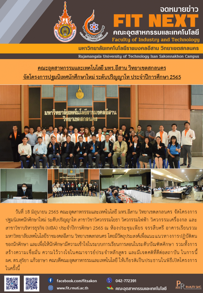 วันที่ 18 มิถุนายน 2565 คณะอุตสาหกรรมและเทคโนโลยี มทร.อีสาน วิทยาเขตสกลนคร จัดโครงการปฐมนิเทศนักศึกษาใหม่ ระดับปริญญาโท สาขาวิชาวิศวกรรมโยธา วิศวกรรมไฟฟ้า วิศวกรรมเครื่องกล และสาขาวิชาบริหารธุรกิจ (MBA) ประจำปีการศึกษา 2565 ณ ห้องประชุมเพียร จรรสืบศรี อาคารเรียนรวม มหาวิทยาลัยเทคโนโลยีราชมงคลอีสาน วิทยาเขตสกลนคร โดยมีวัตถุประสงค์เพื่อแนะแนวทางการปฏิบัติตนของนักศึกษา และเพื่อให้นักศึกษามีความเข้าใจในระบบการเรียนการสอนในระดับบัณฑิตศึกษา รวมทั้งการสร้างความเชื่อมั่น ความไว้วางใจในคณาจารย์ประจำหลักสูตร และมีเจตคติที่ดีต่อสถาบัน ในการนี้ ผศ. ดร.สุริยา แก้วอาษา คณบดีคณะอุตสาหกรรมและเทคโนโลยี ให้เกียรติเป็นประธานในพิธีเปิดโครงการในครั้งนี้