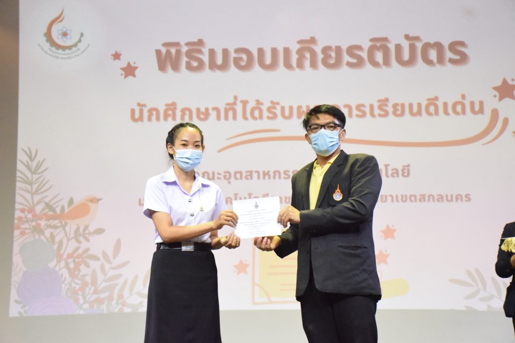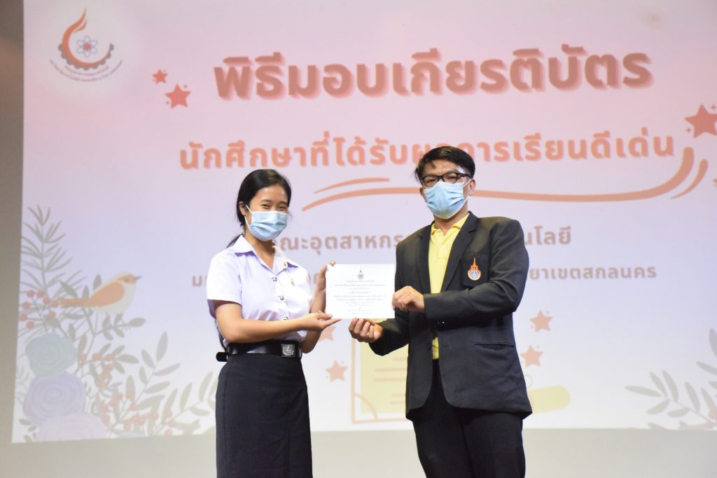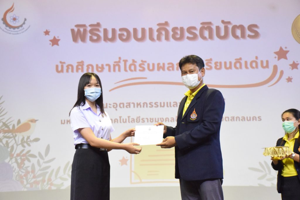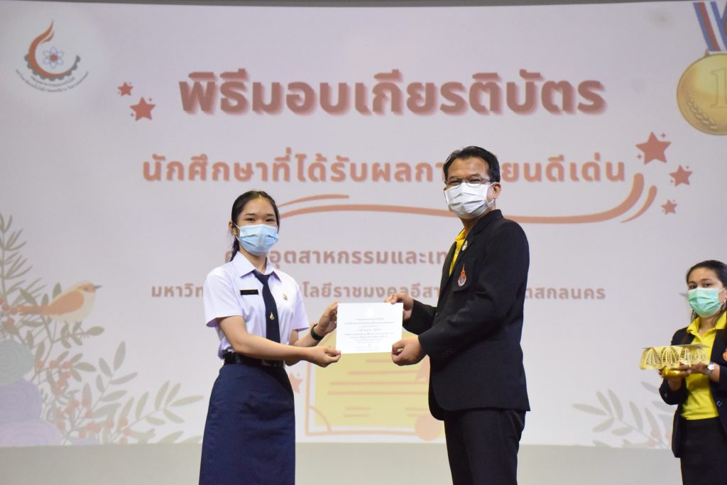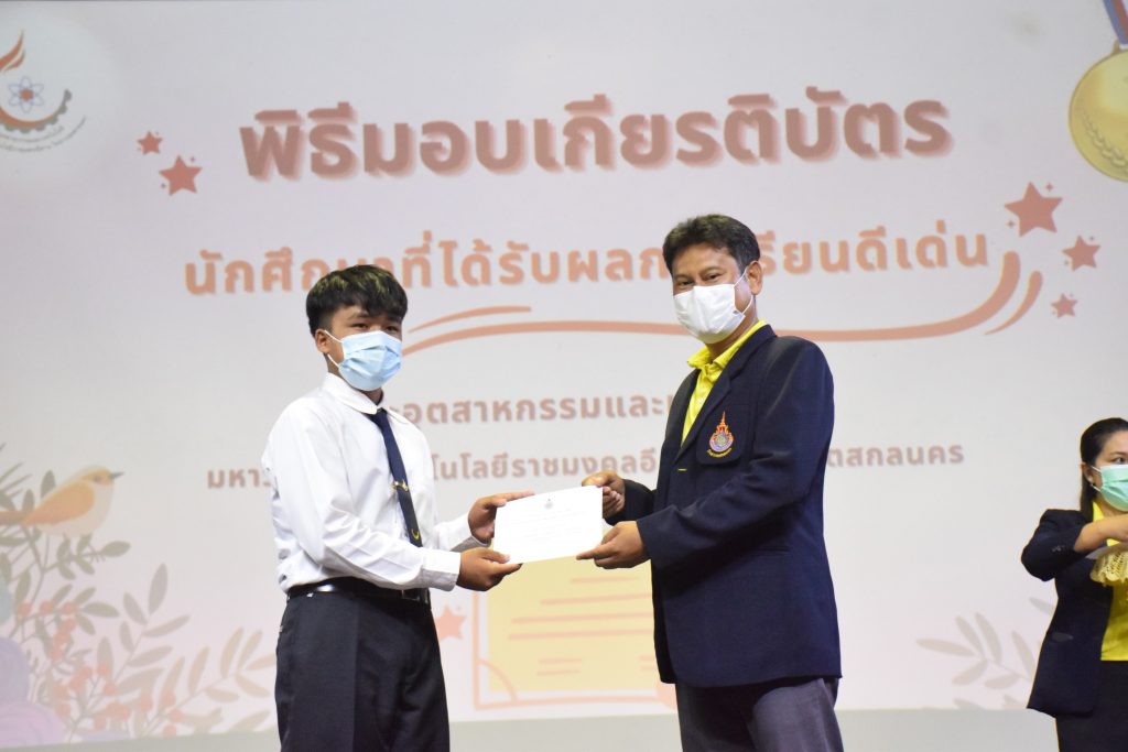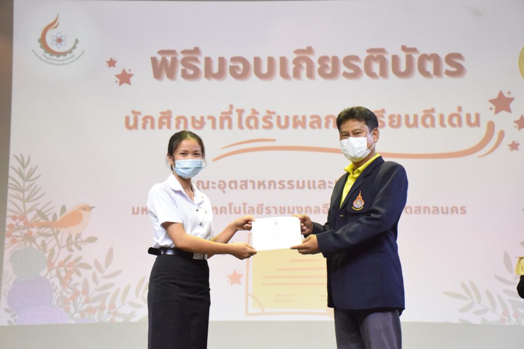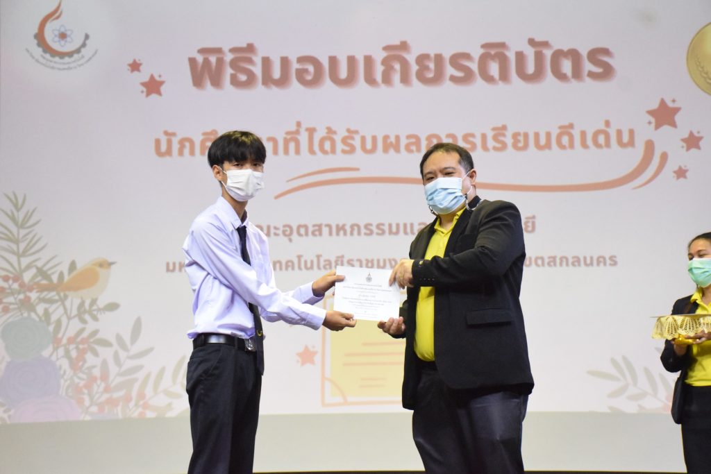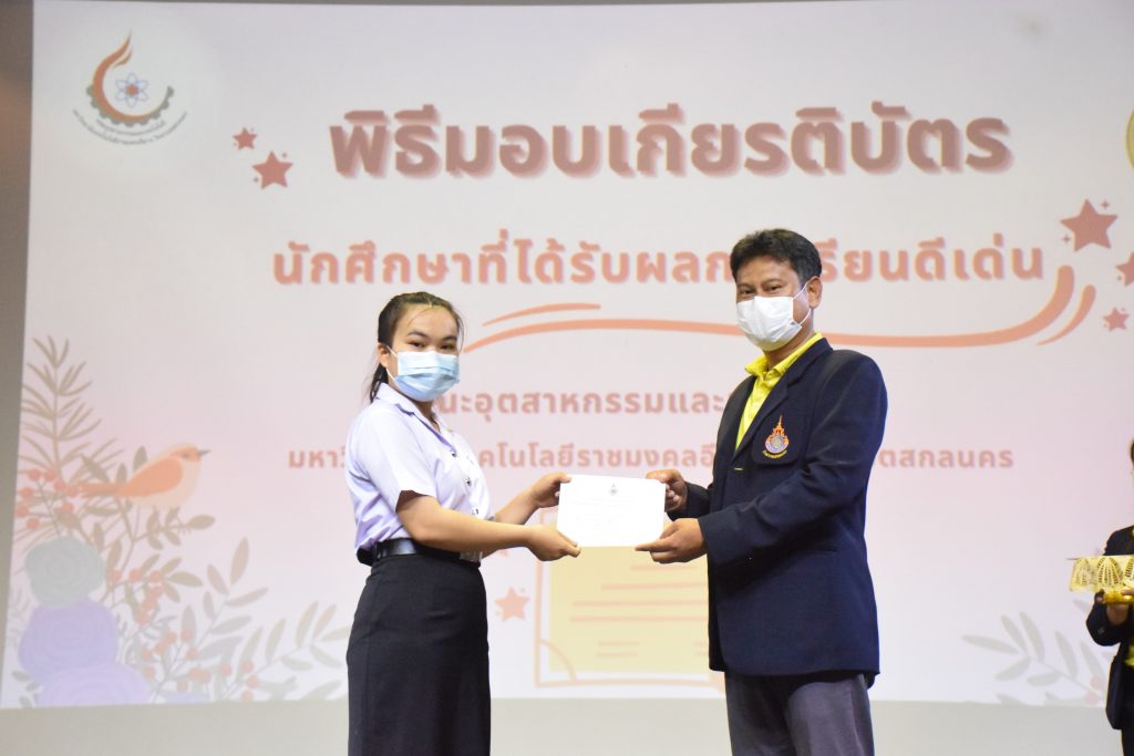 วันที่ 19 กรกฎาคม 2565 คณะอุตสาหกรรมและเทคโนโลยี มทร.อีสาน วิทยาเขตสกลนคร จัดพิธีมอบเกียรติบัตร แก่นักศึกษาที่มีผลการเรียนดีเด่น ประจำปีการศึกษา 2564 จำนวน 105 คน ณ ห้องประชุมราชมงคล อาคารเรียนรวม มทร.อีสาน วิทยาเขตสกลนคร โดยมีวัตถุประสงค์เพื่อสร้างขวัญกำลังใจให้แก่นักศึกษาที่เรียนดี ประพฤติดี ก่อให้เกิดความภาคภูมิใจในความสำเร็จของตนเอง ส่งเสริมให้นักศึกษามีความใฝ่รู้ใฝ่เรียนเเละพัฒนาตนเองต่อไป ในการนี้ ผศ.ดร.สุริยา แก้วอาษา คณบดีคณะอุตสาหกรรม และเทคโนโลยี ให้เกียรติเป็นประธานในพิธีพร้อมทั้งมอบเกียรติบัตรให้แก่นักศึกษา โดยมีคณะผู้บริหาร คณาจารย์ บุคลากร และนักศึกษา เข้าร่วมพิธีในครั้งนี้โดยพร้อมเพรียงกัน