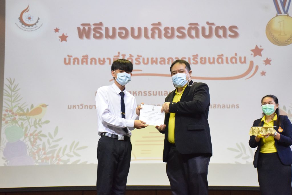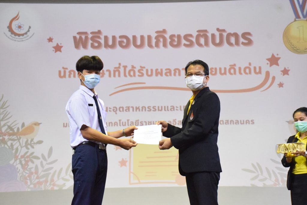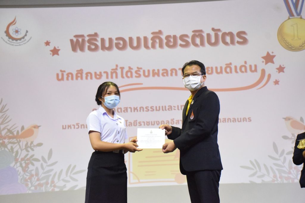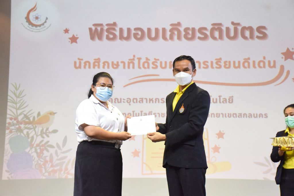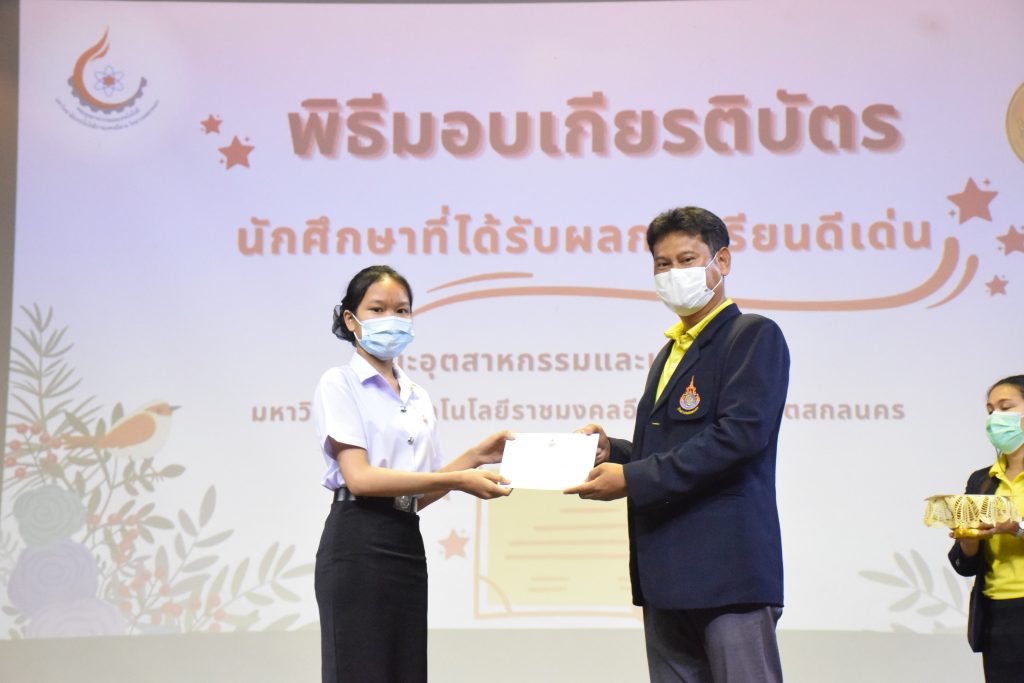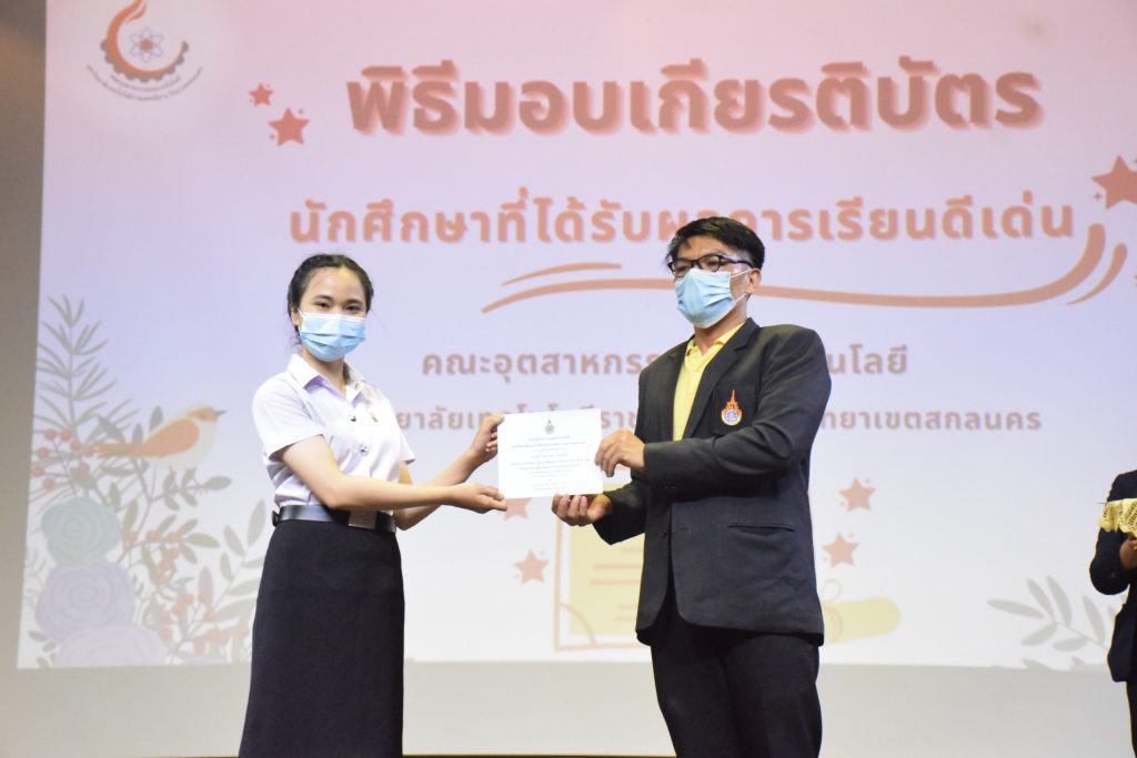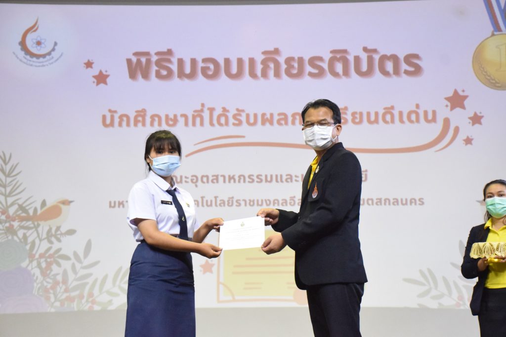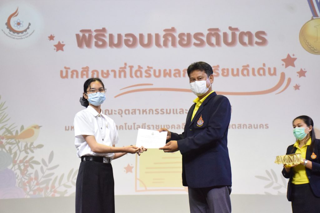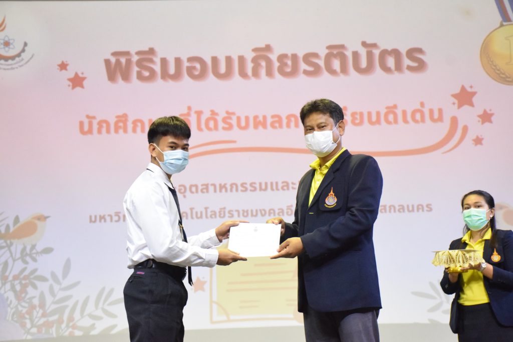 วันที่ 19 กรกฎาคม 2565 คณะอุตสาหกรรมและเทคโนโลยี มทร.อีสาน วิทยาเขตสกลนคร จัดพิธีมอบเกียรติบัตร แก่นักศึกษาที่มีผลการเรียนดีเด่น ประจำปีการศึกษา 2564 จำนวน 105 คน ณ ห้องประชุมราชมงคล อาคารเรียนรวม มทร.อีสาน วิทยาเขตสกลนคร โดยมีวัตถุประสงค์เพื่อสร้างขวัญกำลังใจให้แก่นักศึกษาที่เรียนดี ประพฤติดี ก่อให้เกิดความภาคภูมิใจในความสำเร็จของตนเอง ส่งเสริมให้นักศึกษามีความใฝ่รู้ใฝ่เรียนเเละพัฒนาตนเองต่อไป ในการนี้ ผศ.ดร.สุริยา แก้วอาษา คณบดีคณะอุตสาหกรรม และเทคโนโลยี ให้เกียรติเป็นประธานในพิธีพร้อมทั้งมอบเกียรติบัตรให้แก่นักศึกษา โดยมีคณะผู้บริหาร คณาจารย์ บุคลากร และนักศึกษา เข้าร่วมพิธีในครั้งนี้โดยพร้อมเพรียงกัน