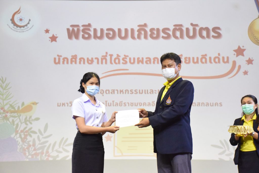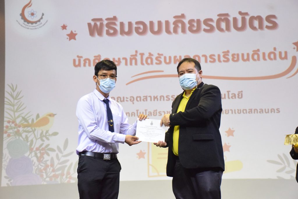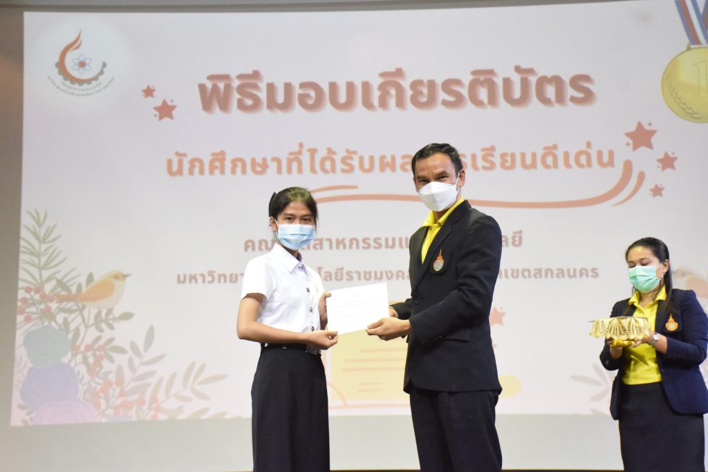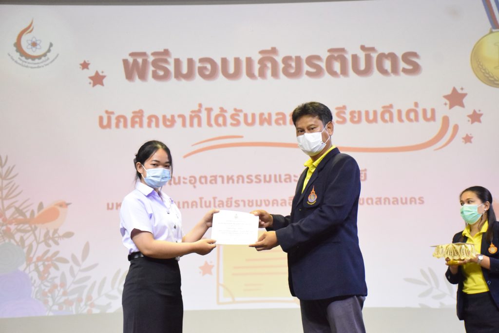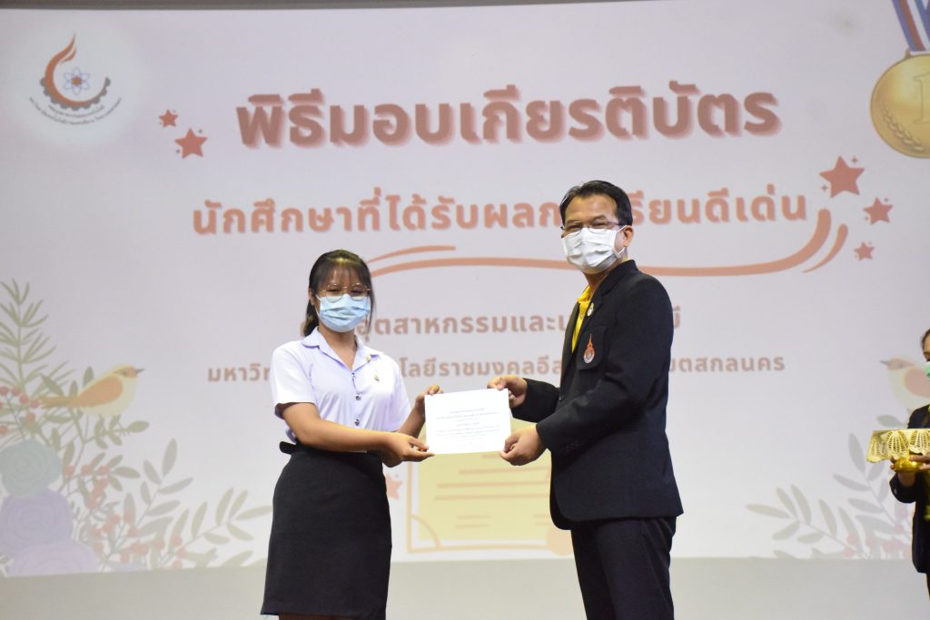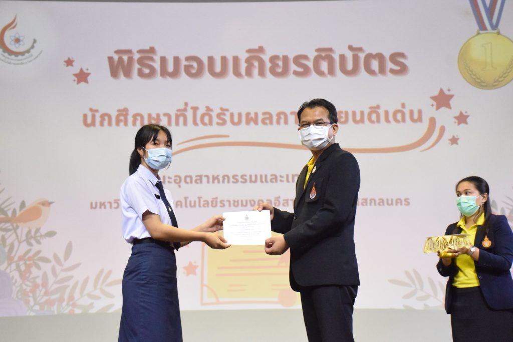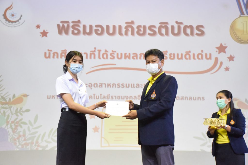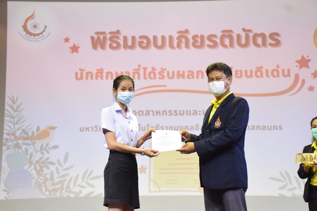 วันที่ 19 กรกฎาคม 2565 คณะอุตสาหกรรมและเทคโนโลยี มทร.อีสาน วิทยาเขตสกลนคร จัดพิธีมอบเกียรติบัตร แก่นักศึกษาที่มีผลการเรียนดีเด่น ประจำปีการศึกษา 2564 จำนวน 105 คน ณ ห้องประชุมราชมงคล อาคารเรียนรวม มทร.อีสาน วิทยาเขตสกลนคร โดยมีวัตถุประสงค์เพื่อสร้างขวัญกำลังใจให้แก่นักศึกษาที่เรียนดี ประพฤติดี ก่อให้เกิดความภาคภูมิใจในความสำเร็จของตนเอง ส่งเสริมให้นักศึกษามีความใฝ่รู้ใฝ่เรียนเเละพัฒนาตนเองต่อไป ในการนี้ ผศ.ดร.สุริยา แก้วอาษา คณบดีคณะอุตสาหกรรม และเทคโนโลยี ให้เกียรติเป็นประธานในพิธีพร้อมทั้งมอบเกียรติบัตรให้แก่นักศึกษา โดยมีคณะผู้บริหาร คณาจารย์ บุคลากร และนักศึกษา เข้าร่วมพิธีในครั้งนี้โดยพร้อมเพรียงกัน