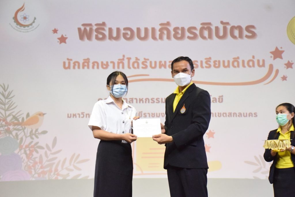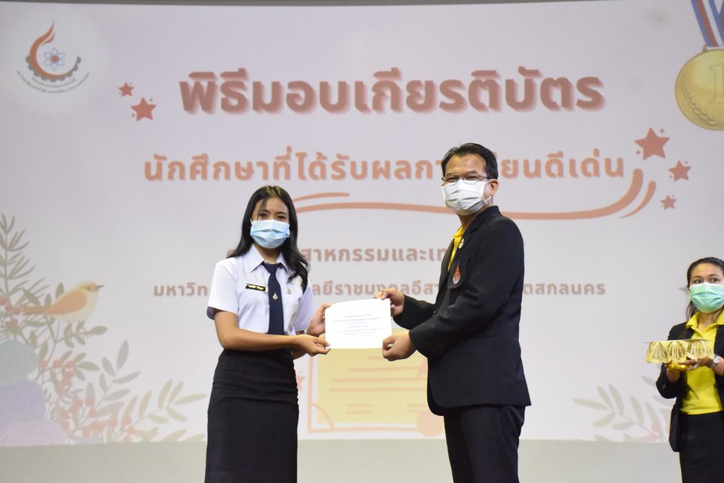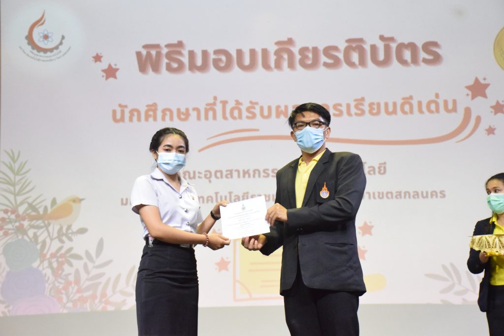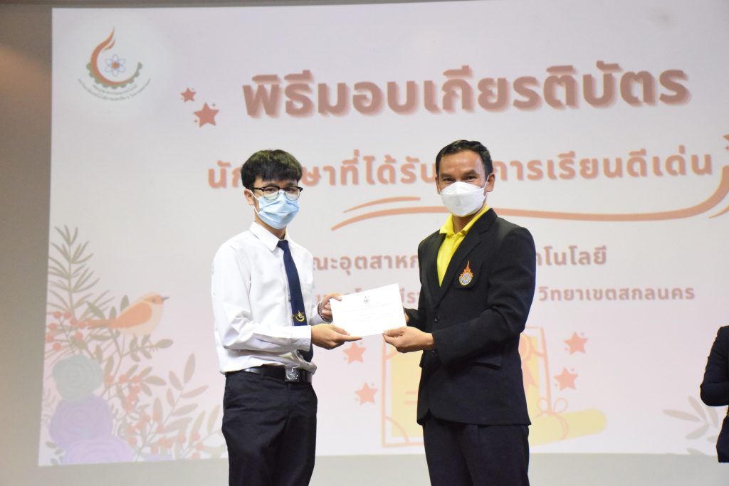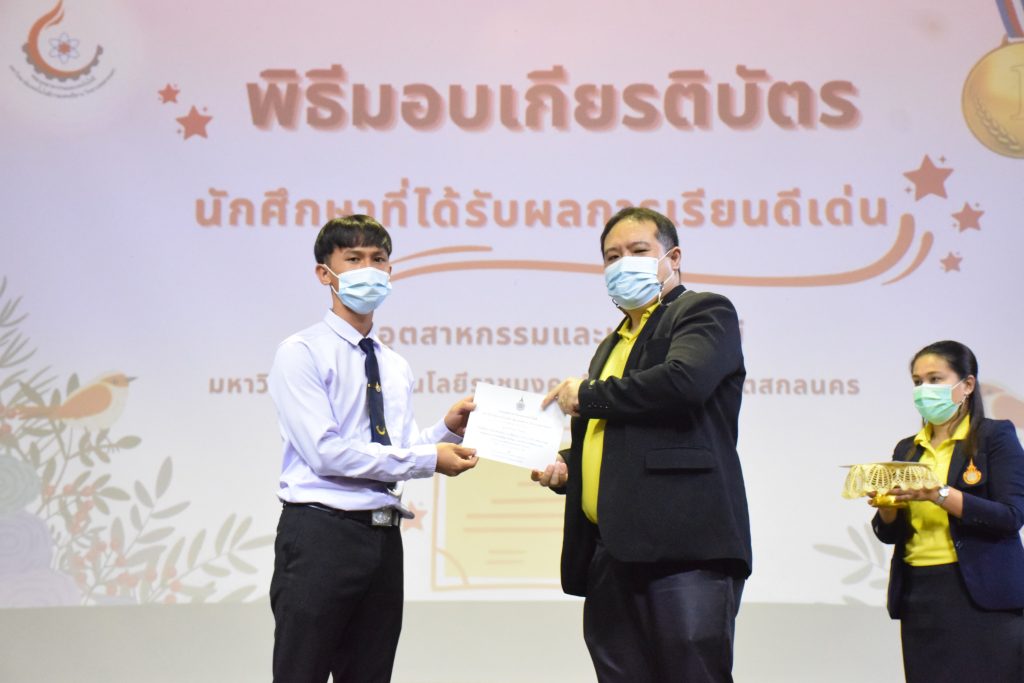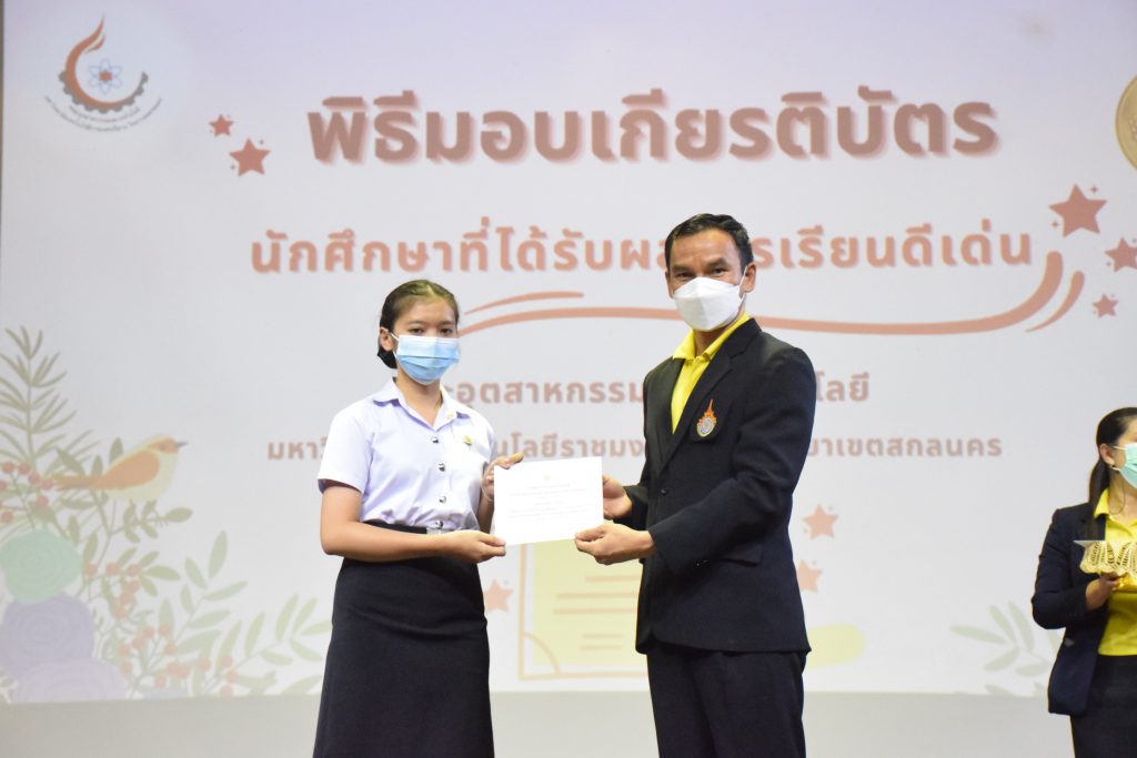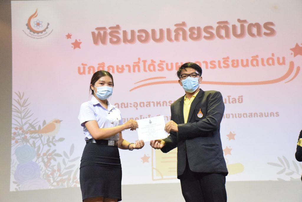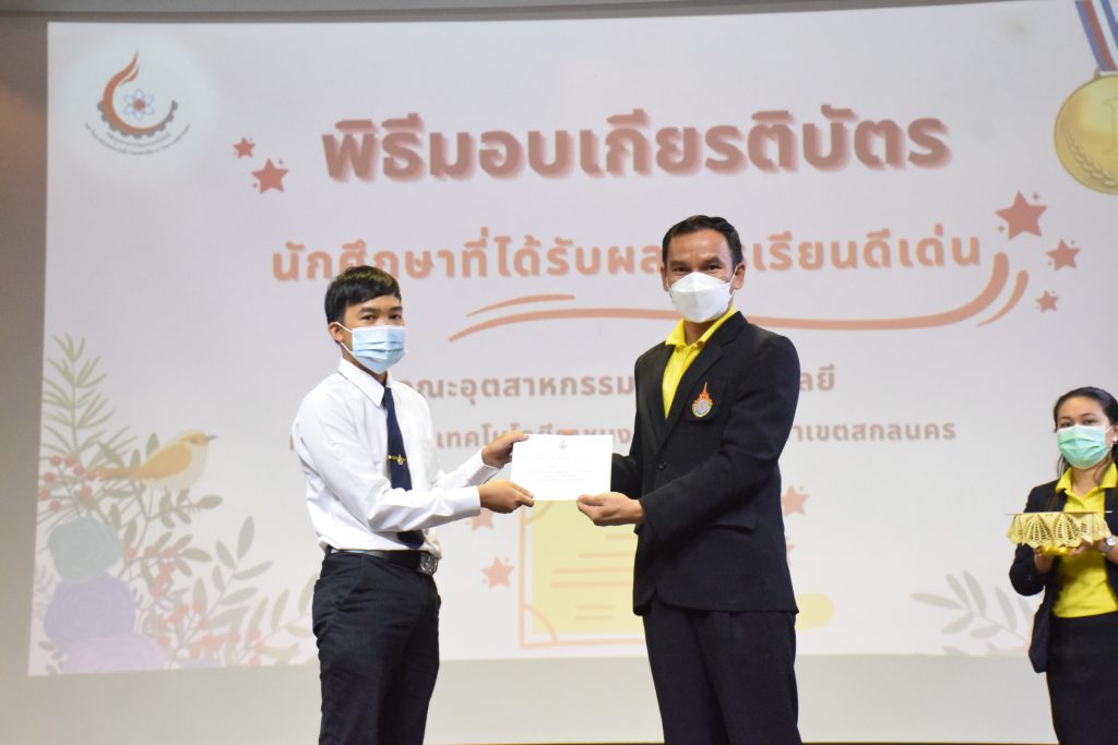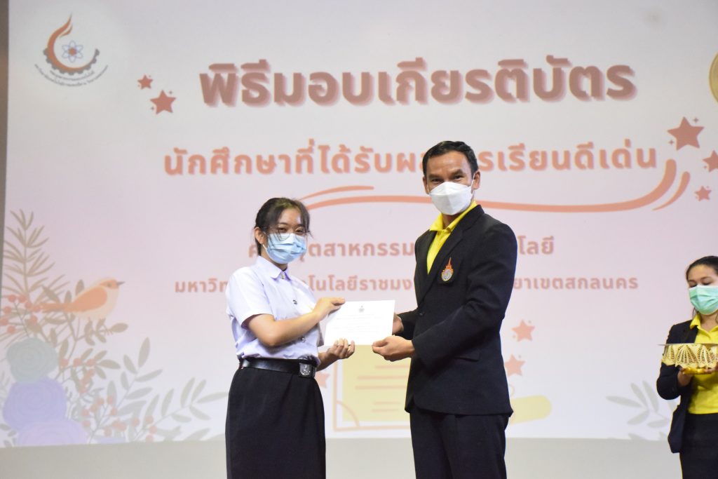 วันที่ 19 กรกฎาคม 2565 คณะอุตสาหกรรมและเทคโนโลยี มทร.อีสาน วิทยาเขตสกลนคร จัดพิธีมอบเกียรติบัตร แก่นักศึกษาที่มีผลการเรียนดีเด่น ประจำปีการศึกษา 2564 จำนวน 105 คน ณ ห้องประชุมราชมงคล อาคารเรียนรวม มทร.อีสาน วิทยาเขตสกลนคร โดยมีวัตถุประสงค์เพื่อสร้างขวัญกำลังใจให้แก่นักศึกษาที่เรียนดี ประพฤติดี ก่อให้เกิดความภาคภูมิใจในความสำเร็จของตนเอง ส่งเสริมให้นักศึกษามีความใฝ่รู้ใฝ่เรียนเเละพัฒนาตนเองต่อไป ในการนี้ ผศ.ดร.สุริยา แก้วอาษา คณบดีคณะอุตสาหกรรม และเทคโนโลยี ให้เกียรติเป็นประธานในพิธีพร้อมทั้งมอบเกียรติบัตรให้แก่นักศึกษา โดยมีคณะผู้บริหาร คณาจารย์ บุคลากร และนักศึกษา เข้าร่วมพิธีในครั้งนี้โดยพร้อมเพรียงกัน