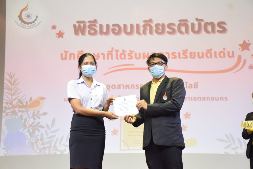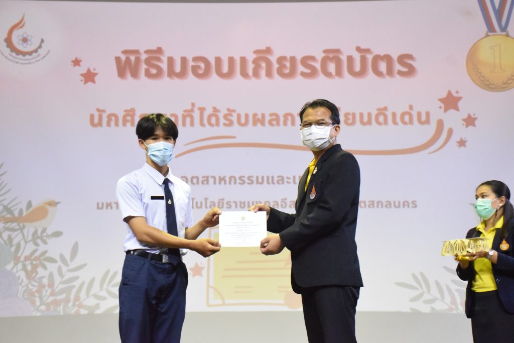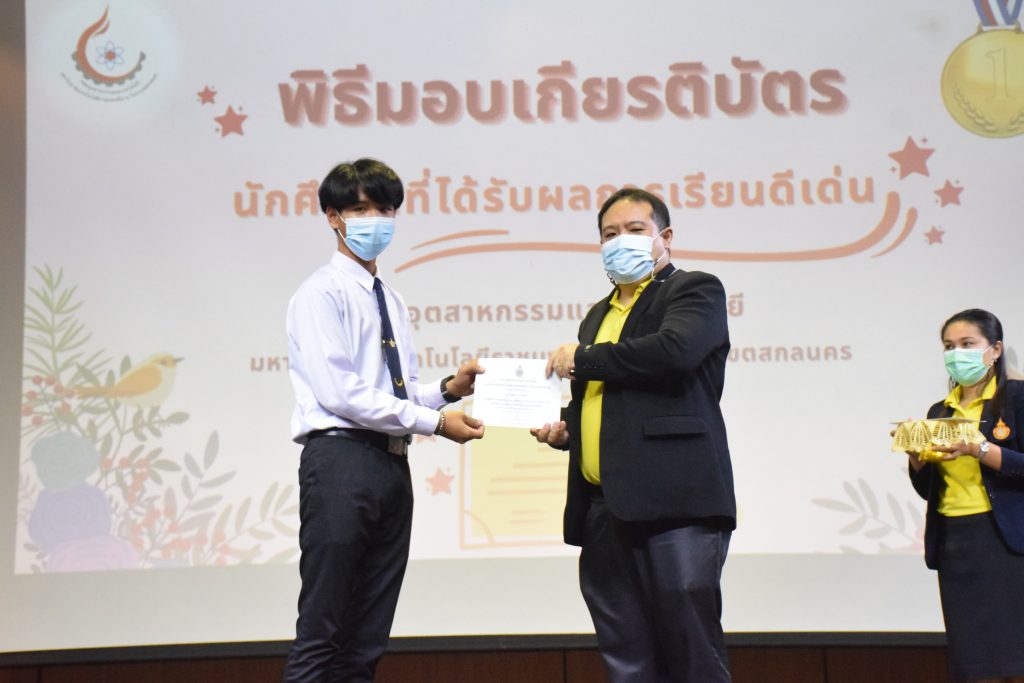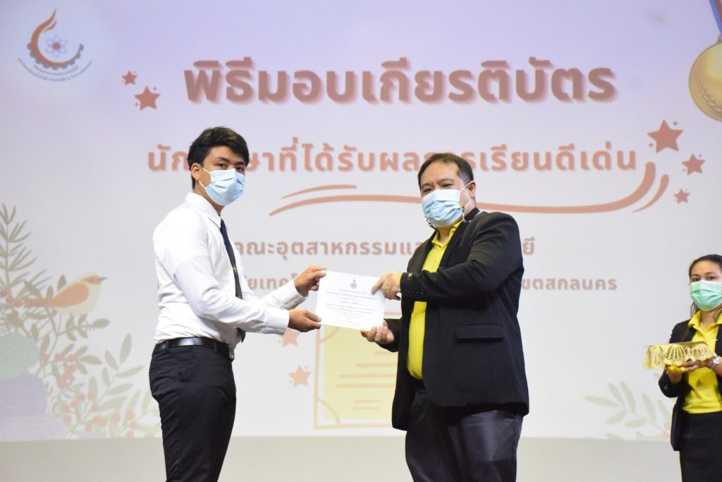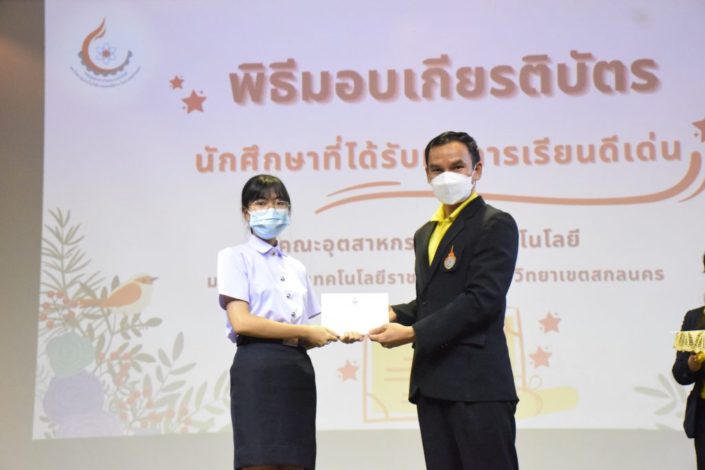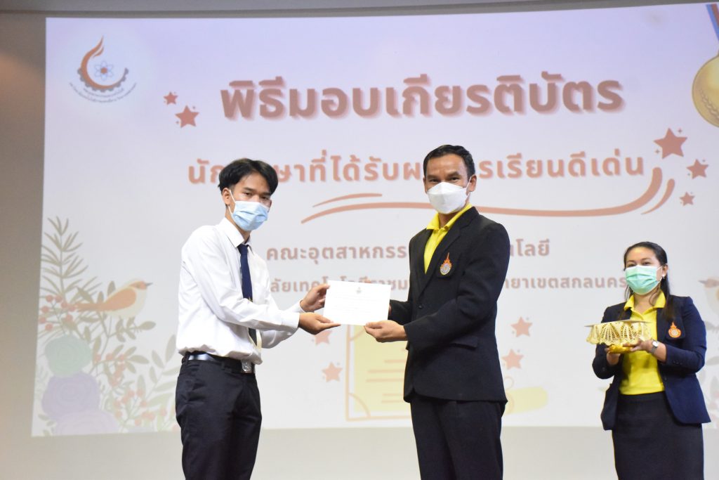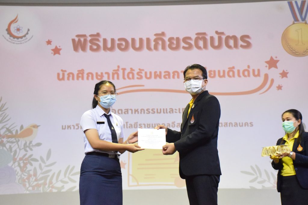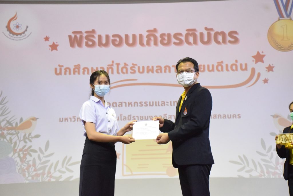 วันที่ 19 กรกฎาคม 2565 คณะอุตสาหกรรมและเทคโนโลยี มทร.อีสาน วิทยาเขตสกลนคร จัดพิธีมอบเกียรติบัตร แก่นักศึกษาที่มีผลการเรียนดีเด่น ประจำปีการศึกษา 2564 จำนวน 105 คน ณ ห้องประชุมราชมงคล อาคารเรียนรวม มทร.อีสาน วิทยาเขตสกลนคร โดยมีวัตถุประสงค์เพื่อสร้างขวัญกำลังใจให้แก่นักศึกษาที่เรียนดี ประพฤติดี ก่อให้เกิดความภาคภูมิใจในความสำเร็จของตนเอง ส่งเสริมให้นักศึกษามีความใฝ่รู้ใฝ่เรียนเเละพัฒนาตนเองต่อไป ในการนี้ ผศ.ดร.สุริยา แก้วอาษา คณบดีคณะอุตสาหกรรม และเทคโนโลยี ให้เกียรติเป็นประธานในพิธีพร้อมทั้งมอบเกียรติบัตรให้แก่นักศึกษา โดยมีคณะผู้บริหาร คณาจารย์ บุคลากร และนักศึกษา เข้าร่วมพิธีในครั้งนี้โดยพร้อมเพรียงกัน