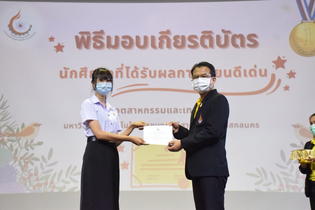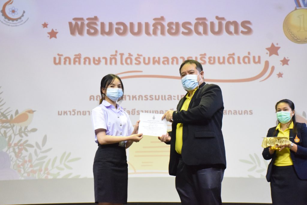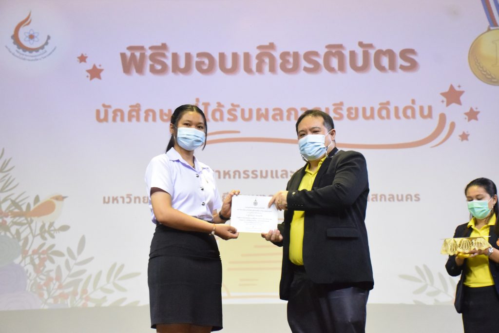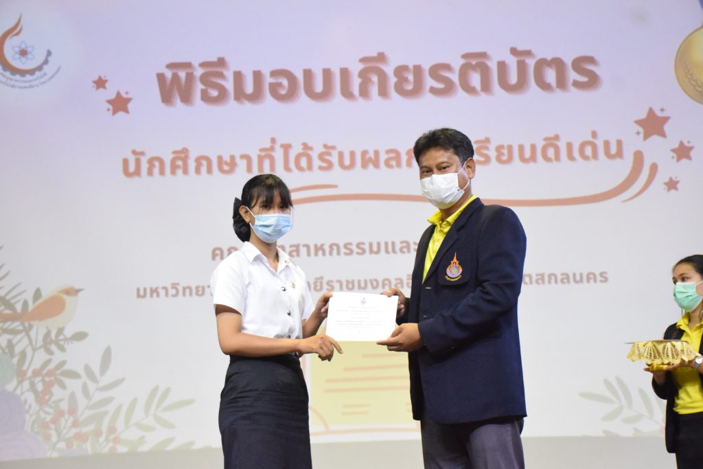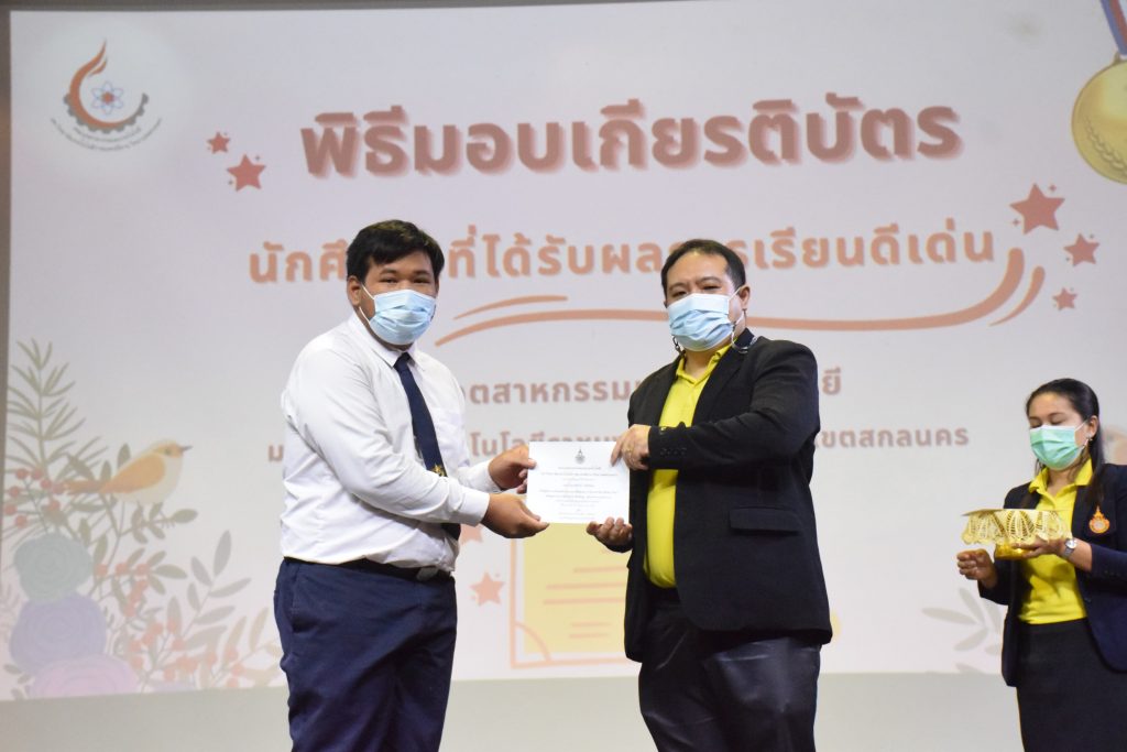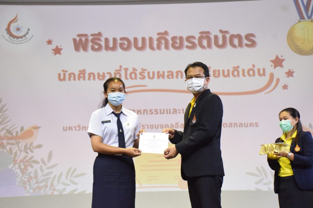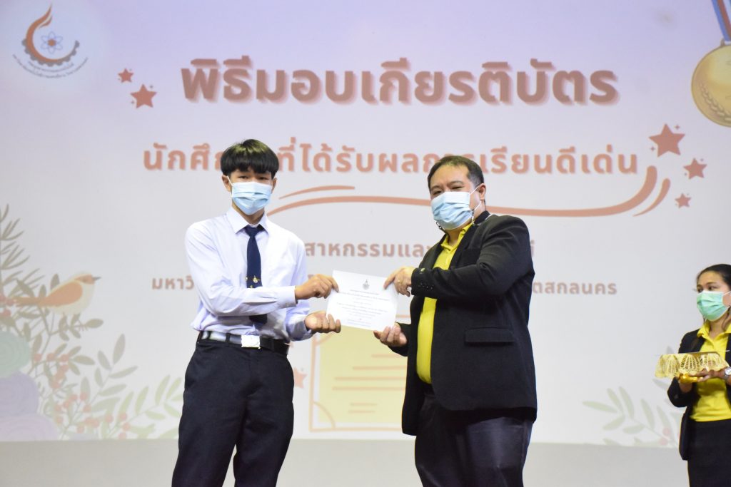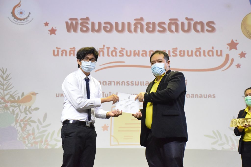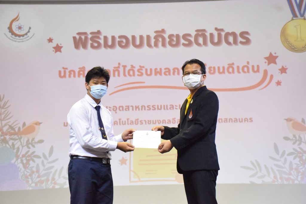 วันที่ 19 กรกฎาคม 2565 คณะอุตสาหกรรมและเทคโนโลยี มทร.อีสาน วิทยาเขตสกลนคร จัดพิธีมอบเกียรติบัตร แก่นักศึกษาที่มีผลการเรียนดีเด่น ประจำปีการศึกษา 2564 จำนวน 105 คน ณ ห้องประชุมราชมงคล อาคารเรียนรวม มทร.อีสาน วิทยาเขตสกลนคร โดยมีวัตถุประสงค์เพื่อสร้างขวัญกำลังใจให้แก่นักศึกษาที่เรียนดี ประพฤติดี ก่อให้เกิดความภาคภูมิใจในความสำเร็จของตนเอง ส่งเสริมให้นักศึกษามีความใฝ่รู้ใฝ่เรียนเเละพัฒนาตนเองต่อไป ในการนี้ ผศ.ดร.สุริยา แก้วอาษา คณบดีคณะอุตสาหกรรม และเทคโนโลยี ให้เกียรติเป็นประธานในพิธีพร้อมทั้งมอบเกียรติบัตรให้แก่นักศึกษา โดยมีคณะผู้บริหาร คณาจารย์ บุคลากร และนักศึกษา เข้าร่วมพิธีในครั้งนี้โดยพร้อมเพรียงกัน