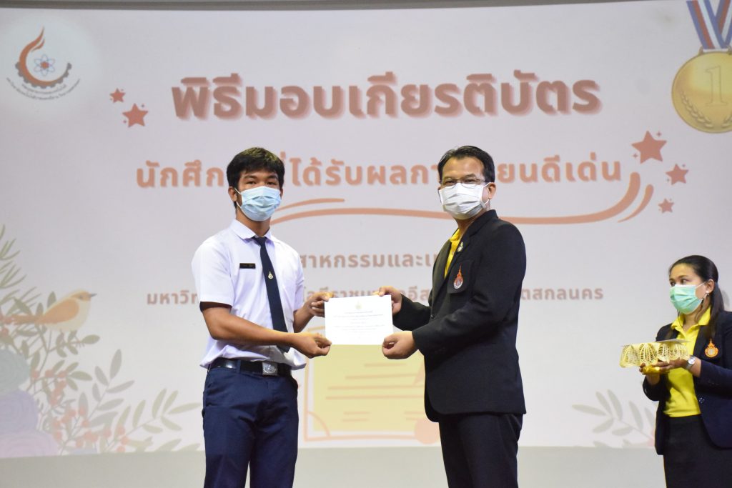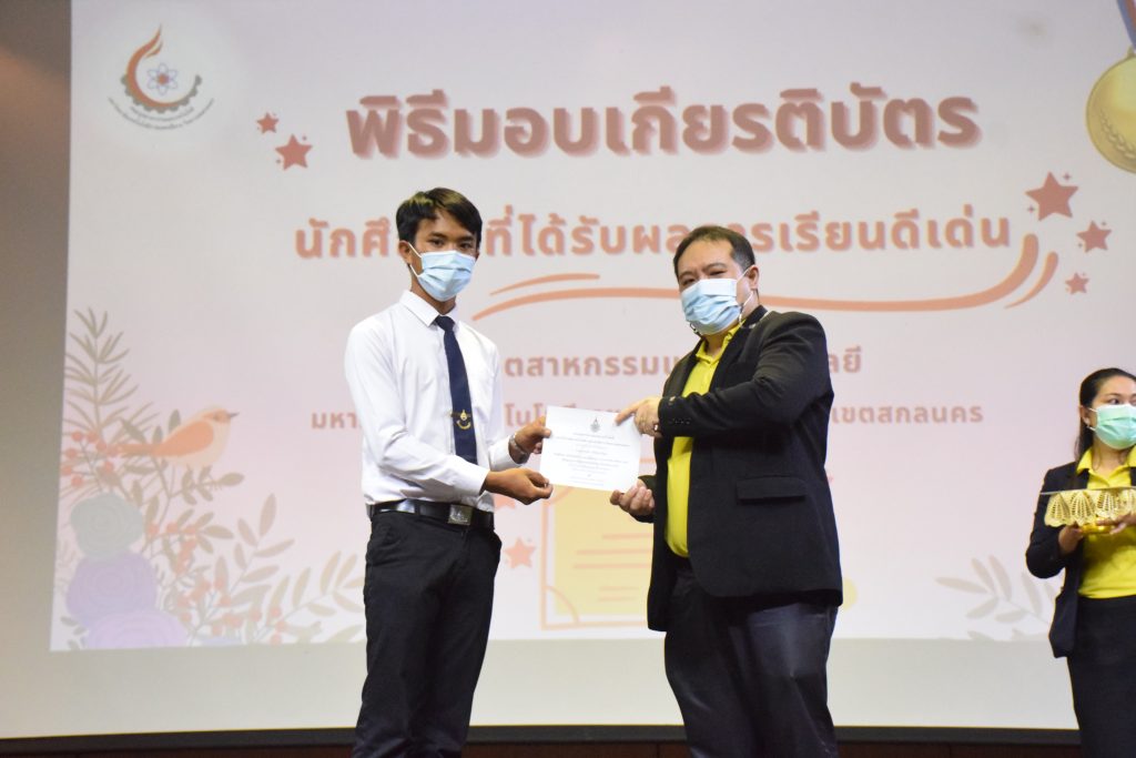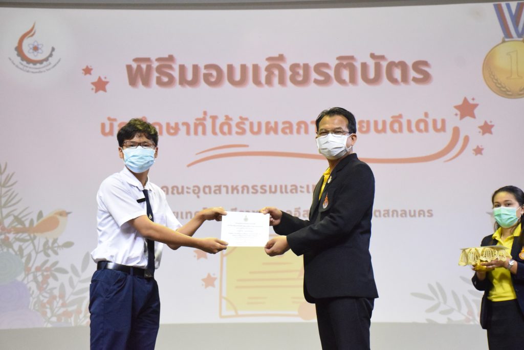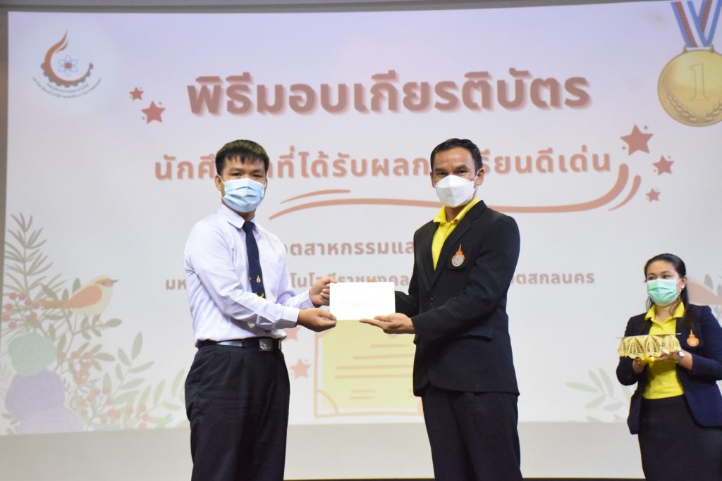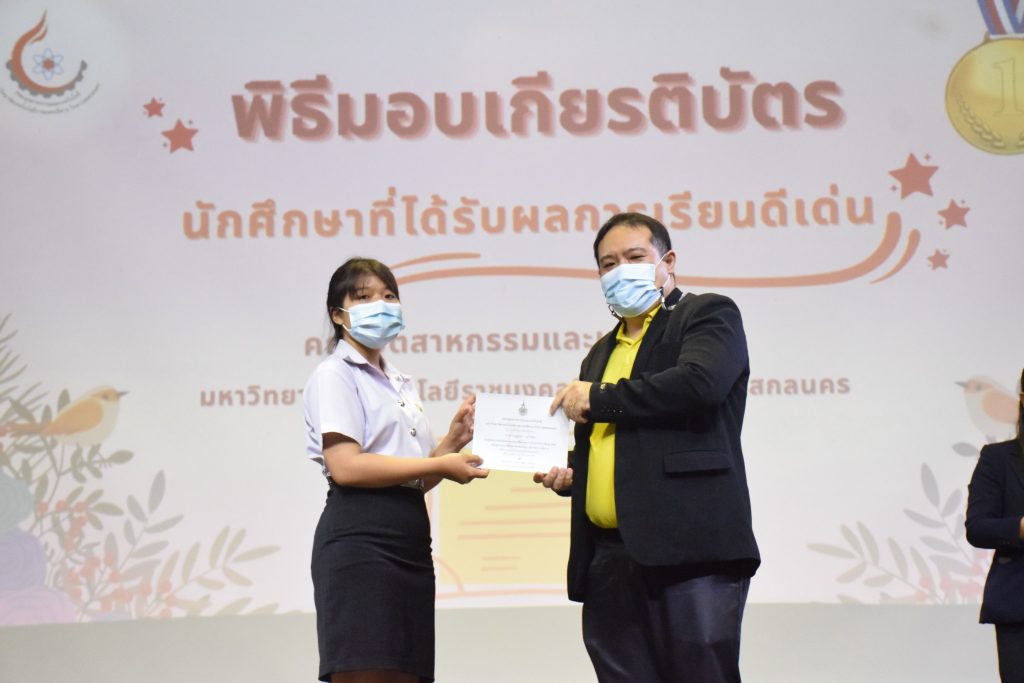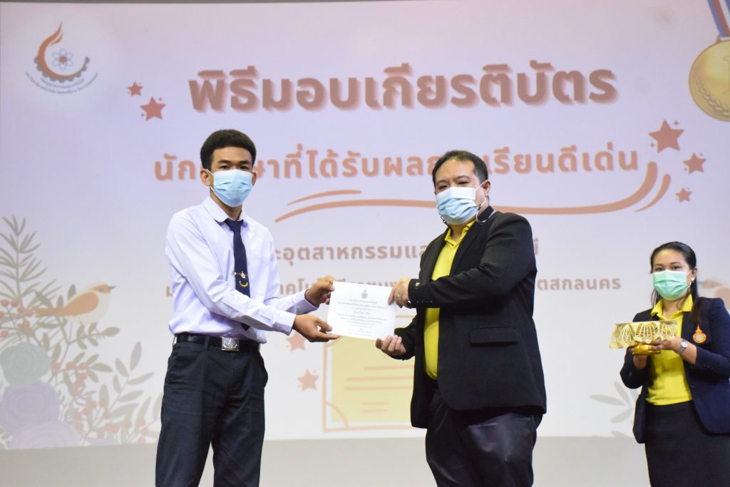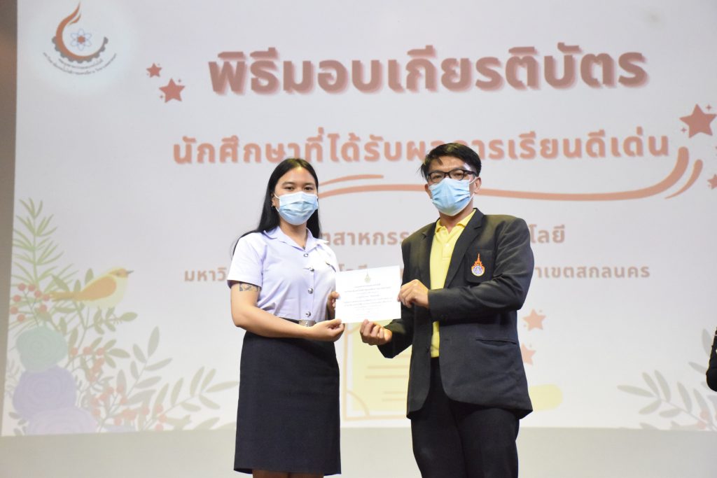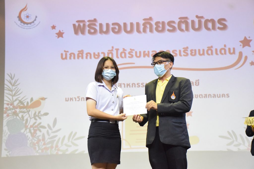 วันที่ 19 กรกฎาคม 2565 คณะอุตสาหกรรมและเทคโนโลยี มทร.อีสาน วิทยาเขตสกลนคร จัดพิธีมอบเกียรติบัตร แก่นักศึกษาที่มีผลการเรียนดีเด่น ประจำปีการศึกษา 2564 จำนวน 105 คน ณ ห้องประชุมราชมงคล อาคารเรียนรวม มทร.อีสาน วิทยาเขตสกลนคร โดยมีวัตถุประสงค์เพื่อสร้างขวัญกำลังใจให้แก่นักศึกษาที่เรียนดี ประพฤติดี ก่อให้เกิดความภาคภูมิใจในความสำเร็จของตนเอง ส่งเสริมให้นักศึกษามีความใฝ่รู้ใฝ่เรียนเเละพัฒนาตนเองต่อไป ในการนี้ ผศ.ดร.สุริยา แก้วอาษา คณบดีคณะอุตสาหกรรม และเทคโนโลยี ให้เกียรติเป็นประธานในพิธีพร้อมทั้งมอบเกียรติบัตรให้แก่นักศึกษา โดยมีคณะผู้บริหาร คณาจารย์ บุคลากร และนักศึกษา เข้าร่วมพิธีในครั้งนี้โดยพร้อมเพรียงกัน