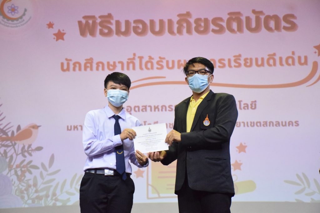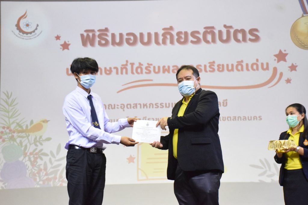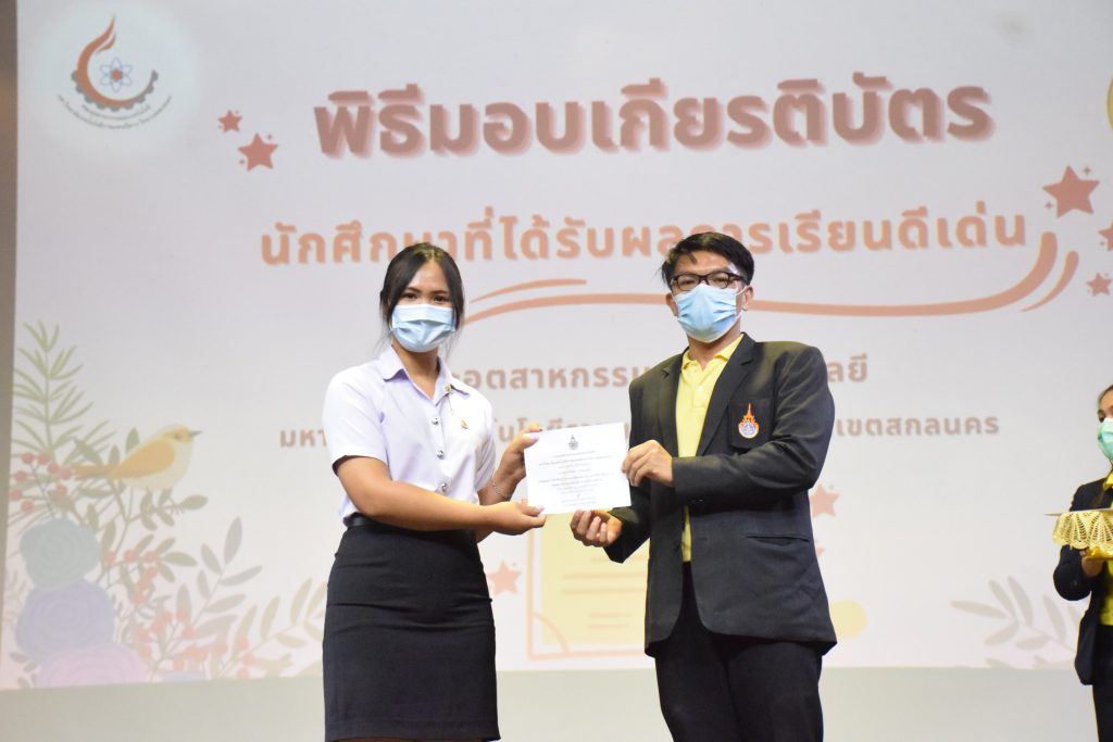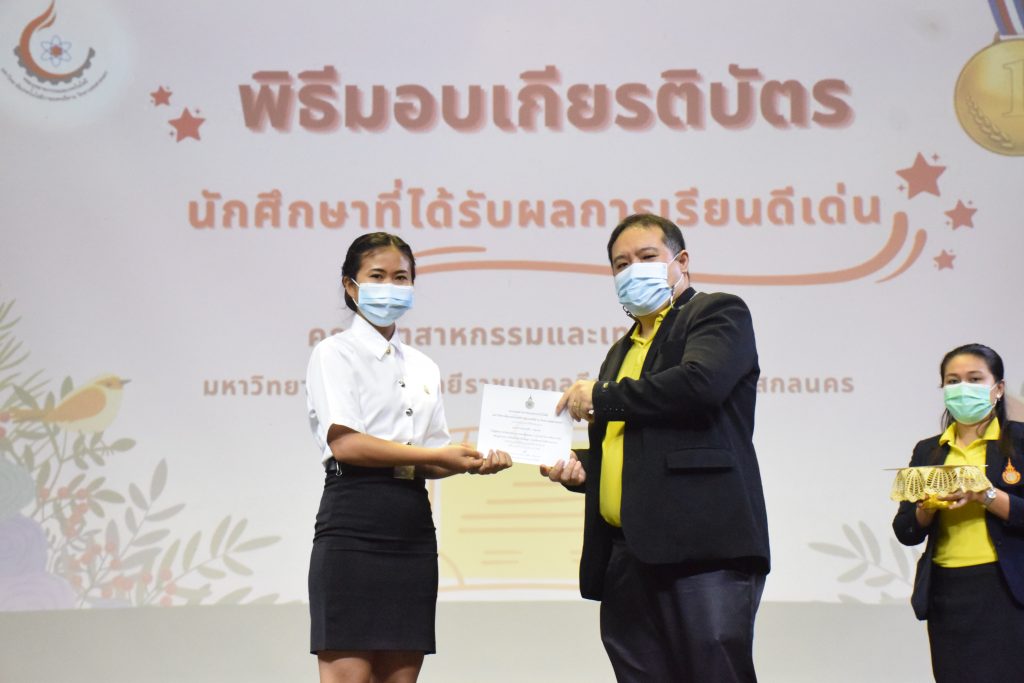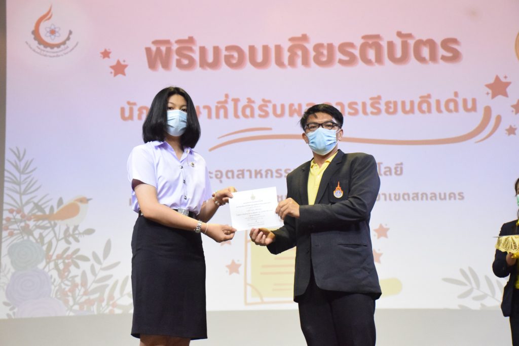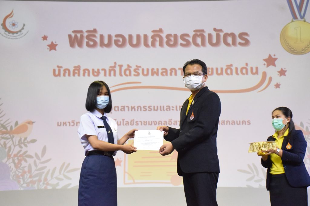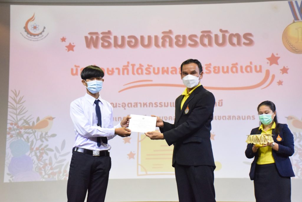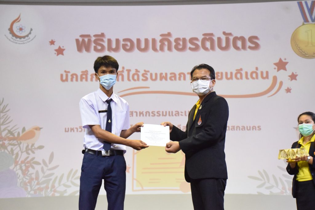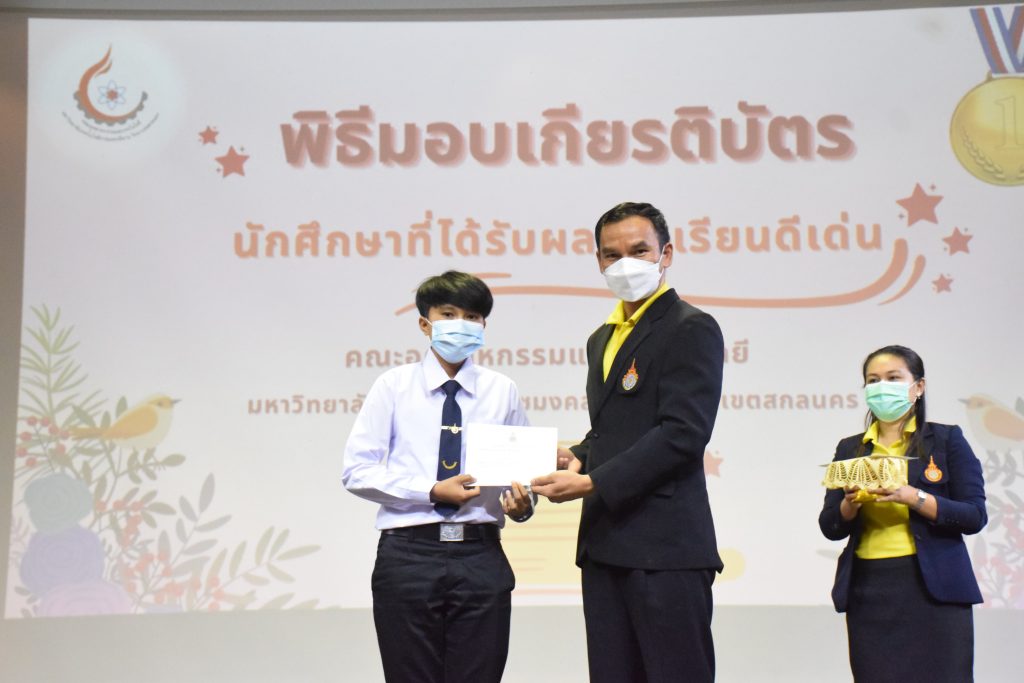 วันที่ 19 กรกฎาคม 2565 คณะอุตสาหกรรมและเทคโนโลยี มทร.อีสาน วิทยาเขตสกลนคร จัดพิธีมอบเกียรติบัตร แก่นักศึกษาที่มีผลการเรียนดีเด่น ประจำปีการศึกษา 2564 จำนวน 105 คน ณ ห้องประชุมราชมงคล อาคารเรียนรวม มทร.อีสาน วิทยาเขตสกลนคร โดยมีวัตถุประสงค์เพื่อสร้างขวัญกำลังใจให้แก่นักศึกษาที่เรียนดี ประพฤติดี ก่อให้เกิดความภาคภูมิใจในความสำเร็จของตนเอง ส่งเสริมให้นักศึกษามีความใฝ่รู้ใฝ่เรียนเเละพัฒนาตนเองต่อไป ในการนี้ ผศ.ดร.สุริยา แก้วอาษา คณบดีคณะอุตสาหกรรม และเทคโนโลยี ให้เกียรติเป็นประธานในพิธีพร้อมทั้งมอบเกียรติบัตรให้แก่นักศึกษา โดยมีคณะผู้บริหาร คณาจารย์ บุคลากร และนักศึกษา เข้าร่วมพิธีในครั้งนี้โดยพร้อมเพรียงกัน