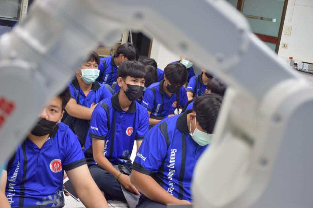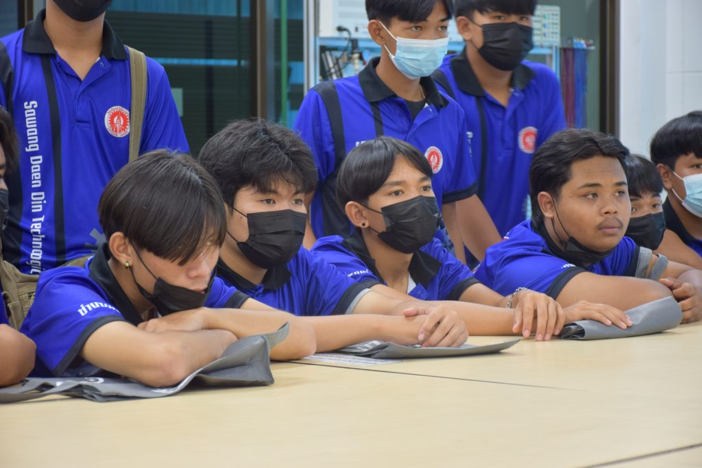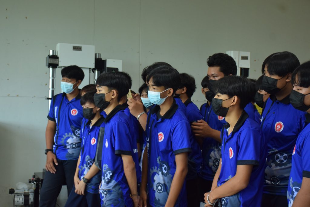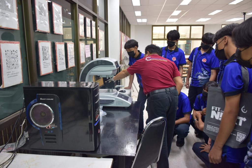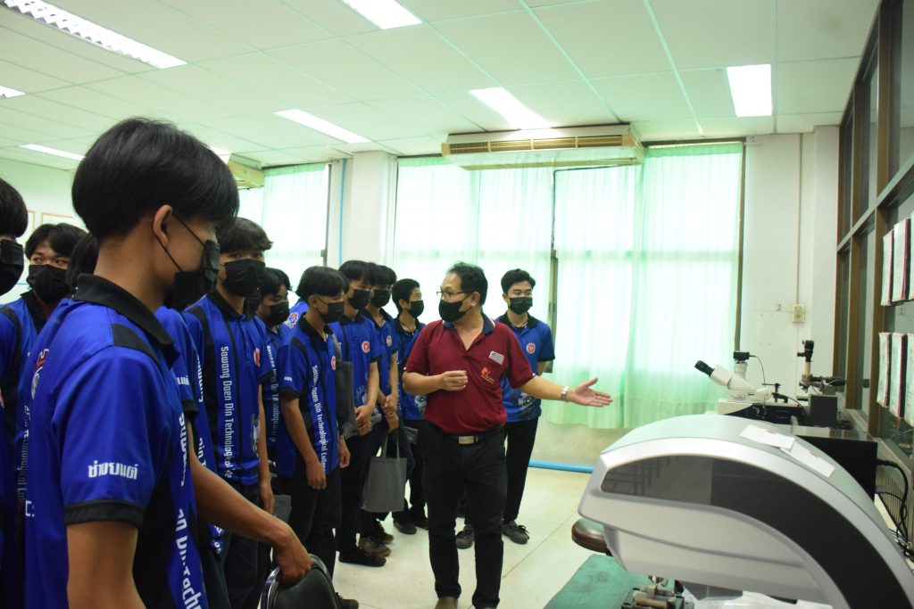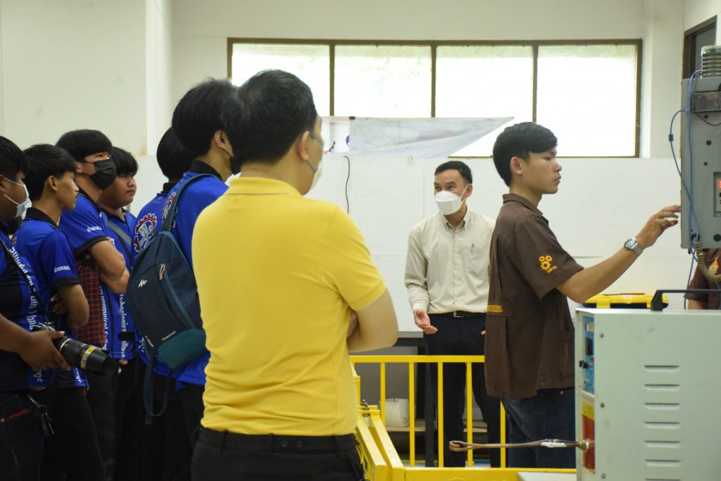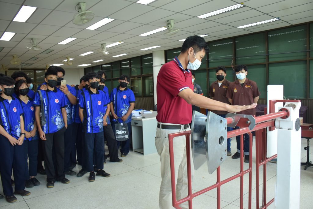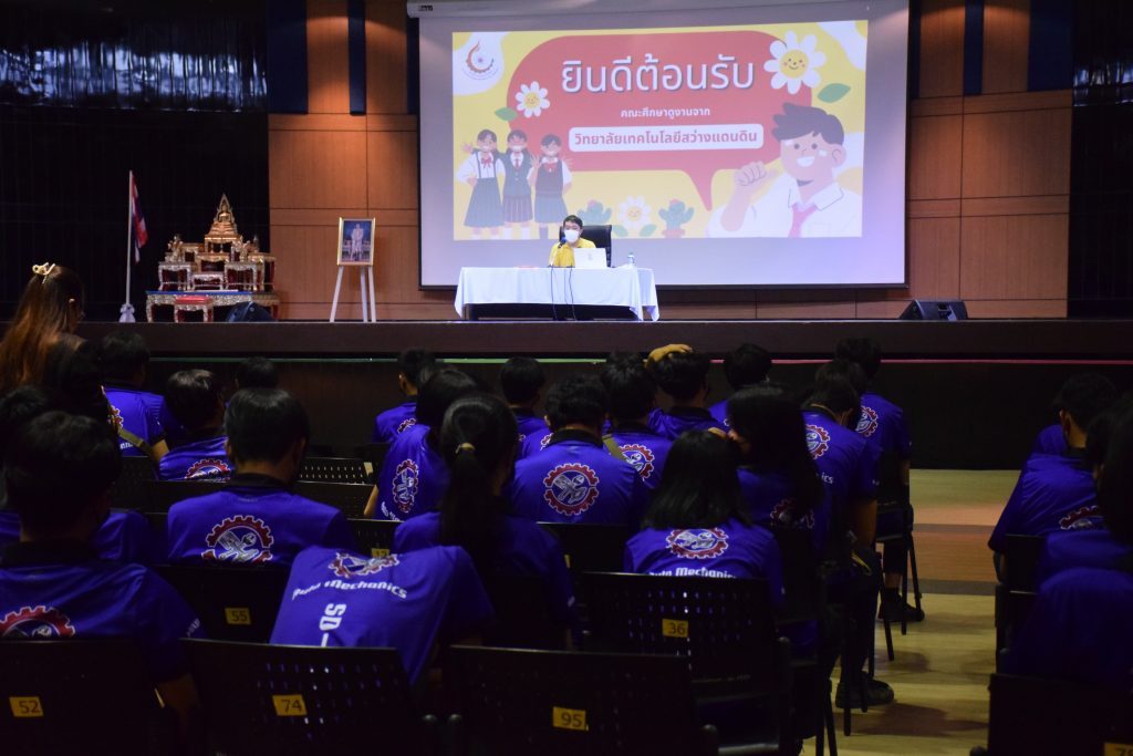 วันที่ 23 สิงหาคม 2565 คณะอุตสาหกรรมและเทคโนโลยี นำโดย ผศ.ดร.สุริยา แก้วอาษา คณบดีคณะอุตสาหกรรมและเทคโนโลยี พร้อมด้วยผู้บริหาร คณาจารย์ และเจ้าหน้าที่ ร่วมต้อนรับคณะศึกษาดูงานจากวิทยาลัยเทคโนโลยีสว่างแดนดิน จำนวน 217 คน ในโอกาสเข้าศึกษาดูงาน ณ สาขาวิศวกรรมเครื่องกล และสาขาวิศวกรรมอุตสาหการ เพื่อให้นักศึกษาได้รับความรู้ ได้ฝึกปฏิบัติ ได้รับประสบการณ์จากแหล่งเรียนรู้ใหม่ๆ โดยทางคณะได้แบ่งฐานการเรียนรู้ออกเป็น 8 ฐาน ประกอบด้วย ฐานที่ 1 ห้องปฏิบัติงานเครื่องจักรอัตโนมัติ ฐานที่ 2 ห้องปฏิบัติการการกระแทก ฐานที่ 3 โรงกลั่นน้ำมันหอมระเหย ฐานที่ 4 ห้องปฏิบัติการโลหะวิทยา ฐานที่ 5 ห้องปฏิบัติงานวัดละเอียด ฐานที่ 6 ห้องปฏิบัติงานทดสอบวัสดุ ฐานที่ 7 ห้องปฏิบัติการนิวเเมติกส์ และ ฐานที่ 8 ห้องปฎิบัติการหุ่นยนต์อุตสาหกรรม โดยในแต่ละฐานจะมีอาจารย์ประจำฐานบรรยายให้ความรู้ พร้อมทั้งให้นักศึกษาได้ทดลองฝึกปฏิบัติอีกด้วย
