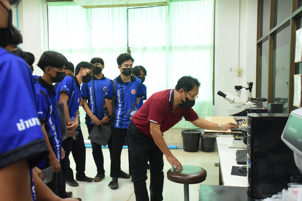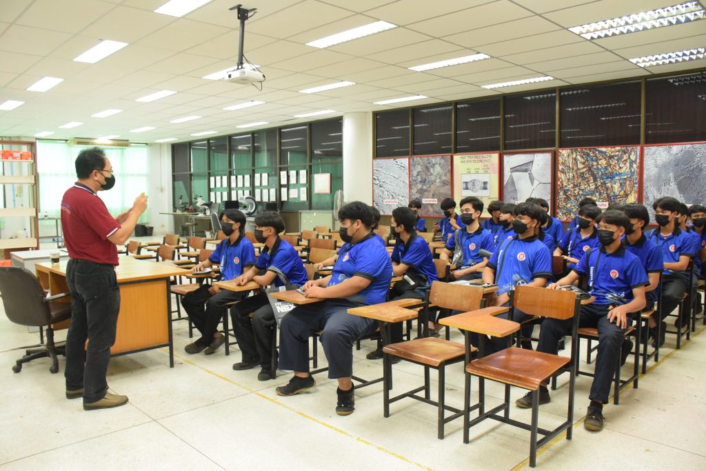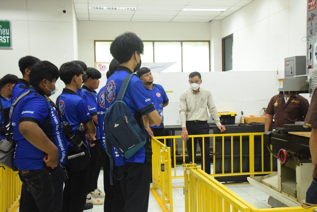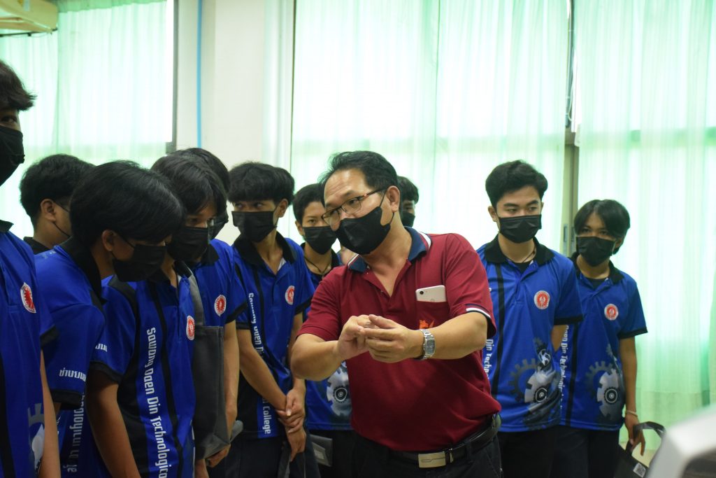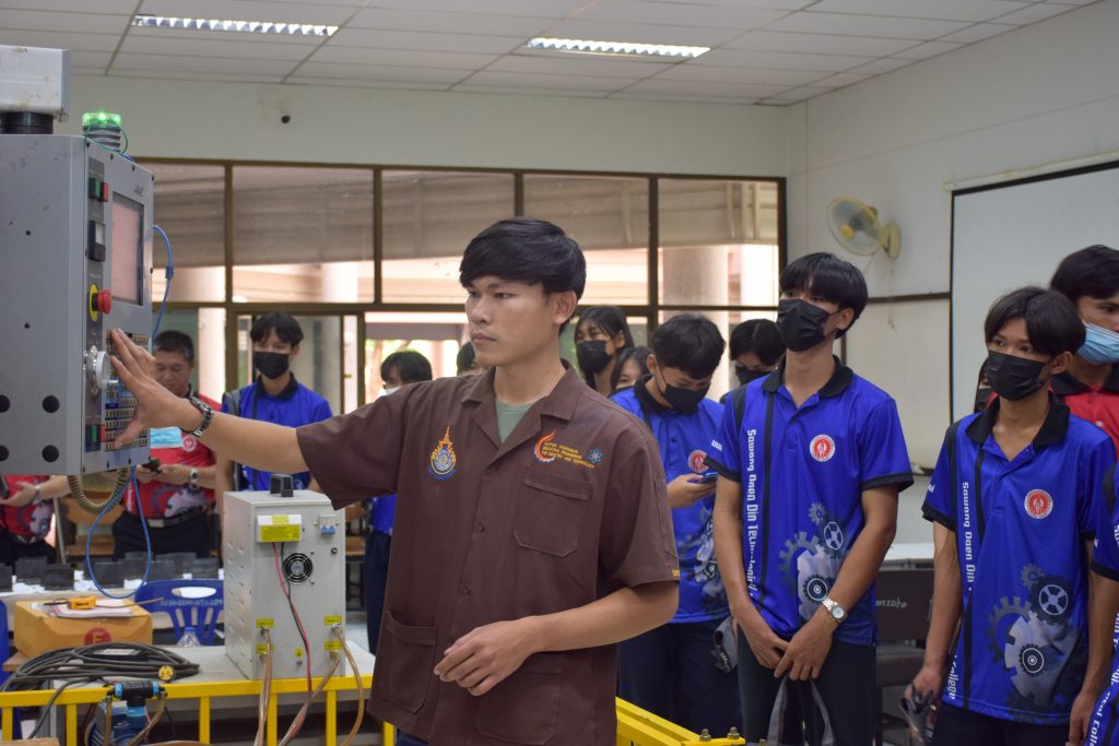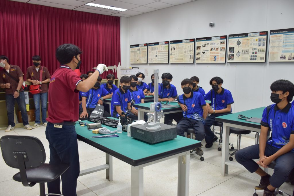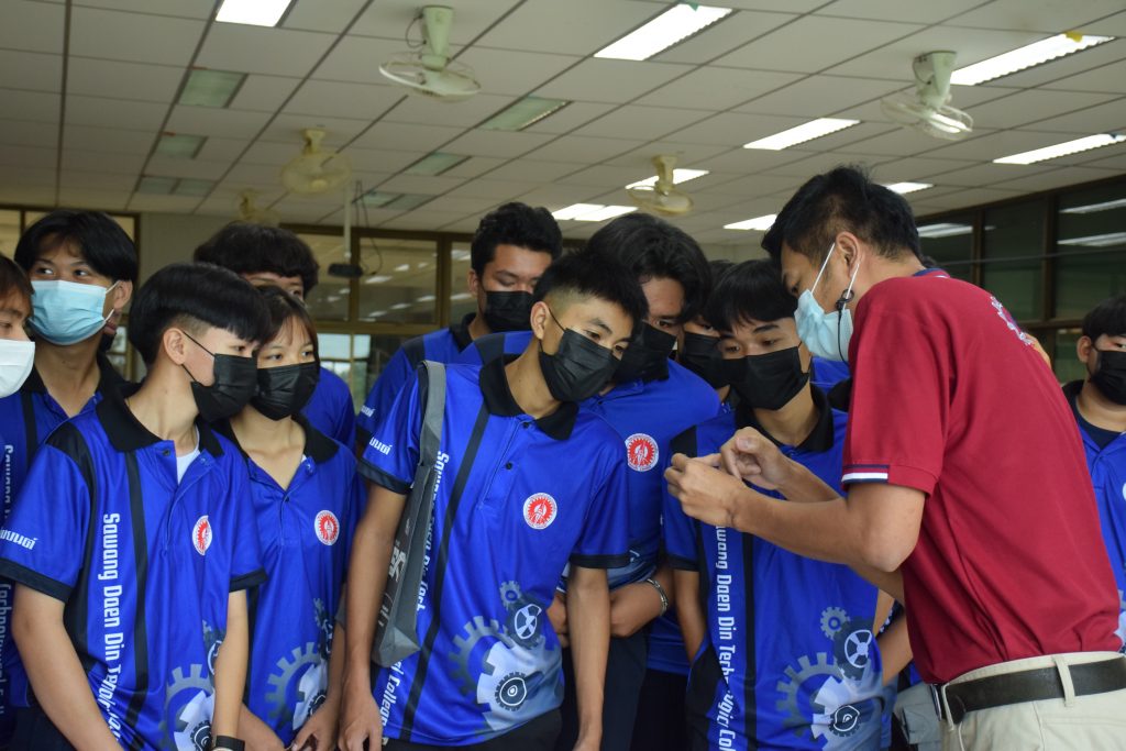 วันที่ 23 สิงหาคม 2565 คณะอุตสาหกรรมและเทคโนโลยี นำโดย ผศ.ดร.สุริยา แก้วอาษา คณบดีคณะอุตสาหกรรมและเทคโนโลยี พร้อมด้วยผู้บริหาร คณาจารย์ และเจ้าหน้าที่ ร่วมต้อนรับคณะศึกษาดูงานจากวิทยาลัยเทคโนโลยีสว่างแดนดิน จำนวน 217 คน ในโอกาสเข้าศึกษาดูงาน ณ สาขาวิศวกรรมเครื่องกล และสาขาวิศวกรรมอุตสาหการ เพื่อให้นักศึกษาได้รับความรู้ ได้ฝึกปฏิบัติ ได้รับประสบการณ์จากแหล่งเรียนรู้ใหม่ๆ โดยทางคณะได้แบ่งฐานการเรียนรู้ออกเป็น 8 ฐาน ประกอบด้วย ฐานที่ 1 ห้องปฏิบัติงานเครื่องจักรอัตโนมัติ ฐานที่ 2 ห้องปฏิบัติการการกระแทก ฐานที่ 3 โรงกลั่นน้ำมันหอมระเหย ฐานที่ 4 ห้องปฏิบัติการโลหะวิทยา ฐานที่ 5 ห้องปฏิบัติงานวัดละเอียด ฐานที่ 6 ห้องปฏิบัติงานทดสอบวัสดุ ฐานที่ 7 ห้องปฏิบัติการนิวเเมติกส์ และ ฐานที่ 8 ห้องปฎิบัติการหุ่นยนต์อุตสาหกรรม โดยในแต่ละฐานจะมีอาจารย์ประจำฐานบรรยายให้ความรู้ พร้อมทั้งให้นักศึกษาได้ทดลองฝึกปฏิบัติอีกด้วย