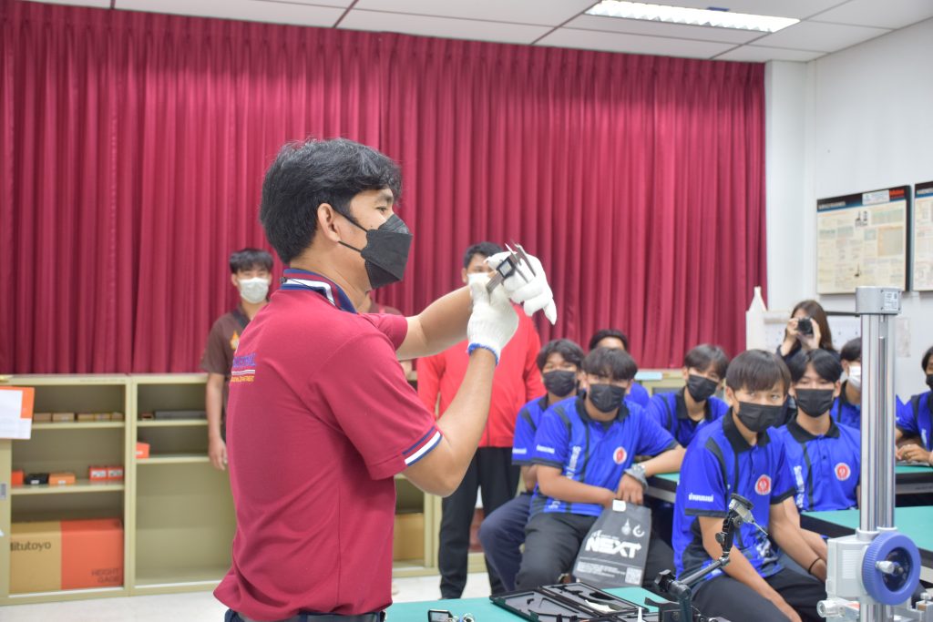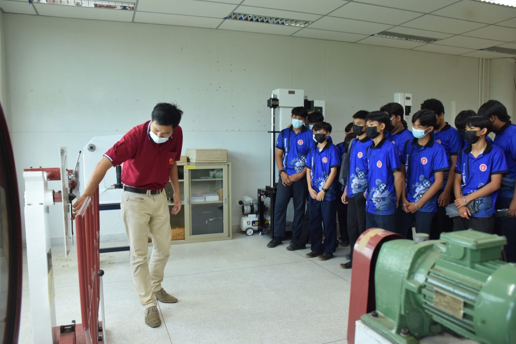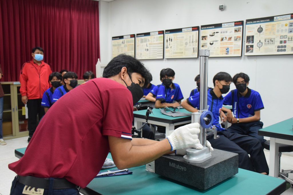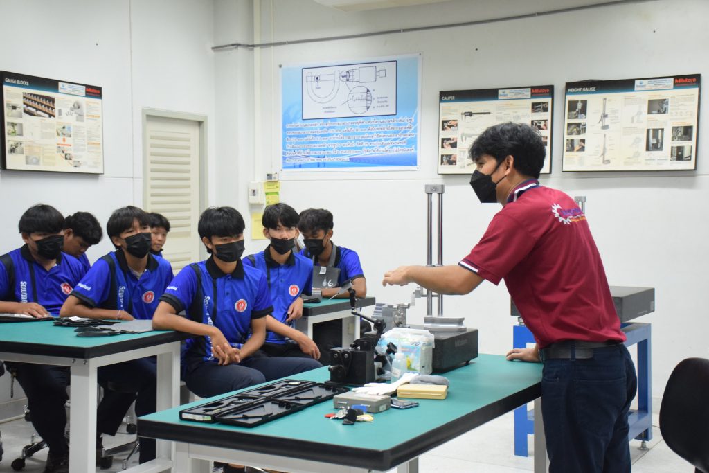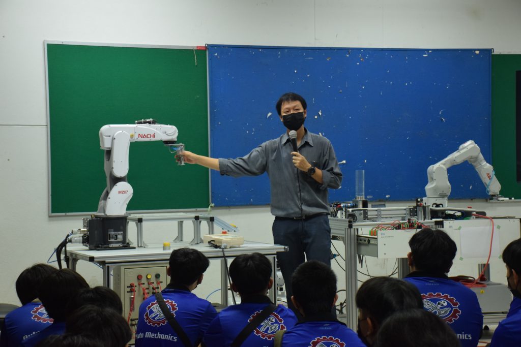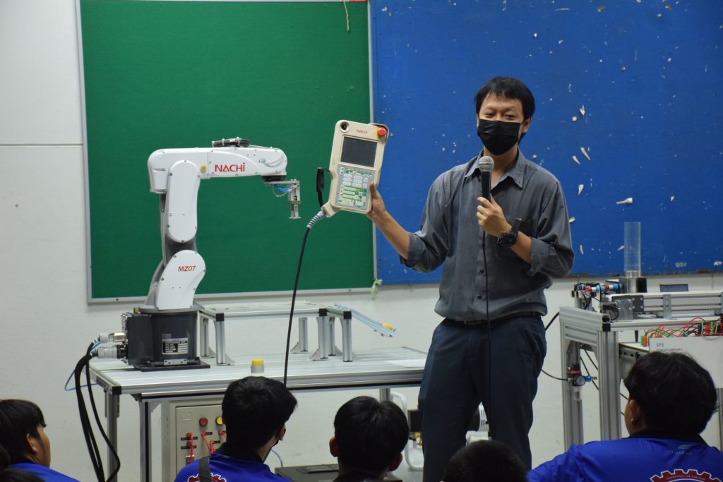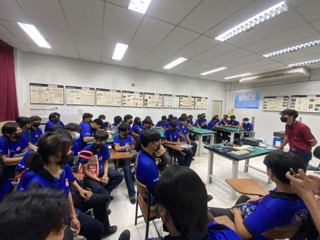วันที่ 23 สิงหาคม 2565 คณะอุตสาหกรรมและเทคโนโลยี นำโดย ผศ.ดร.สุริยา แก้วอาษา คณบดีคณะอุตสาหกรรมและเทคโนโลยี พร้อมด้วยผู้บริหาร คณาจารย์ และเจ้าหน้าที่ ร่วมต้อนรับคณะศึกษาดูงานจากวิทยาลัยเทคโนโลยีสว่างแดนดิน จำนวน 217 คน ในโอกาสเข้าศึกษาดูงาน ณ สาขาวิศวกรรมเครื่องกล และสาขาวิศวกรรมอุตสาหการ เพื่อให้นักศึกษาได้รับความรู้ ได้ฝึกปฏิบัติ ได้รับประสบการณ์จากแหล่งเรียนรู้ใหม่ๆ โดยทางคณะได้แบ่งฐานการเรียนรู้ออกเป็น 8 ฐาน ประกอบด้วย ฐานที่ 1 ห้องปฏิบัติงานเครื่องจักรอัตโนมัติ ฐานที่ 2 ห้องปฏิบัติการการกระแทก ฐานที่ 3 โรงกลั่นน้ำมันหอมระเหย ฐานที่ 4 ห้องปฏิบัติการโลหะวิทยา ฐานที่ 5 ห้องปฏิบัติงานวัดละเอียด ฐานที่ 6 ห้องปฏิบัติงานทดสอบวัสดุ ฐานที่ 7 ห้องปฏิบัติการนิวเเมติกส์ และ ฐานที่ 8 ห้องปฎิบัติการหุ่นยนต์อุตสาหกรรม โดยในแต่ละฐานจะมีอาจารย์ประจำฐานบรรยายให้ความรู้ พร้อมทั้งให้นักศึกษาได้ทดลองฝึกปฏิบัติอีกด้วย