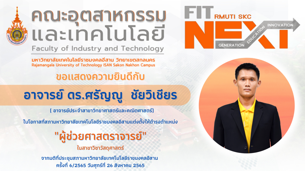 ขอเเสดงความยินดีกับ อาจารย์ ดร.ศรัญญู ชัยวิเชียร (อาจารย์ประจำสาขาวิทยาศาสตร์และคณิตศาสตร์) ในโอกาสที่สภามหาวิทยาลัยเทคโนโลยีราชมงคลอีสานแต่งตั้งให้ดำรงตำแหน่ง”ผู้ช่วยศาสตราจารย์” ในสาขาวิชาวัสดุศาสตร์ จากมติที่ประชุมสภามหาวิทยาลัยเทคโนโลยีราชมงคลอีสาน ครั้งที่ 6/2565 วันศุกร์ที่ 26 สิงหาคม 2565