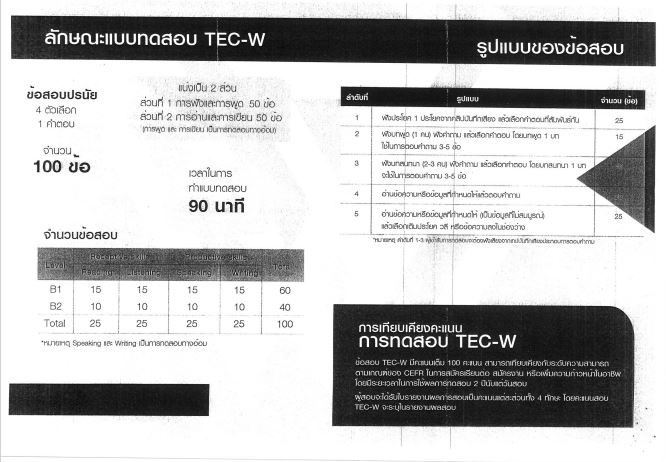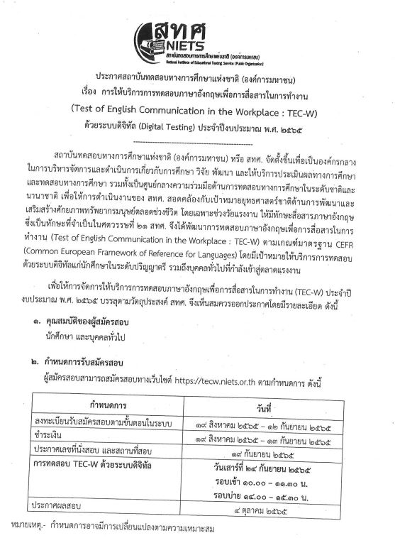 ประชาสัมพันธืเชิญชวน นักศึกษาและบุคลากรที่สนใจ เข้าร่วมการทดสอบภาษาอังกฤษเพื่อการสื่อสารในการทำงาน (TEC-W) ด้วยระบบดิจิทัล โดยมีอัตราค่าธรรมเนียม สำหรับนักศึกษา 300 บาท และบุคคลทั่วไป 600 บาท เปิดรับสมัครแล้ววันนี้ ถึง วันที่ 12 กันยายน 2565 ดูลายละเอียดเพิ่มเติมได้ที่ https://www.niets.or.th/th