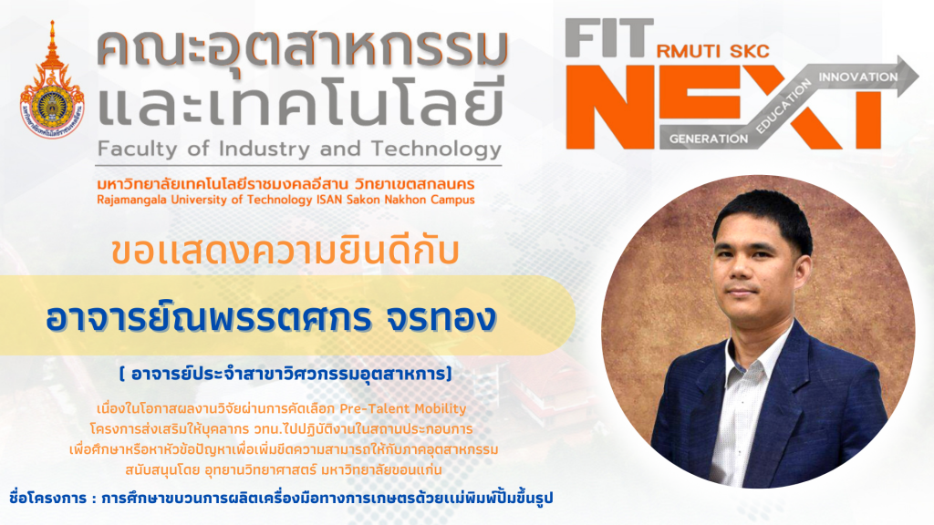 ขอเเสดงความยินดีกับ อาจารย์ณพรรตศกร จรทอง ( อาจารย์ประจำสาขาวิศวกรรมอุตสาหการ) เนื่องในโอกาสผลงานวิจัยผ่านการคัดเลือก Pre-Talent Mobility โครงการส่งเสริมให้บุคลากร วทน.ไปปฏิบัติงานในสถานประกอบการ เพื่อศึกษาหรือหาหัวข้อปัญหาเพื่อเพิ่มขีดความสามารถให้กับภาคอุตสาหกรรม สนับสนุนโดย อุทยานวิทยาศาสตร์ มหาวิทยาลัยขอนแก่น ชื่อโครงการ : การศึกษาขบวนการผลิตเครื่องมือทางการเกษตรด้วยเเม่พิมพ์ปั้มขึ้นรูป