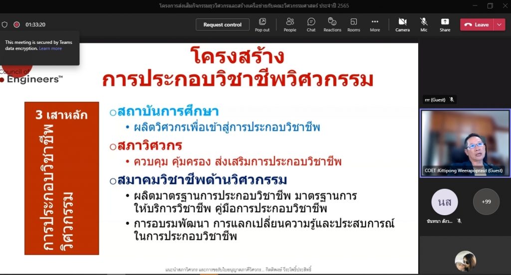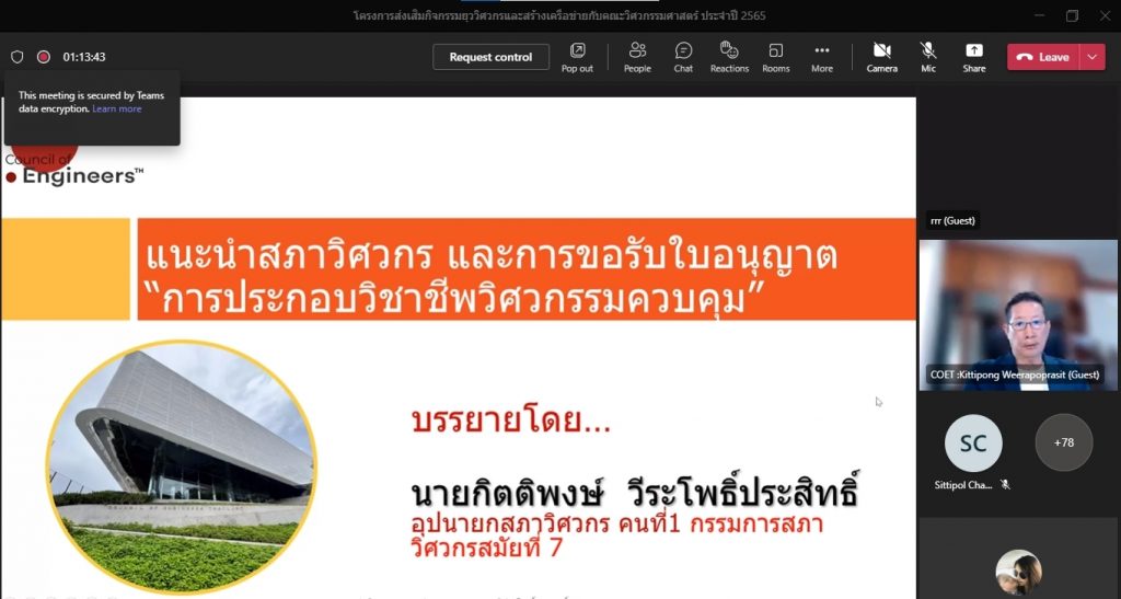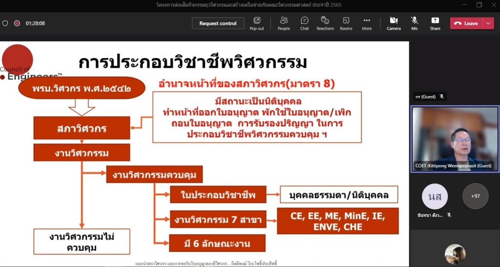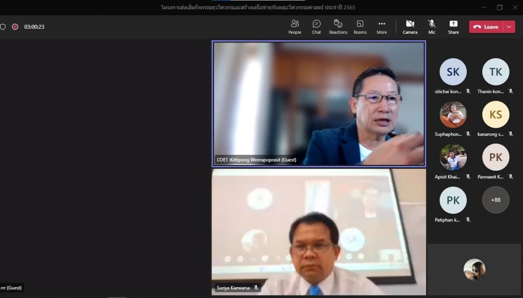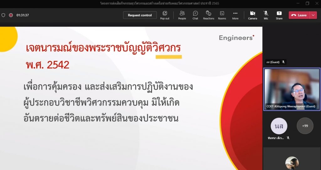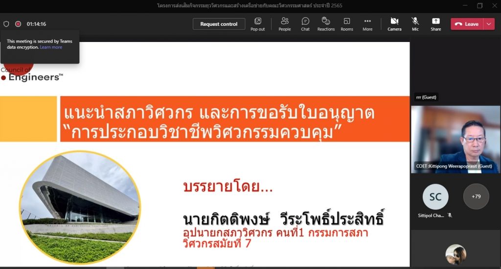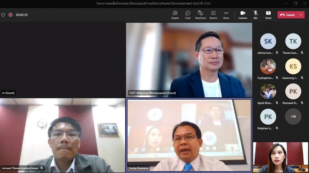 วันที่ 16 พฤศจิกายน 2565 คณะอุตสาหกรรมและเทคโนโลยี จัดโครงการส่งเสริมกิจกรรมยุววิศวกรและสร้างเครือข่ายกับคณะวิศวกรรมศาสตร์ ประจำปี 2565 ผ่านระบบออนไลน์โปรแกรม.Microsoft.Teams โดยมีวัตถุประสงค์เพื่อให้นักศึกษาทราบวิธีการและขั้นตอน การขอรับใบอนุญาตประกอบวิชาชีพวิศวกรรมควบคุม แนะนำวิธีการปฏิบัติตนก่อนเข้าสู่วิชาชีพวิศวกรรม และการมีจรรยาบรรณในวิชาชีพ พร้อมทั้งยังช่วยสร้างเครือข่ายวิศวกรอีกด้วย โดยได้รับเกียรติจาก คุณกิตติพงษ์ วีระโพธิ์ประสิทธิ์ อุปนายกสภาวิศวกร คนที่ 1 จากสภาวิศวกร เป็นวิทยากร ในการนี้ ผศ.ดร.สุริยา แก้วอาษา คณบดีคณะอุตสาหกรรมและเทคโนโลยี ให้เกียรติ เป็นประธานในพิธีเปิดโครงการ พร้อมทั้งกล่าวต้อนรับผู้เข้าร่วมโครงการในครั้งนี้ด้วย