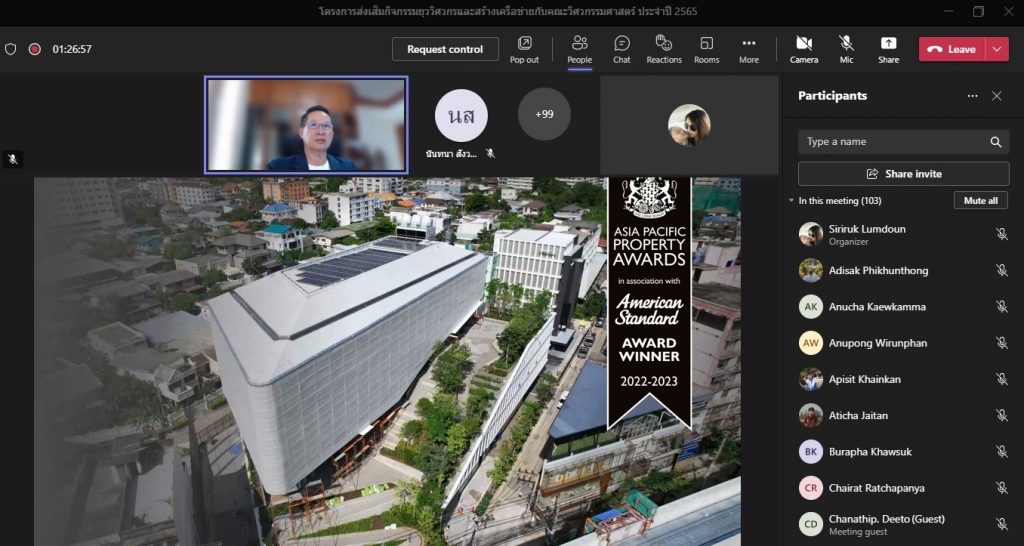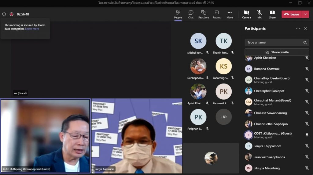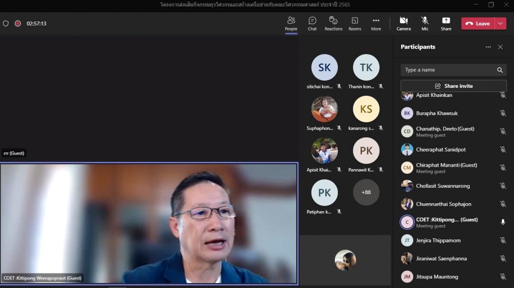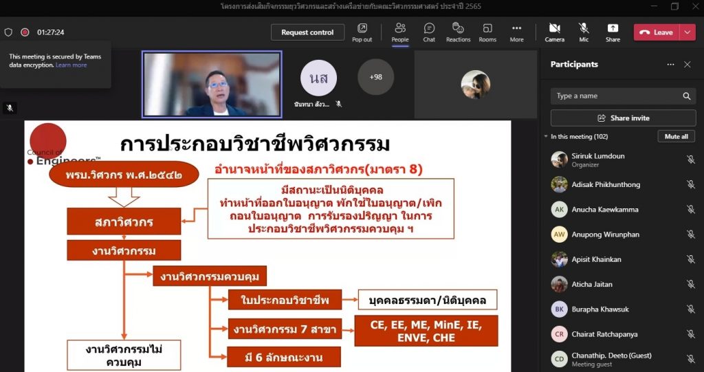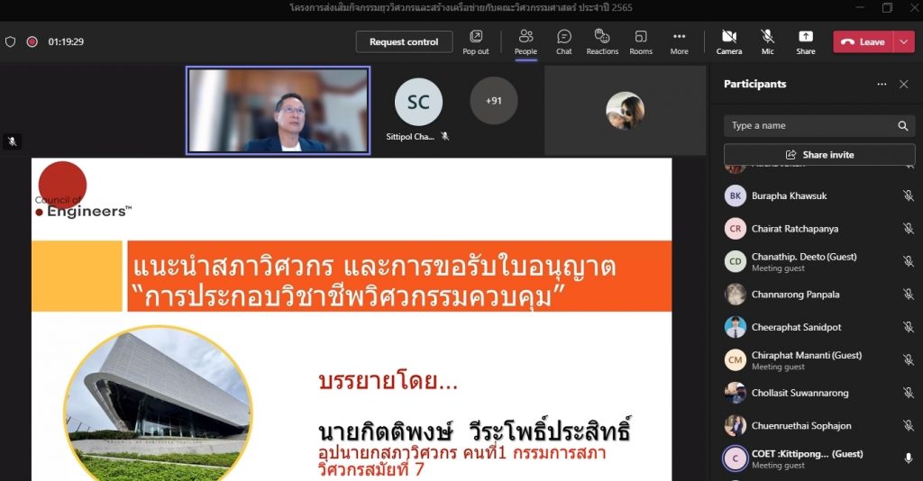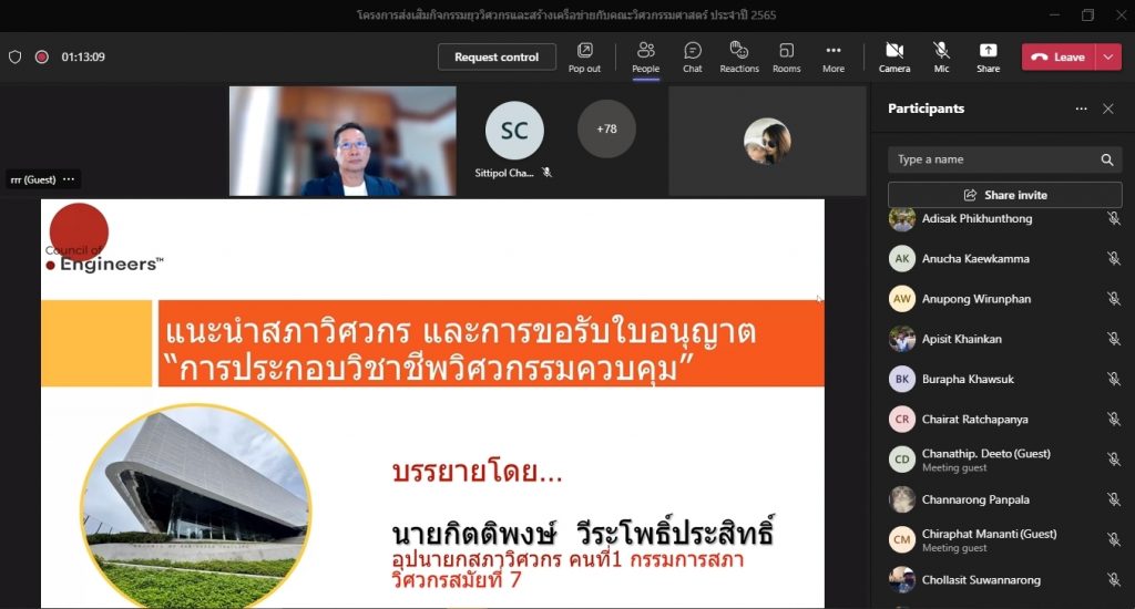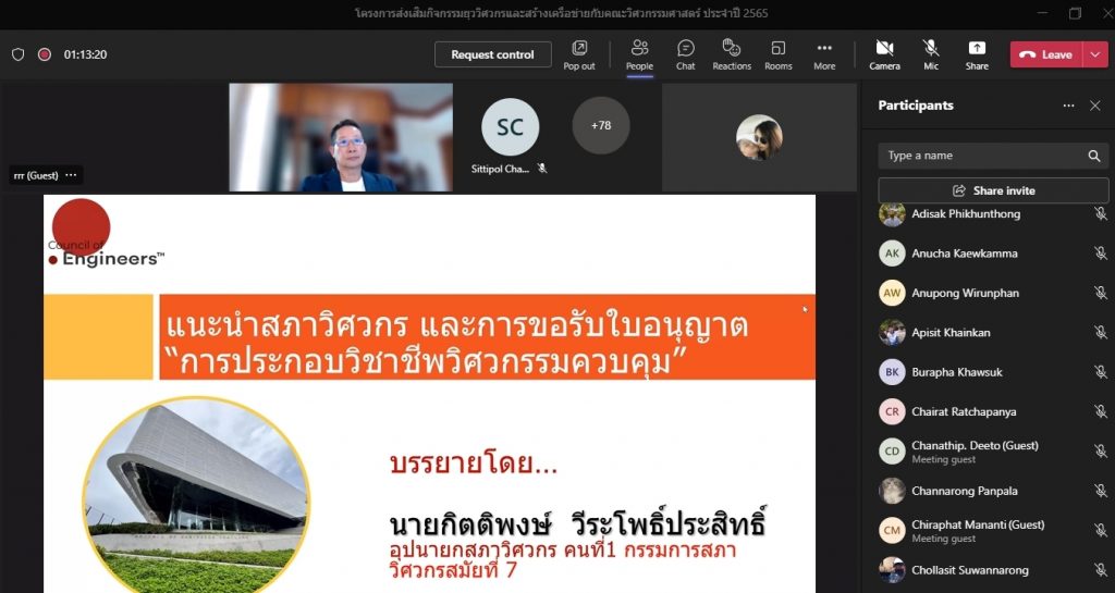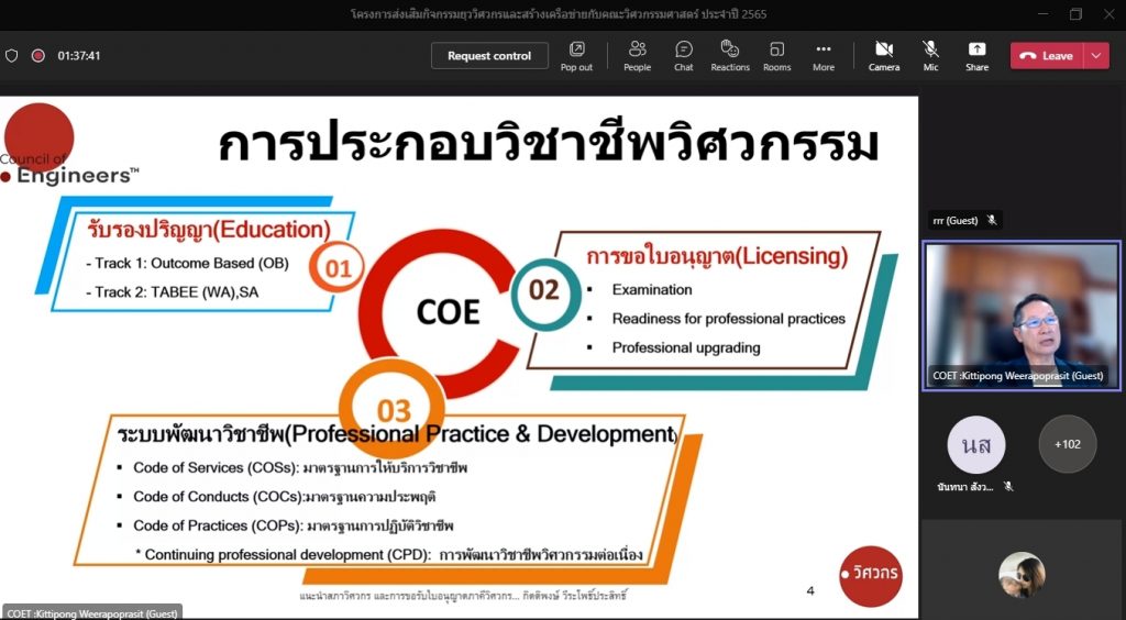 วันที่ 16 พฤศจิกายน 2565 คณะอุตสาหกรรมและเทคโนโลยี จัดโครงการส่งเสริมกิจกรรมยุววิศวกรและสร้างเครือข่ายกับคณะวิศวกรรมศาสตร์ ประจำปี 2565 ผ่านระบบออนไลน์โปรแกรม.Microsoft.Teams โดยมีวัตถุประสงค์เพื่อให้นักศึกษาทราบวิธีการและขั้นตอน การขอรับใบอนุญาตประกอบวิชาชีพวิศวกรรมควบคุม แนะนำวิธีการปฏิบัติตนก่อนเข้าสู่วิชาชีพวิศวกรรม และการมีจรรยาบรรณในวิชาชีพ พร้อมทั้งยังช่วยสร้างเครือข่ายวิศวกรอีกด้วย โดยได้รับเกียรติจาก คุณกิตติพงษ์ วีระโพธิ์ประสิทธิ์ อุปนายกสภาวิศวกร คนที่ 1 จากสภาวิศวกร เป็นวิทยากร ในการนี้ ผศ.ดร.สุริยา แก้วอาษา คณบดีคณะอุตสาหกรรมและเทคโนโลยี ให้เกียรติ เป็นประธานในพิธีเปิดโครงการ พร้อมทั้งกล่าวต้อนรับผู้เข้าร่วมโครงการในครั้งนี้ด้วย