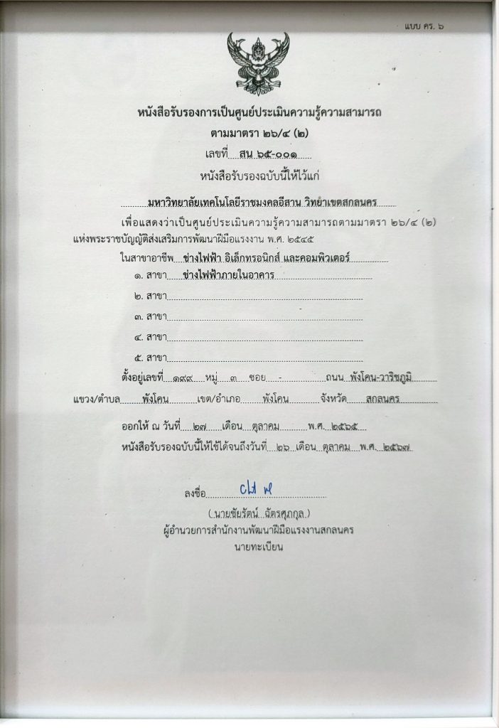 วันที่ 8 ธันวาคม 2565 สำนักงานพัฒนาฝีมือเเรงงานสกลนคร เข้ามอบหนังสือรับรองการเป็นศูนย์ประเมินความรู้ความสามารถ ตามมาตรา 26/4 (2) สาขาช่างไฟฟ้าภายในอาคาร ระดับ 1 ให้แก่มหาวิทยาลัยเทคโนโลยีราชมงคลอีสาน วิทยาเขตสกลนคร ณ ห้องประชุมสำนักงานคณบดี โดยได้รับเกียรติจาก คุณชัยรัตตน์ ฉัตรศุภกุล ผู้อำนวยการสำนักงานพัฒนาฝีมือเเรงงานสกลนคร เป็นผู้มอบหนังสือรับรอง ในการนี้ ผศ.ดร.นำพน พิพัฒน์ไพบูลย์ ผู้ช่วยอธิการบดี ให้เกียรติ เป็นผู้รับมอบหนังสือรับรองในครั้งนี้ โดยมี ผศ.ดร.สุริยา แก้วอาษา คณบดีคณะอุตสาหกรรมและเทคโนโลยี พร้อมด้วยคณะผู้บริหาร คณาจารย์ และเจ้าหน้าที่คณะอุตสาหกรรมและเทคโนโลยี ร่วมต้อนรับ และพาเยี่ยมชมห้องทดสอบความรู้ความสามารถ สาขาช่างเครื่องปรับอากาศในบ้านและการพาณิชย์ขนาดเล็กอีกด้วย