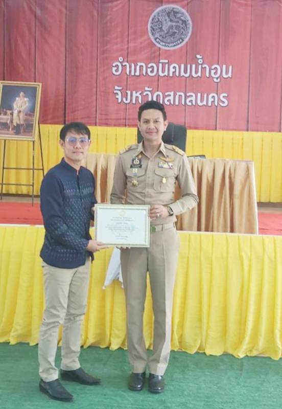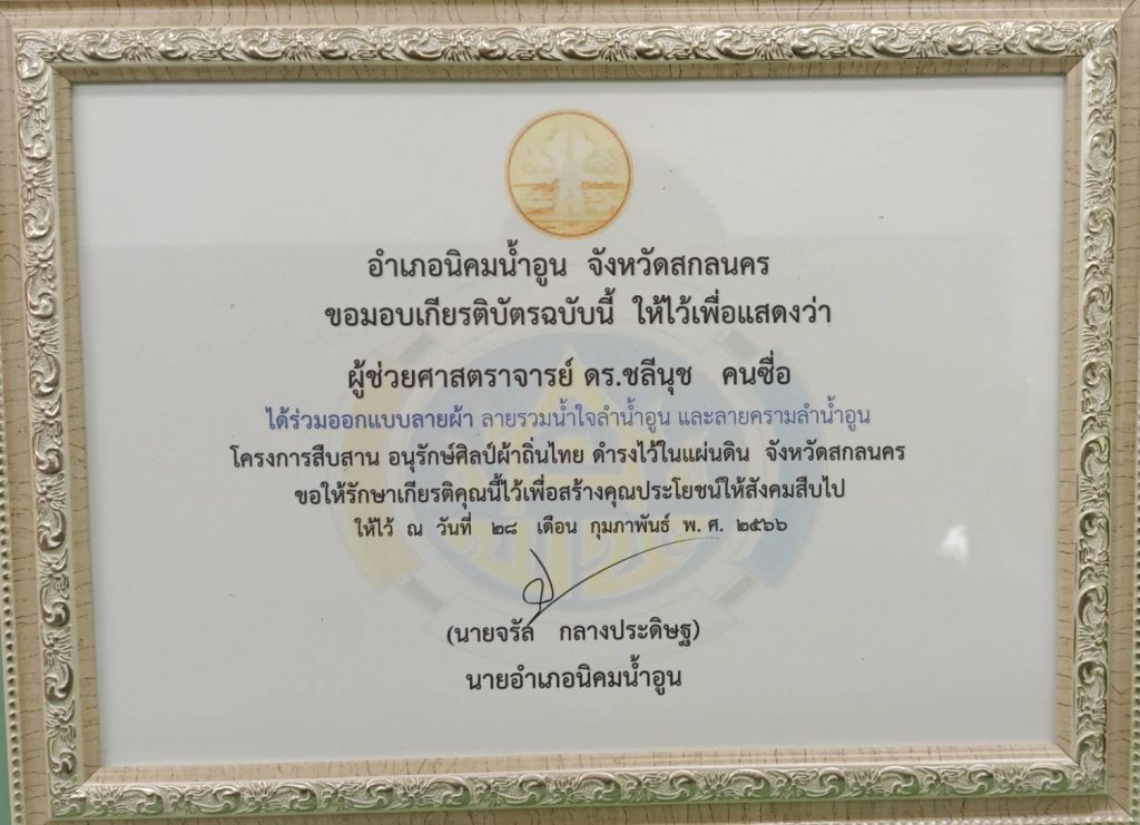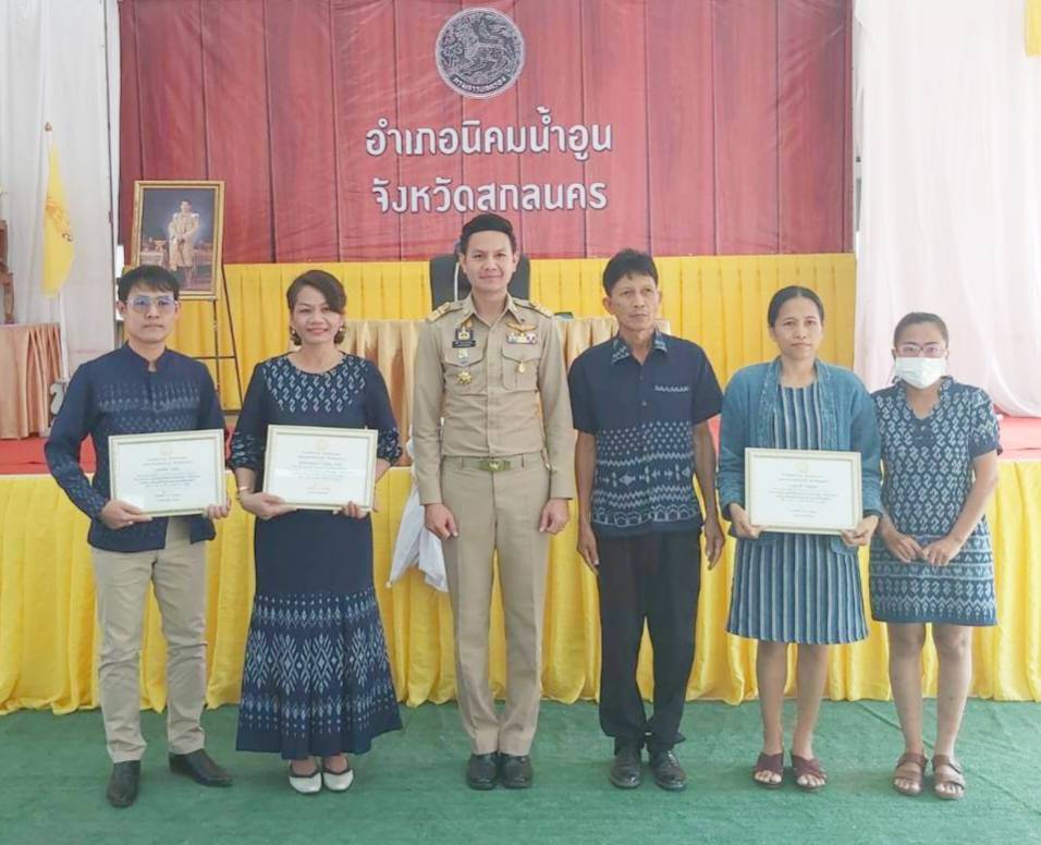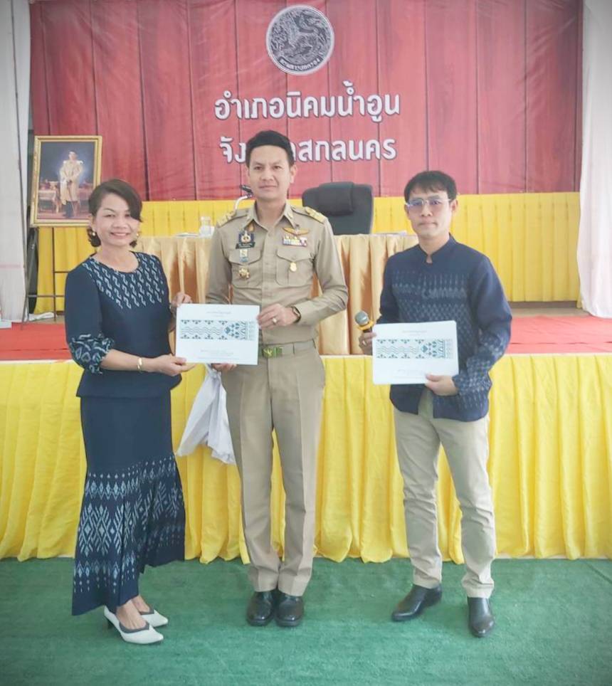 วันที่ 2 มีนาคม 2566 คณาจารย์คณะอุตสาหกรรมและเทคโนโลยี มทร.อีสาน วิทยาเขตสกลนคร นำโดย ผศ.ดร.ชลีนุช คนซื่อ อาจารย์มานิตย์ สานอก อาจารย์ และดร.อนุชาวดี ไชยทองศรี เข้ารับเกียรติบัตรผู้ร่วมออกแบบลายผ้าอัตลักษณ์อำเภอนิคมน้ำอูน จังหวัดสกลนคร จากโครงการสืบสาน อนุรักษ์ศิลป์ผ้าถิ่นไทย ดำรงไว้ในแผ่นดิน จังหวัดสกลนคร ซึ่งได้ร่วมออกแบบลายผ้าจำนวน 2 ลาย ได้แก่ ลายรวมน้ำใจลำน้ำอูน และลายรวมน้ำใจลำน้ำอูน โดย นายจรัล กลางประดิษฐ์ นายอำเภอนิคมน้ำอูน และนายประจักษ์ อยู่คง พัฒนาการอำเภอนิคมน้ำอูน ให้เกียรติเป็นผู้มอบใบประกาศ ณ หอประชุมอำเภอนิคมน้ำอูน จังหวัดสกลนคร