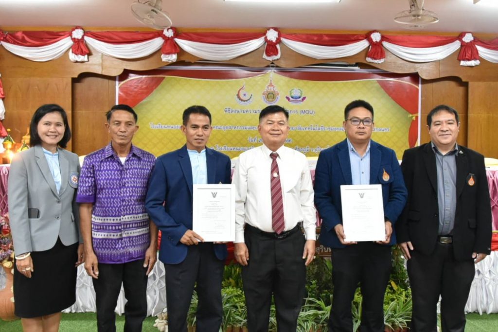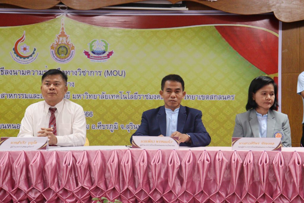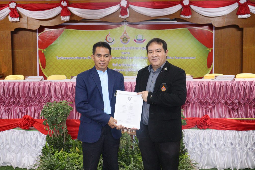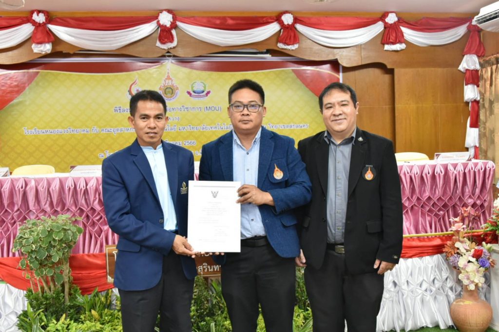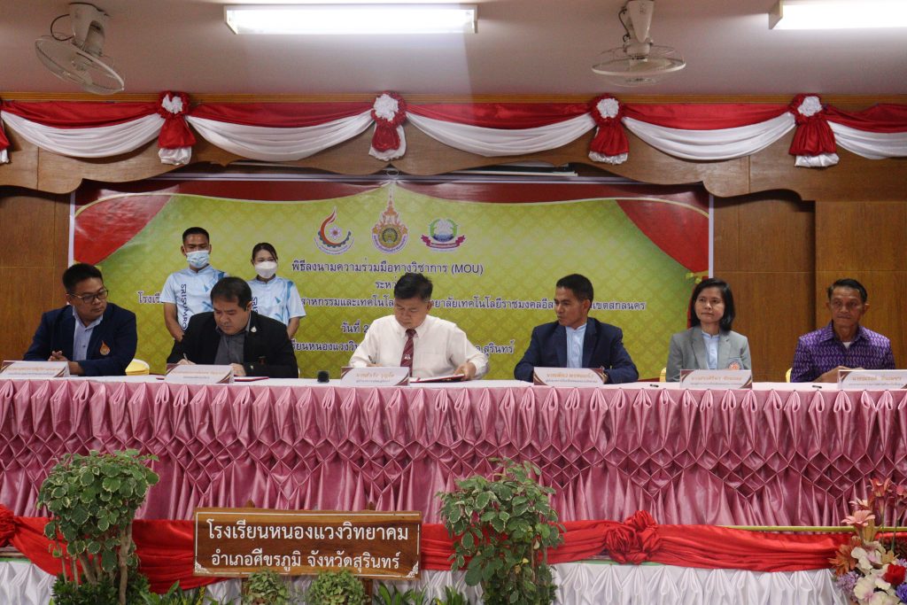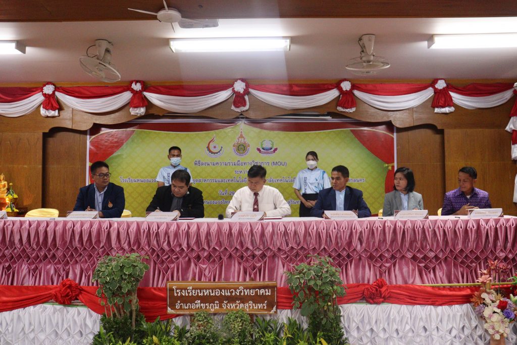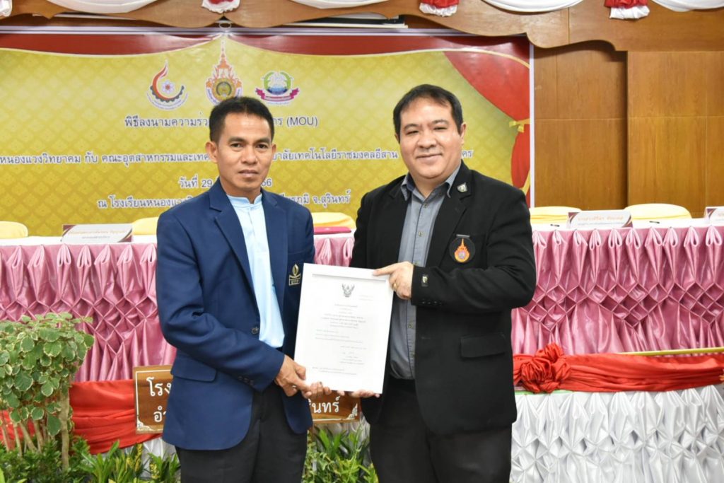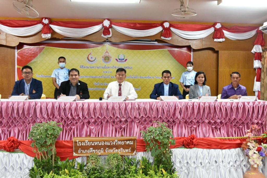 วันที่ 28 มีนาคม 2566 คณะอุตสาหกรรมและเทคโนโลยี มทร.อีสาน วิทยาเขตสกลนคร นำโดย ผศ.ดร.พรเทพ ปัญญาแก้ว รองคณบดีฝ่ายบริหาร เข้าร่วมพิธีลงนามบันทึกข้อตกลงความร่วมมือทางวิชาการ (MoU) ร่วมกับ โรงเรียนหนองแวงวิทยาคม นำโดย นายเพรียว พรหมแก้ว ผู้อำนวยการโรงเรียนหนองแวงวิทยาคม เพื่อร่วมมือในการส่งเสริม สนับสนุนการจัดการเรียนการสอน การวิจัย การทำผลงานทางวิชาการ การบริการวิชาการ และการถ่ายทอดเทคโนโลยีของทั้งสองสถาบันการศึกษา ณ โรงเรียนหนองแวงวิทยาคม บ้านหนองแวง ตำบลผักไหม อำเภอศีขรภูมิ จังหวัดสุรินทร์ โดยมีคณะผู้บริหาร คณาจารย์ และเจ้าหน้าที่ทั้งสองสถาบันเข้าร่วมพิธีในครั้งนี้อย่างพร้อมเพรียงกัน