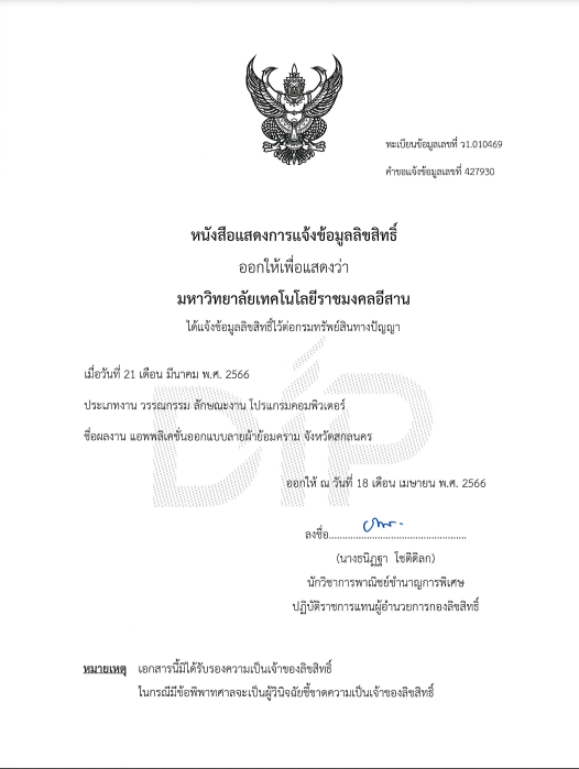 ขอแสดงความยินดีกับ อาจารย์มานิตย์ สานอก ผศ.ดร.ชลีนุช คนซื่อ อาจารย์ ดร.สมพงษ์ วะทันติ อาจารย์ ดร.หทัยรัตน์ หอมไกรลาศ และอาจารย์ ดร.อนุชาวดี ไชยทองศรี คณาจารย์ คณะอุตสาหกรรมและเทคโนโลยี ในโอกาสที่ผลงานได้รับการจดเเจ้งลิขสิทธิ์ กรมทรัพย์สินทางปัญญา ประเภทงาน วรรณกรรม ลักษณะงาน โปรแกรมคอมพิวเตอร์ ผลงาน : แอพพลิเคชั่นออกแบบลายผ้าย้อมคราม จังหวัดสกลนคร