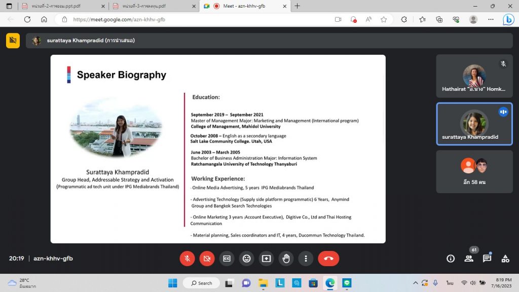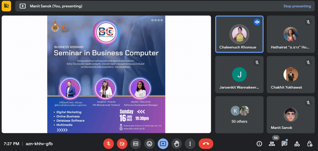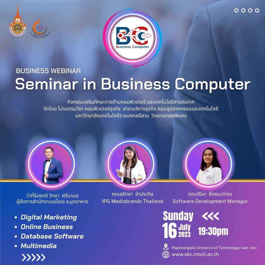 วันที่ 16 กรกฎาคม 2566 โปรแกรมวิชาคอมพิวเตอร์ธุรกิจ คณะอุตสาหกรรมและเทคโนโลยี จัดกิจกรรมเสริมทักษะด้านระบบคอมพิวเตอร์และเทคโนโลยีสารสนเทศ ผ่านระบบออนไลน์ Google Meet เพื่อให้นักศึกษามีความรู้ ความเข้าใจการใช้เทคโนโลยีคอมพิวเตอร์ในงานธุรกิจ พัฒนาทักษะการคิดวิเคราะห์และออกแบบซอฟต์แวร์ และนำไปประยุกต์ใช้ในการเรียนและการทำงานในอนาคตได้ โดยได้รับเกียรติจาก ว่าที่ ร้อยตรี วิทยา ศรีนามล ผู้จัดการสำนักงานเอไอเอ จ.มุกดาหาร ศิษย์เก่าคณะอุตสาหกรรมและเทคโนโลยีคุณสุรัตยา ขำประดิษ IPG Mediabrands Thailand คุณปริษา ยิ่งธนะดำรง Software..Development Manager ผศ.ดร.ชลีนุช คนซื่อ ผศ.ดร.ชารินี ไชยชนะ อาจารย์ ดร.สมพงษ์ วะทันติ อาจารย์ ดร.อนุชาวดี ไชยทองศรี อาจารย์มานิตย์ สานอก อาจารย์กมล ช่วยรักษา อาจารย์ ดร.หทัยรัตน์ หอมไกรลาศ อาจารย์สีตลา วงศ์กาฬสินธุ์ อาจารย์ประจำสาขาบริหารธุรกิจ เป็นวิทยากร