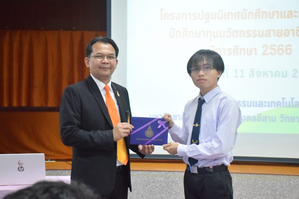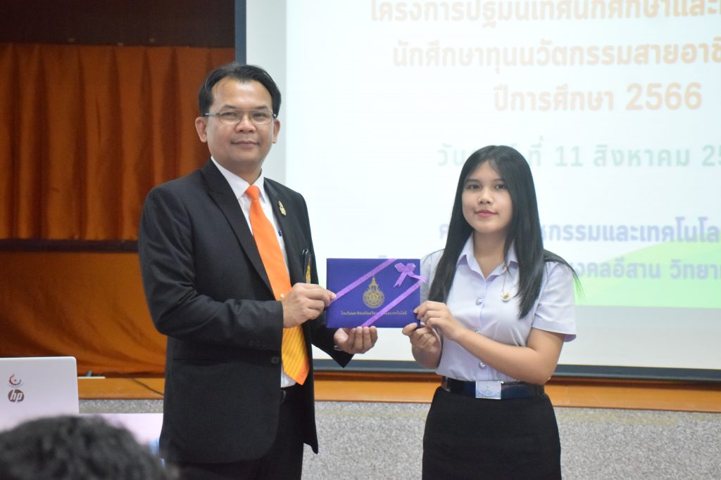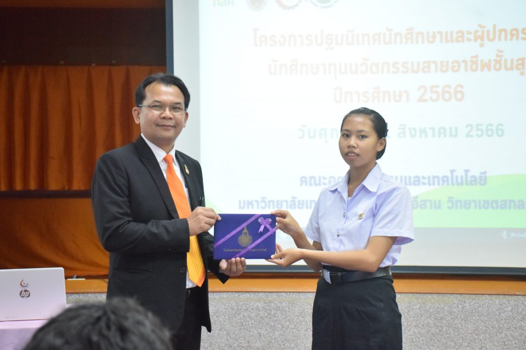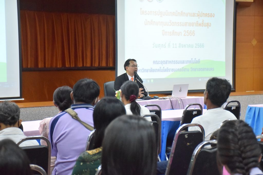 วันที่ 11 สิงหาคม 2566 คณะอุตสาหกรรมและเทคโนโลยี มทร.อีสาน วิทยาเขตสกลนคร จัดโครงการปฐมนิเทศนักศึกษาและผู้ปกครองนักศึกษาทุนนวัตกรรมสายอาชีพสูง กองทุนเพื่อความเสมอภาคทางการศึกษา (กสศ.) ประจำปี 2566 ณ ห้องประชุมค้ำคูณ 4 ชั้น 5 อาคารสำนักงานคณบดี เพื่อให้ผู้ปกครองและนักศึกษาได้รู้และเข้าใจถึงกฎระเบียบ ข้อบังคับของมหาวิทยาลัย การดูแลนักศึกษา การเตรียมความพร้อมในการศึกษา และการสร้างความสัมพันธ์ที่ดีระหว่างผู้ปกครองกับสถานศึกษา โดยได้รับเกียรติจาก อาจารย์จารุวัฒน์ ถาวรไพศาลชีวะ รองคณบดีฝ่ายพัฒนานักศึกษา อาจารย์ขอบคุณ ไชยวงศ์ หัวหน้าโรงเรียนสาธิตเตรียมวิศวกรรมและเทคโนโลยี คุณธัญพร ก้านเกศ เจ้าหน้าที่หารงานทั่วไป เป็นวิทยากร ในการนี้ ผศ.ดร.สุริยา แก้วอาษา คณบดีคณะอุตสาหกรรมและเทคโนโลยี ให้เกียรติเป็นประธานในพิธีเปิดโครงการ