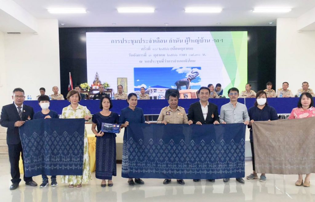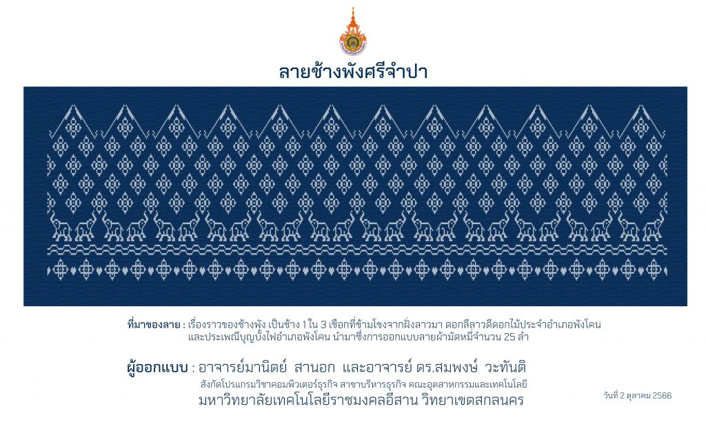 วันที่ 3 ตุลาคม 2566 ผศ.น.สพ.ดร.ชเวง สารคล่อง รองอธิการบดีประจำวิทยาเขตสกลนคร อาจารย์ ดร.มีแสน แก่นชูวงศ์ ผู้ช่วยคณบดีด้านบริการวิชาการและบ่มเพาะผู้ประกอบการ พร้อมด้วยคณาจารย์คณะอุตสาหกรรมและเทคโนโลยี เข้ามอบลายผ้ามัดหมี่ ชื่อลาย “ช้างพังศรีจำปา” ซึ่งเป็นลายอัตลักษณ์ประจำอำเภอพังโคน จังหวัดสกลนคร ให้แก่นายสมชาย จันทร์งาม นายอำเภอพังโคน โดยมีวัตถุประสงค์เพื่อนำไป ต่อยอดและพัฒนาผลิตภัณฑ์ที่เกี่ยวข้องให้กับชุมชนต่อไป โดยลายผ้าดังกล่าวเป็นผลงานงานออกแบบโดย อาจารย์มานิตย์ สานอก และอาจารย์ ดร.สมพงษ์ วะทันติ อาจารย์ประจำโปรแกรมวิชา คอมพิวเตอร์ธุรกิจ สาขาบริหารธุรกิจ คณะอุตสาหกรรมและเทคโนโลยี โดยการใช้แอพพลิเคชั่นออกแบบลายผ้าย้อมคราม จังหวัดสกลนคร ซึ่งเป็นผลงานวิจัยที่ได้รับการจดลิขสิทธิ์ประเภทโปรแกรมคอมพิวเตอร์