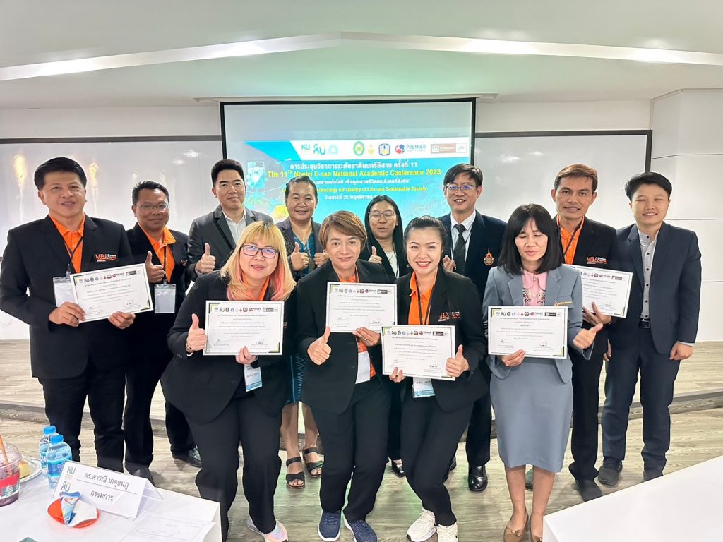 วันที่ 25 พฤศจิกายน 2566 คณาจารย์และนักศึกษา หลักสูตรบริหารธุรกิจมหาบัณฑิต (MBA) คณะอุตสาหกรรมและเทคโนโลยี มหาวิทยาลัยเทคโนโลยีราชมงคลอีสาน วิทยาเขตสกลนคร นำโดย ผศ.ดร.จักเรศ เมตตะธำรงค์ ประธานหลักสูตร ผศ.ดร.เพชรไพรริน อุปปิง ผศ.ดร.ชารินี ไชยชนะ และ ผศ.ดร.ชลีนุช คนซื่อ ได้เข้าร่วมประชุมวิชาการระดับชาตินนทรีอีสาน ครั้งที่ 11 “นวัตกรรม เทคโนโลยี และคุณภาพชีวิตและสังคมที่ยั่งยืน” ณ มหาวิทยาลัยเกษตรศาสตร์ วิทยาเขตเฉลิม พระเกียรติ จังหวัดสกลนคร โดยอาจารย์และนักศึกษาหลักสูตรบริหารธุรกิจมหาบัณฑิต ได้ส่งผลงานวิจัยเข้าร่วมนำเสนอผลงานวิจัยในครั้งนี้ จำนวน 7 ผลงาน