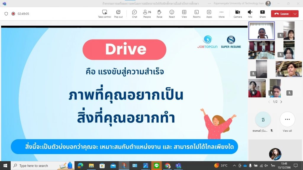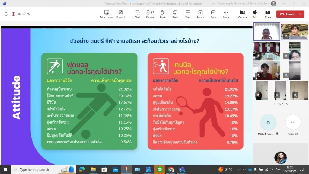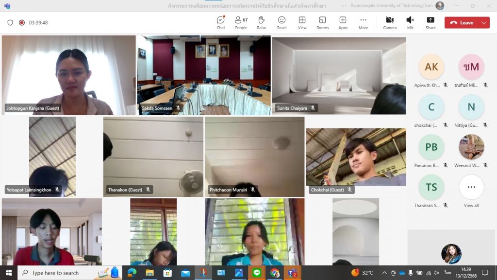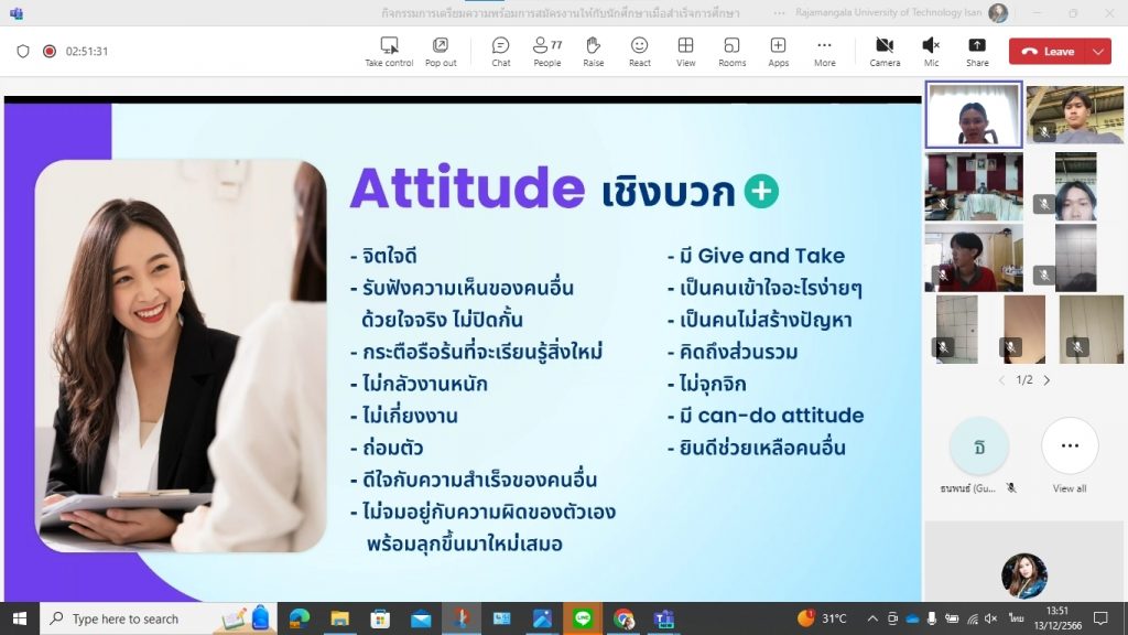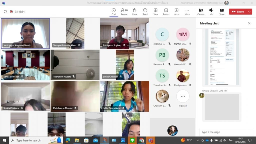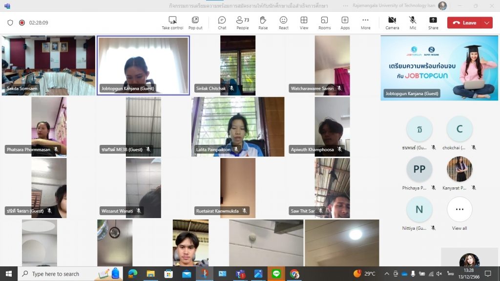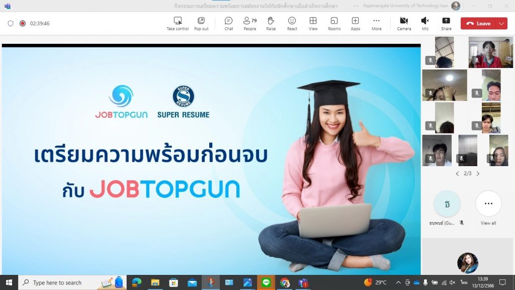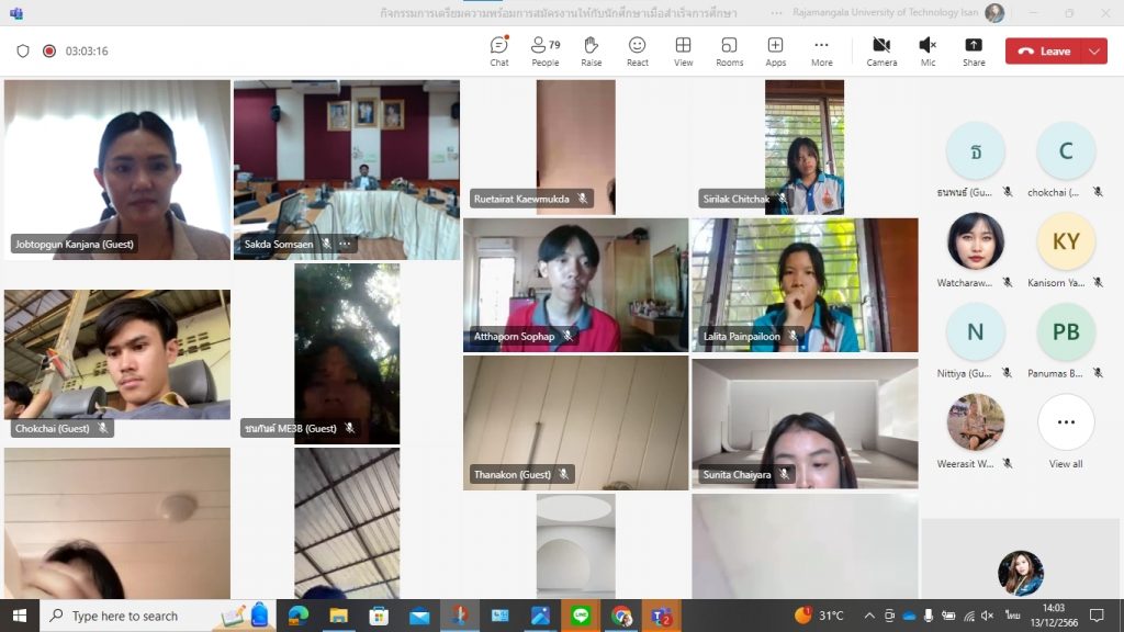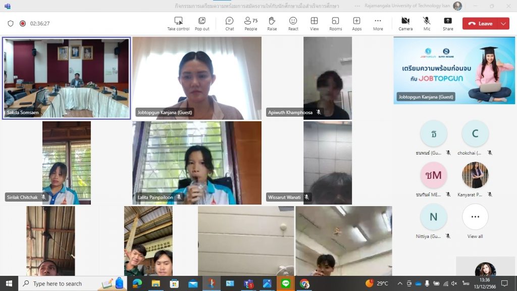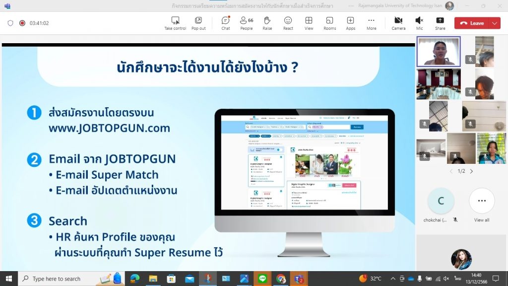 วันที่ 13 ธันวาคม 2566 คณะอุตสาหกรรมและเทคโนโนโลยี มทร.อีสาน วิทยาเขตสกลนคร จัดกิจกรรมการเตรียมความพร้อมการสมัครงานให้กับนักศึกษาเมื่อสำเร็จการศึกษา ผ่านระบบออนไลน์ Microsoft Teams โดยมีวัตถุประสงค์เพื่อให้ความรู้กับนักศึกษาในการเตรียมความพร้อมการสมัครงานกับสถานประกอบการ เป็นการเปิดโอกาสให้นักศึกษาได้ซักถามถึงข้อสงสัยเกี่ยวกับการสมัครงาน โดยได้รับเกียรติจากคุณปรัชญ์กวิน กิตติเลิศวีรกุล วิทยากรพิเศษจาก JOB TOPGUN บรรยายในหัวข้อ“เขียนรีซูเม่ให้ปัง จบใหม่ยังไงก็ได้งาน” ในการนี้ อาจารย์จารุวัฒน์ ถาวรไพศาลชีวะ รองคณบดีฝ่ายพัฒนานักศึกษา ให้เกียรติเป็นประธานในพิธีเปิดโครงการ