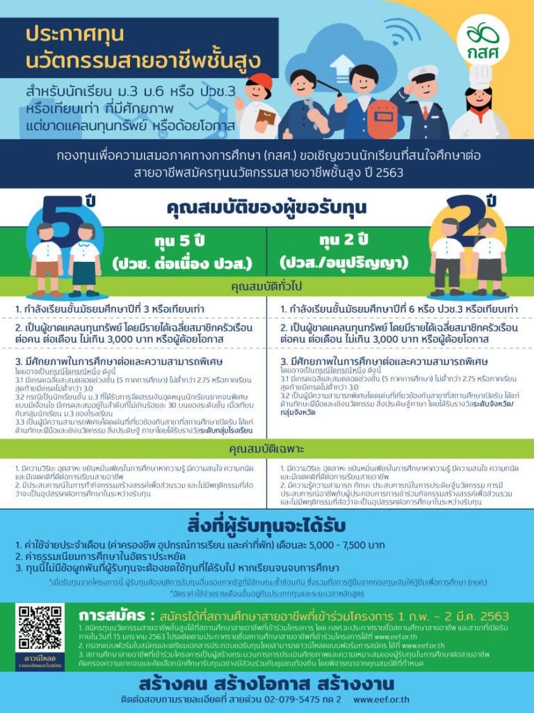 กสศ. ขอเชิญชวนนักเรียนที่กำลังศึกษาระดับชั้น ม.3 ม.6 ปวช.3 หรือเทียบเท่า ที่มีศักยภาพแต่ขาดแคลนทุนทรัพย์หรือด้อยโอกาสและสนใจเรียนต่อจนจบประกาศนียบัตรชั้นสูง (ปวส.) / อนุปริญญา สมัครทุนนวัตกรรมสายอาชีพชั้นสูง