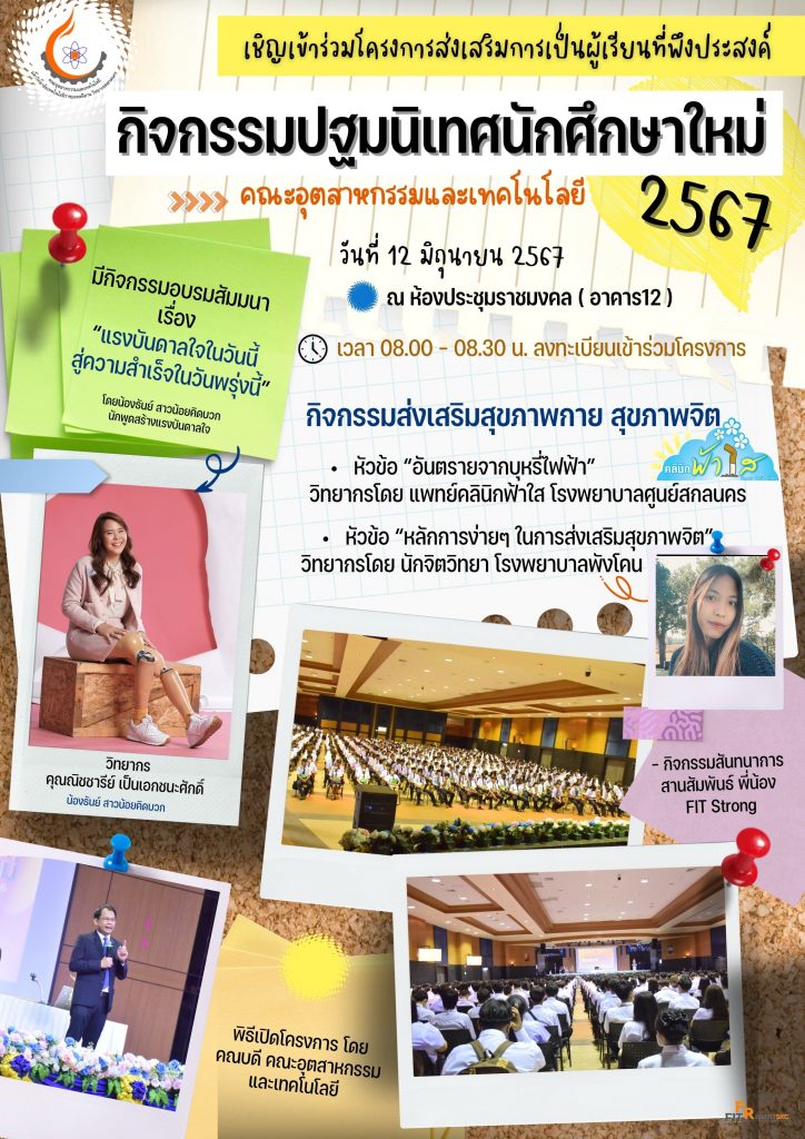 วันที่ 12 มิถุนายน 2567 ณ ห้องประชุมราชมงคล ( อาคาร12 ) เวลา 08.00 – 08.30 น. ลงทะเบียนเข้าร่วมโครงการ