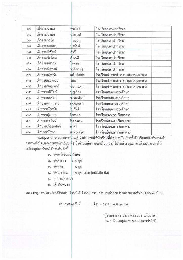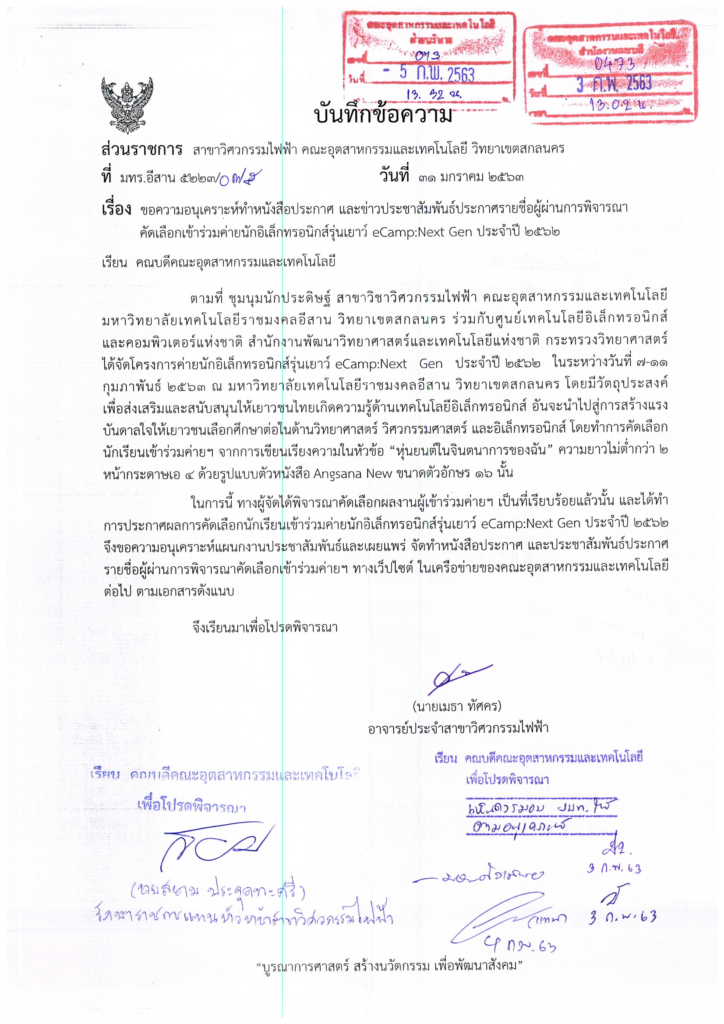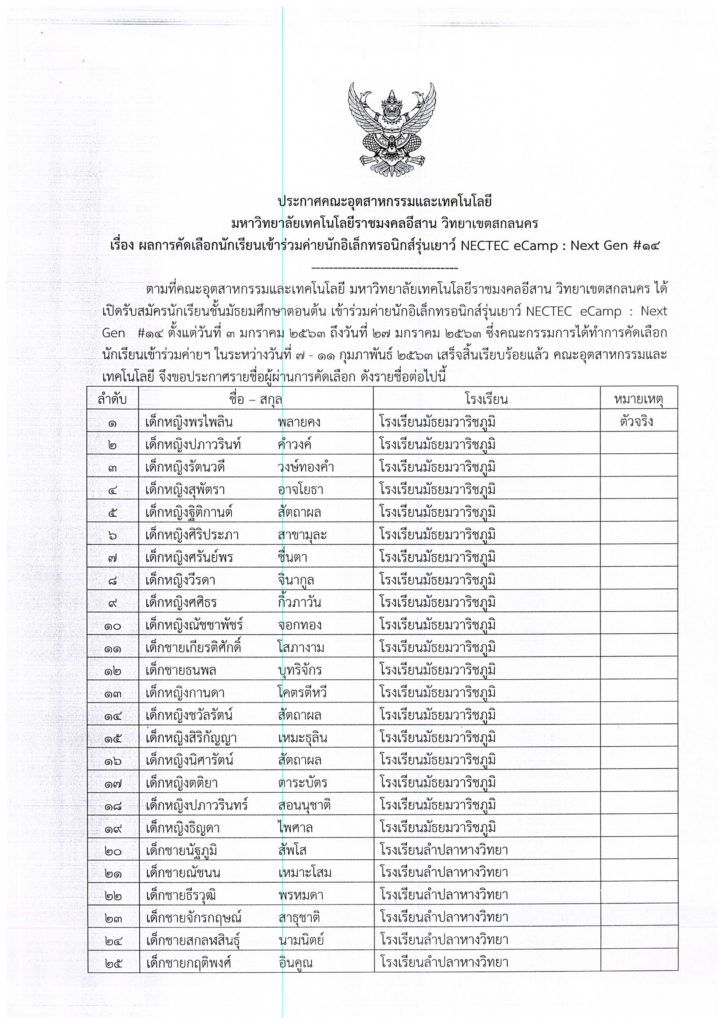 ประกาศผลการคัดเลือก นักเรียนเข้าค่ายนักอิเล็คทรอนิกส์รุ่นเยาว์ ชื่อผู้ผ่านการคัดเลือก เข้าค่าย E-camp 2563 NECTEC eCamp : Next gen #14 ระหว่างวันที่ 7-11 ก.พ. 2563 ณ คณะอุตสาหกรรมและเทคโนโลยี มทร.อีสาน วิทยาเขตสกลนคร