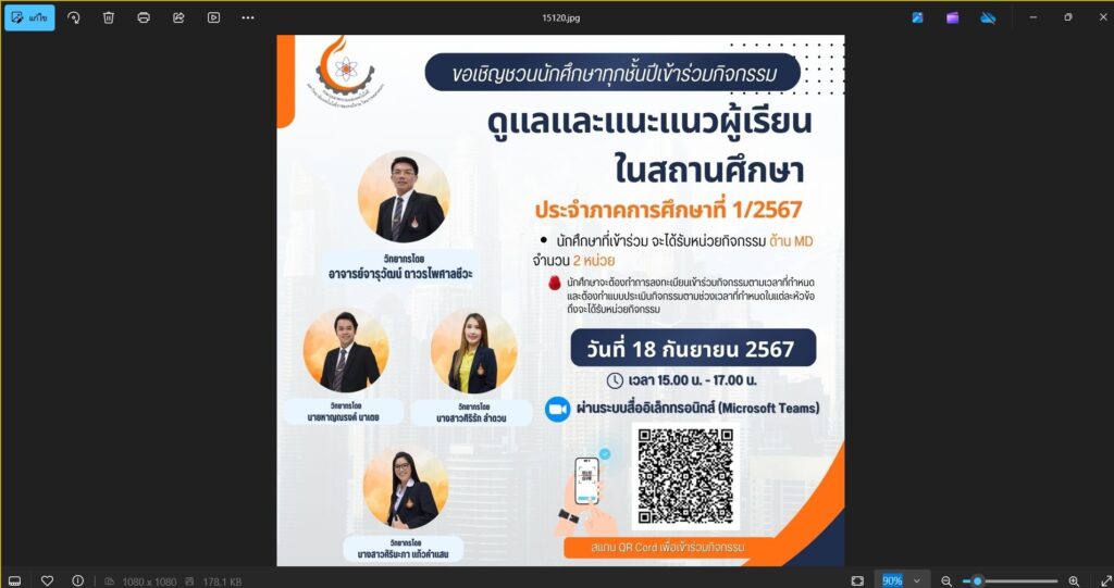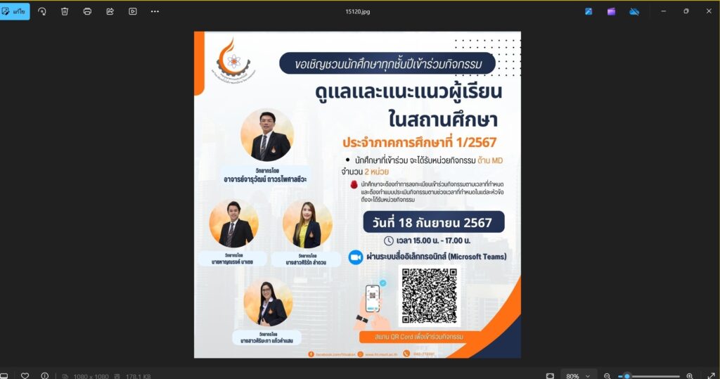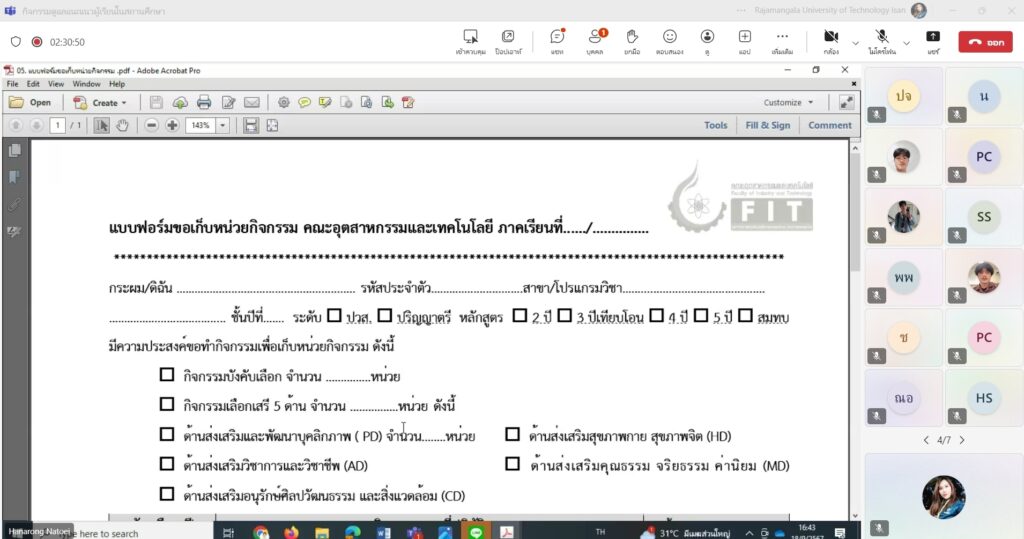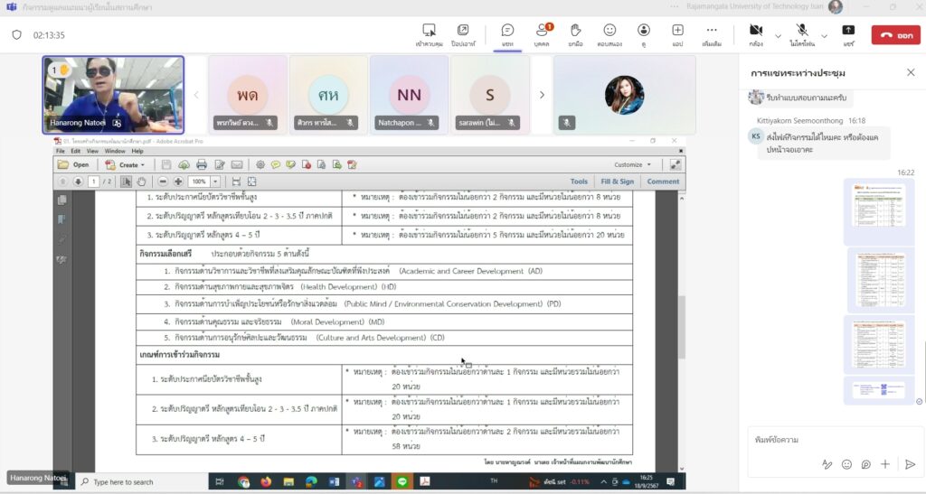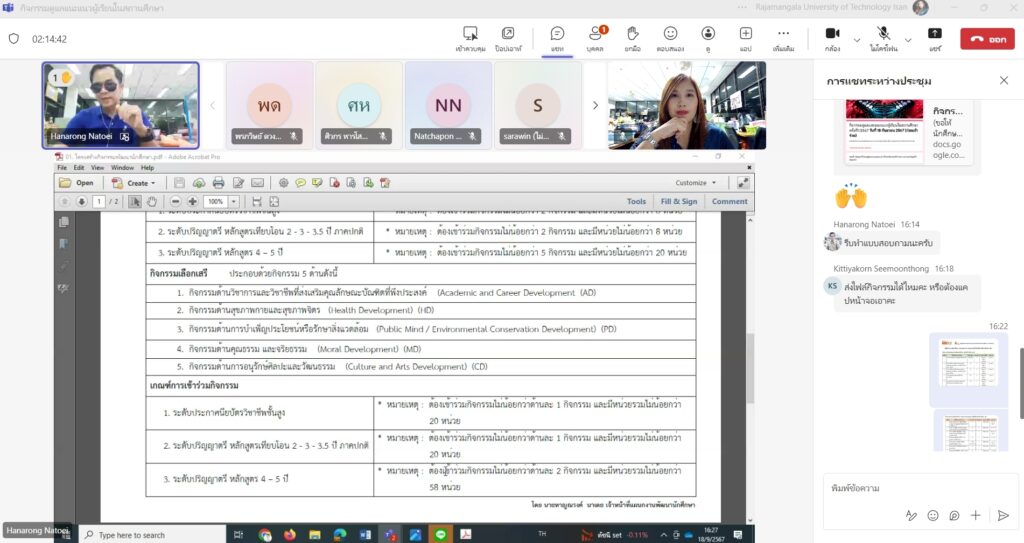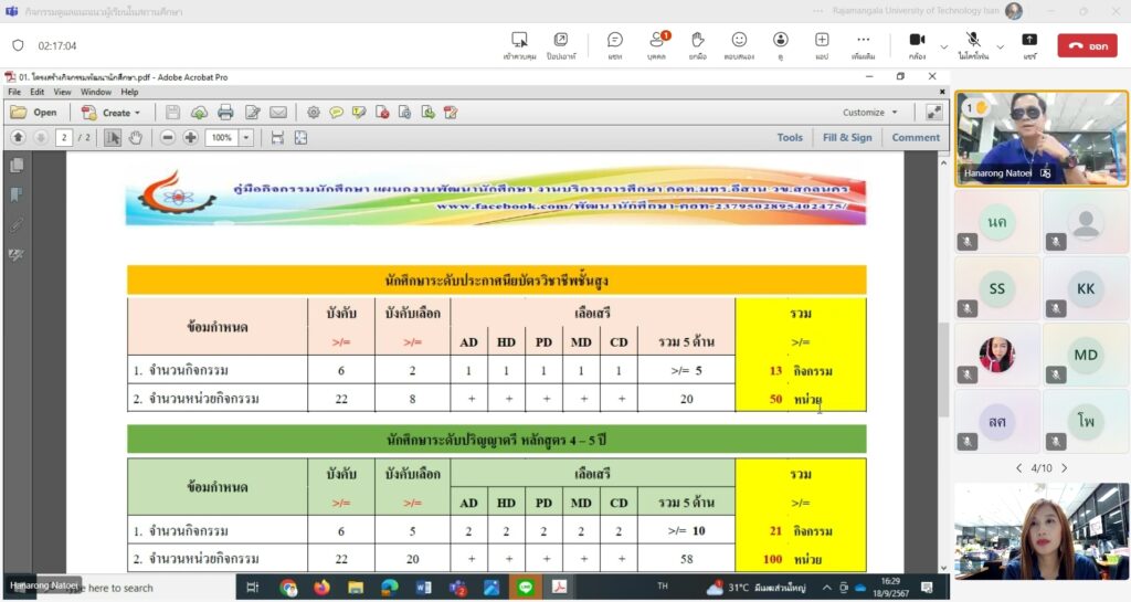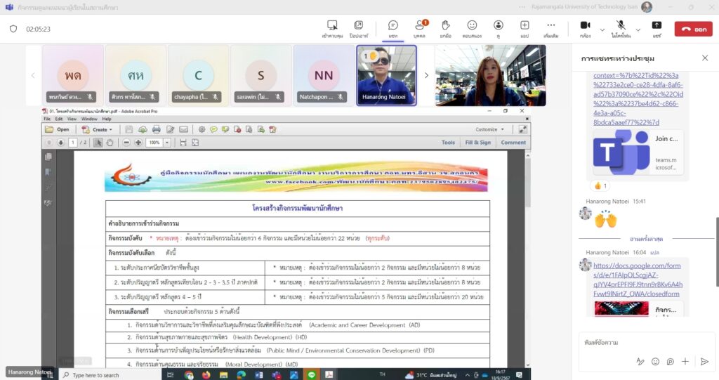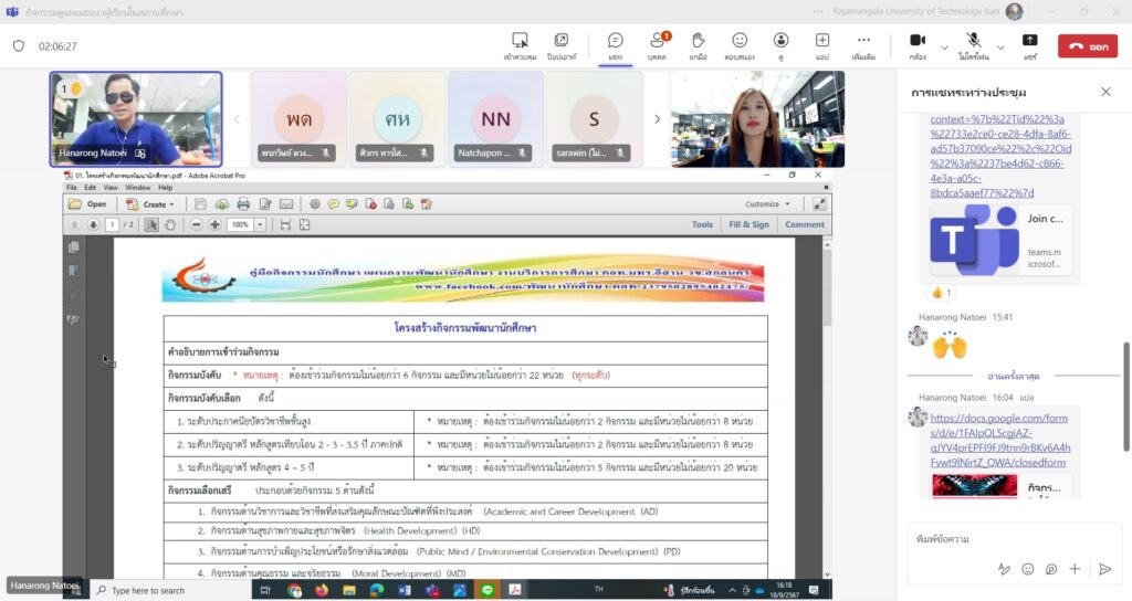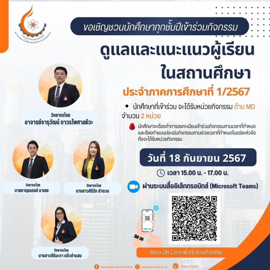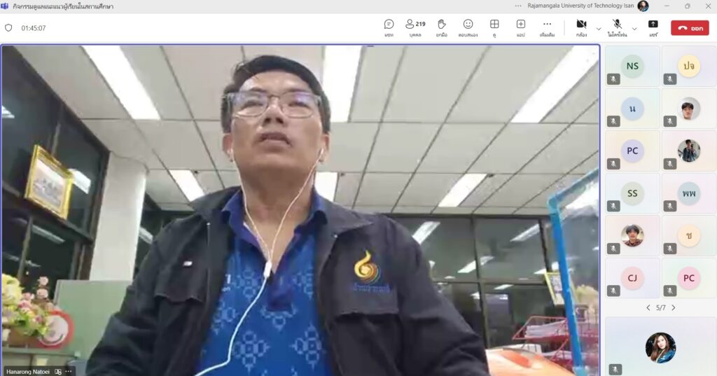 วันที่ 18 กันยายน 2567 คณะอุตสาหกรรมและเทคโนโลยี มหาวิทยาลัยเทคโนโลยีราชมงคลอีสาน วิทยาเขตสกลนคร จัดกิจกรรมดูแลและแนะแนวผู้เรียนในสถานศึกษาประจำภาคการศึกษาที่ 1 / 2567 ผ่านระบบสื่ออิเล็กทรอนิกส์ (Microsoft Teams) เพื่อให้คำปรึกษาและแนะแนวผู้เรียนในสถานศึกษา การแจ้งข้อมูลข่าวสารที่เป็นประโยชน์ต่อนักศึกษา ดูแลความประพฤติการปฎิบัติตนให้อยู่ในกฎระเบียบของมหาวิทยาลัย และช่วยสร้างความสัมพันธ์อันดีระหว่าง ผู้บริหาร อาจารย์และนักศึกษา ในการนี้ อาจารย์จารุวัฒน์ ถาวรไพศาลชีวะ รองคณบดีฝ่ายพัฒนานักศึกษา ให้เกียรติเป็นประธาน และเป็นวิทยากร โดยมีนักศึกษาคณะอุตสาหกรรมและเทคโนโลยี เข้าร่วมโครงการโดยพร้อมเพรียงกัน