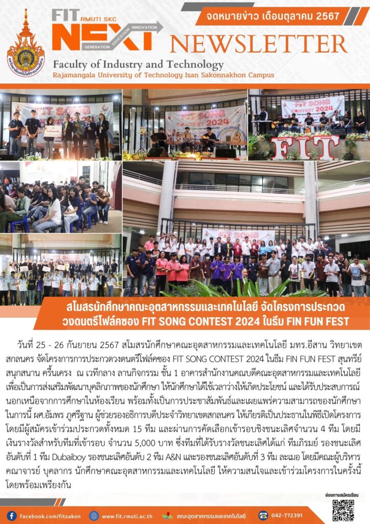 วันที่ 25 – 26 กันยายน 2567 สโมสรนักศึกษาคณะอุตสาหกรรมและเทคโนโลยี มทร.อีสาน วิทยาเขตสกลนคร จัดโครงการการประกวดวงดนตรีโฟล์คซอง FIT SONG CONTEST 2024 ในธีม FIN FUN FEST สุนทรีย์ สนุกสนาน ครื้นเครง ณ เวทีกลาง ลานกิจกรรม ชั้น 1 อาคารสำนักงานคณบดีคณะอุตสาหกรรมและเทคโนโลยี เพื่อเป็นการส่งเสริมพัฒนาบุคลิกภาพของนักศึกษา ให้นักศึกษาได้ใช้เวลาว่างให้เกิดประโยชน์ และได้รับประสบการณ์นอกเหนือจากการศึกษาในห้องเรียน พร้อมทั้งเป็นการประชาสัมพันธ์และเผยแพร่ความสามารถของนักศึกษา ในการนี้ ผศ.อัมพร ภูศรีฐาน ผู้ช่วยรองอธิการบดีประจำวิทยาเขตสกลนคร ให้เกียรติเป็นประธานในพิธีเปิดโครงการ โดยมีผู้สมัครเข้าร่วมประกวดทั้งหมด 15 ทีม และผ่านการคัดเลือกเข้ารอบชิงชนะเลิศจำนวน 4 ทีม โดยมีเงินรางวัลสำหรับทีมที่เข้ารอบ จำนวน 5,000 บาท ซึ่งทีมที่ได้รับรางวัลชนะเลิศได้แก่ ทีมภิรมย์ รองชนะเลิศอันดับที่ 1 ทีม Dubaiboy รองชนะเลิศอันดับ 2 ทีม A&N และรองชนะเลิศอันดับที่ 3 ทีม ละเมอ โดยมีคณะผู้บริหาร คณาจารย์ บุคลากร นักศึกษาคณะอุตสาหกรรมและเทคโนโลยี ให้ความสนใจและเข้าร่วมโครงการในครั้งนี้โดยพร้อมเพรียงกัน