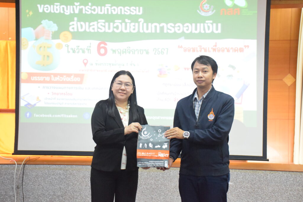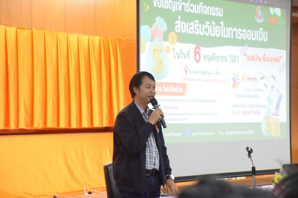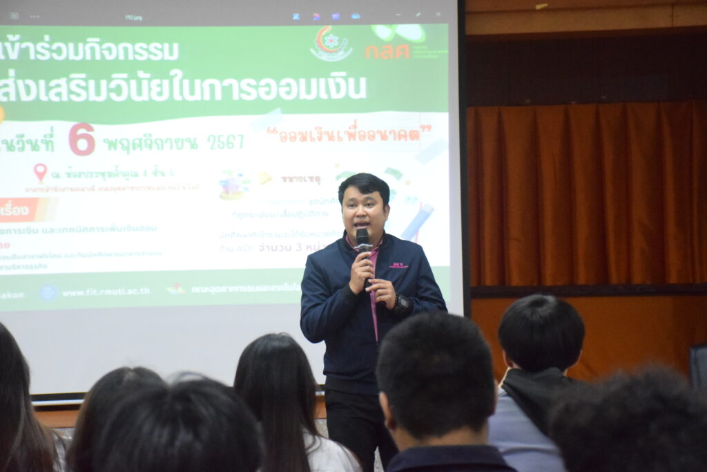 วันที่ 7 พฤศจิกายน 2567 คณะอุตสาหกรรมและเทคโนโลยี จัดกิจกรรมส่งเสริมการออมเงินให้กับนักศึกษาทุนนวัตกรรมสายอาชีพชั้นสูง กองทุนเพื่อความเสมอภาคทางการศึกษา (กสศ.) ณ ห้องประชุมค้ำคูณ 4 ชั้น 5 อาคารสำนักงานคณบดีคณะอุตสาหกรรมและเทคโนโลยี เพื่อส่งเสริมวินัยทางการเงิน ให้นักศึกษาได้เริ่มต้นการออมเงินและรู้จักการวางแผนการใช้เงินในระยะยาว โดยได้รับเกียรติจาก คุณเอกราช สุริยา พนักงานสนับสนุนธุรกิจ และคณะ จากหน่วยพัฒนาสังคมและชุมชน ธนาคารออมสิน ภาค 10 เป็นวิทยากร และ คุณพัชรภรณ์ กาติวงค์ ผู้จัดการศูนย์บัณฑิตนักปฏิบัติธนาคารจําลอง โปรแกรมวิชาการบัญชี สาขาบริหารธุรกิจ บรรยายให้ความรู้ในหัวข้อเรื่อง การวางแผนการเงินออม ในการนี้ ผศ. ดร.สัณหวัจน์ ทองแดง รองคณบดีฝ่ายแผนและประกันคุณภาพการศึกษา ให้เกียรติเป็นประธานในพิธีเปิดโครงการ
