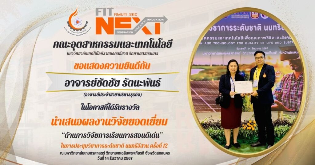 คณะอุตสาหกรรมเเละเทคโนโลยี ขอแสดงความยินดีกับ อาจารย์ชัดชัย รัตนะพันธ์ (อาจารย์ประจำสาขาบริหารธุรกิจ) ในโอกาสที่ได้รับรางวัล นำเสนอผลงานวิจัยยอดเยี่ยม “ด้านการวิจัยการเรียนการสอนดีเด่น” ในการประชุมวิชาการระดับชาติ นนทรีอีสาน ครั้งที่ 12 ณ มหาวิทยาลัยเกษตรศาสตร์ วิทยาเขตเฉลิมพระเกียรติ จังหวัดสกลนครวันที่ 14 ธันวาคม 2567