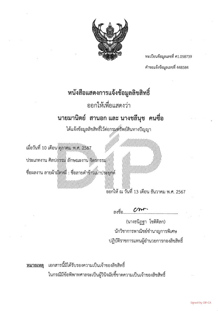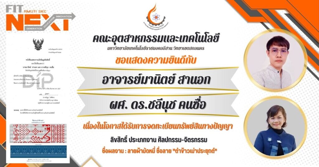 คณะอุตสาหกรรมและเทคโนโลยี ขอแสดงความยินดีกับ อาจารย์มานิตย์ สานอก และ ผศ. ดร.ชลีนุช คนซื่อ (อาจารย์ประจำสาขาบริหารธุรกิจ) เนื่องในโอกาสได้รับการจดทะเบียนทรัพย์สินทางปัญญา ลิขสิทธิ์ ประเภทงาน ศิลปกรรม-จิตรกรรม ชื่อผลงาน : ลายผ้ามัดหมี่ ชื่อลาย “ตำข้าวเม่าประยุกต์”
